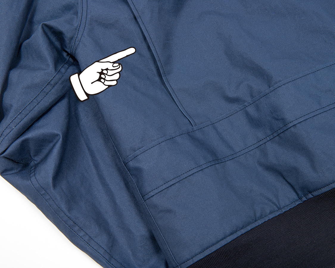 ウェストはある程度フィットさせたうえで、腕を前に出したときに突っ張らないようにという仕様。