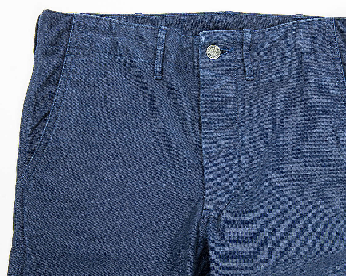 フロントはシンプルなトラウザーズ型。あえて、コインポケットはつけていません。どうしても、コインポケットの袋布がごわつくためです。