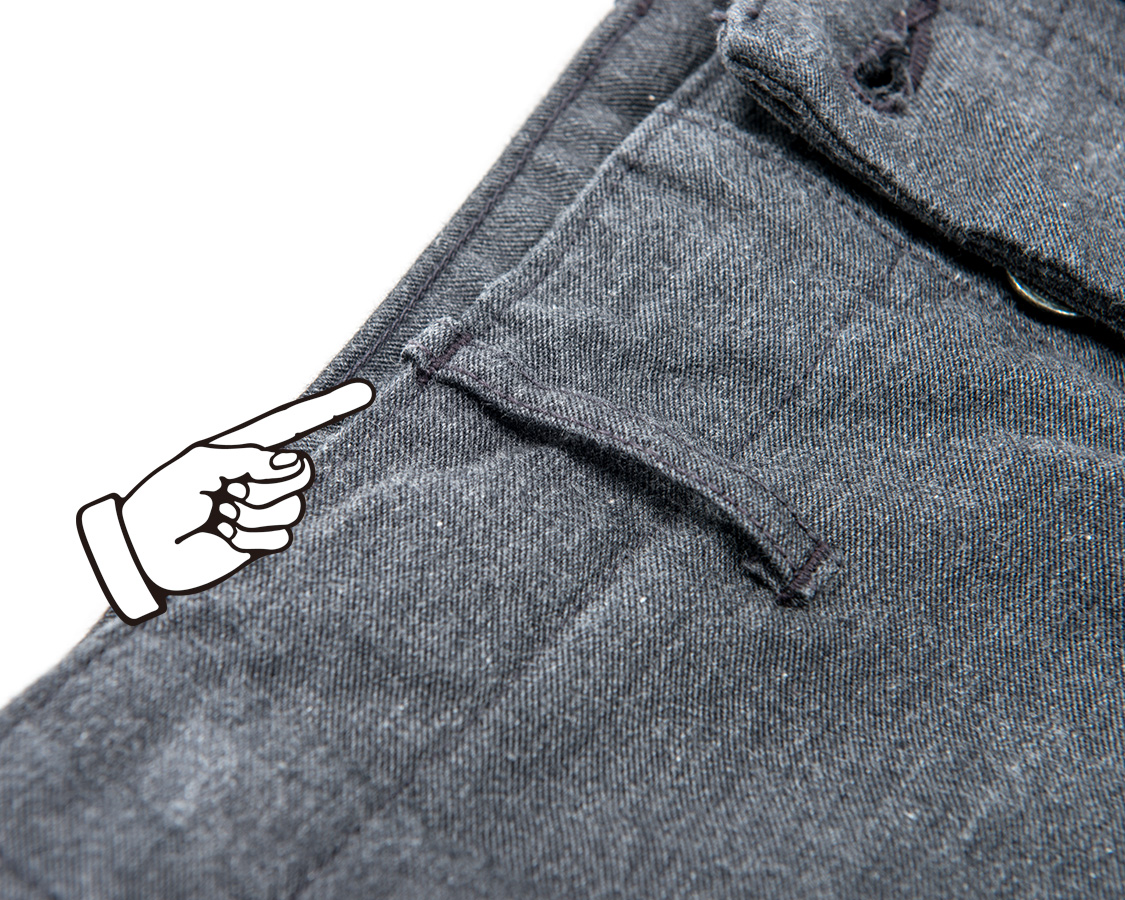 現代では、ループを切って・折って・カン止めする「オートベルター」がある為普通であれば避けられる仕様。それをあえて取り入れてクラシカルなトラウザーらしさを強調しています。 |