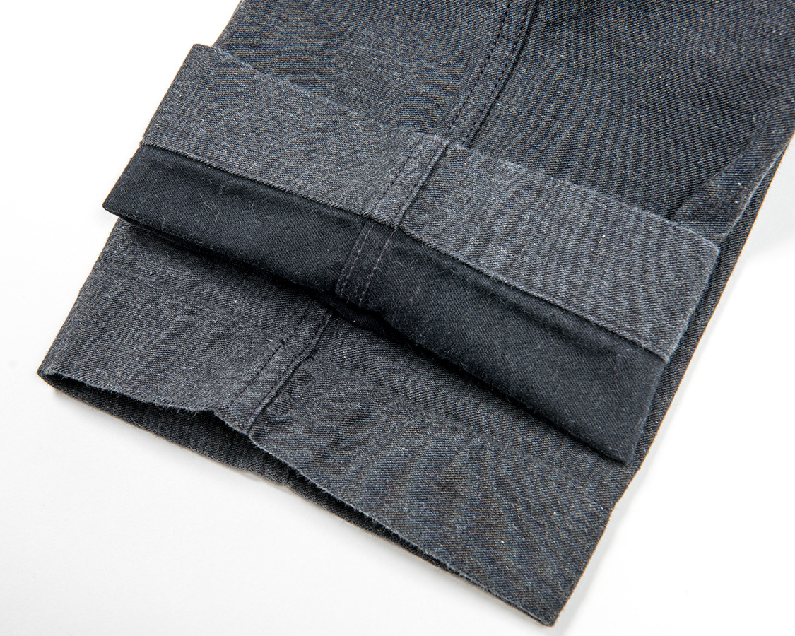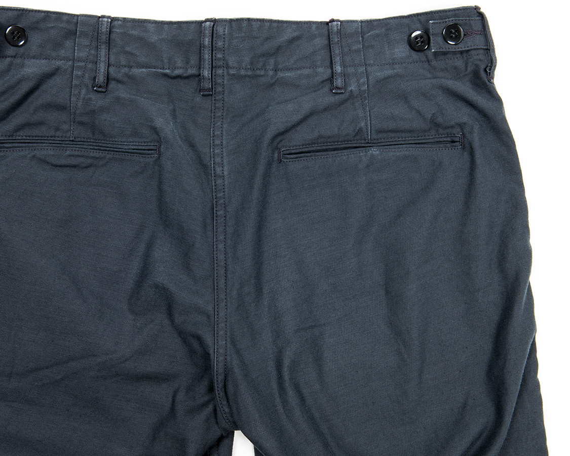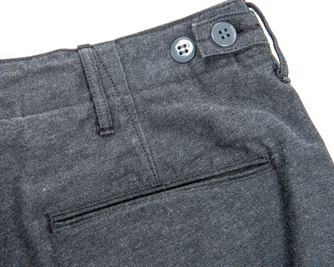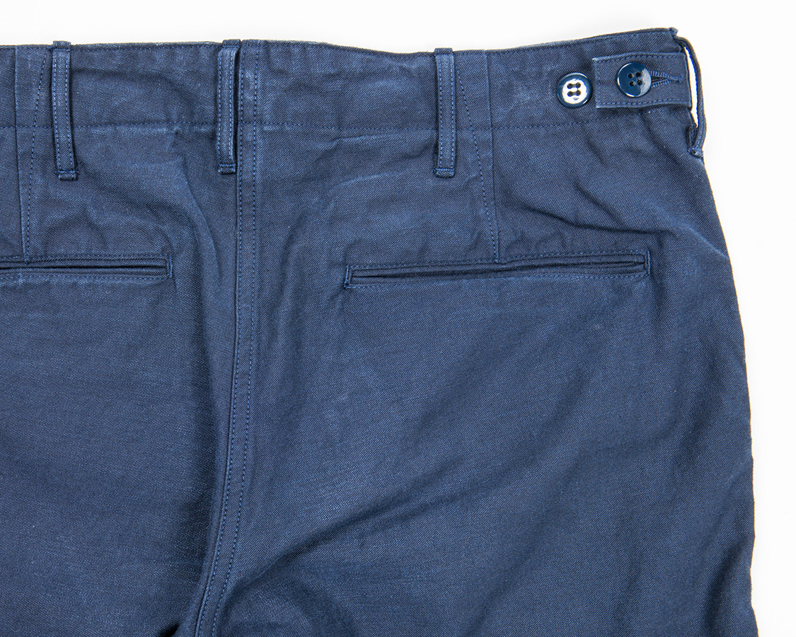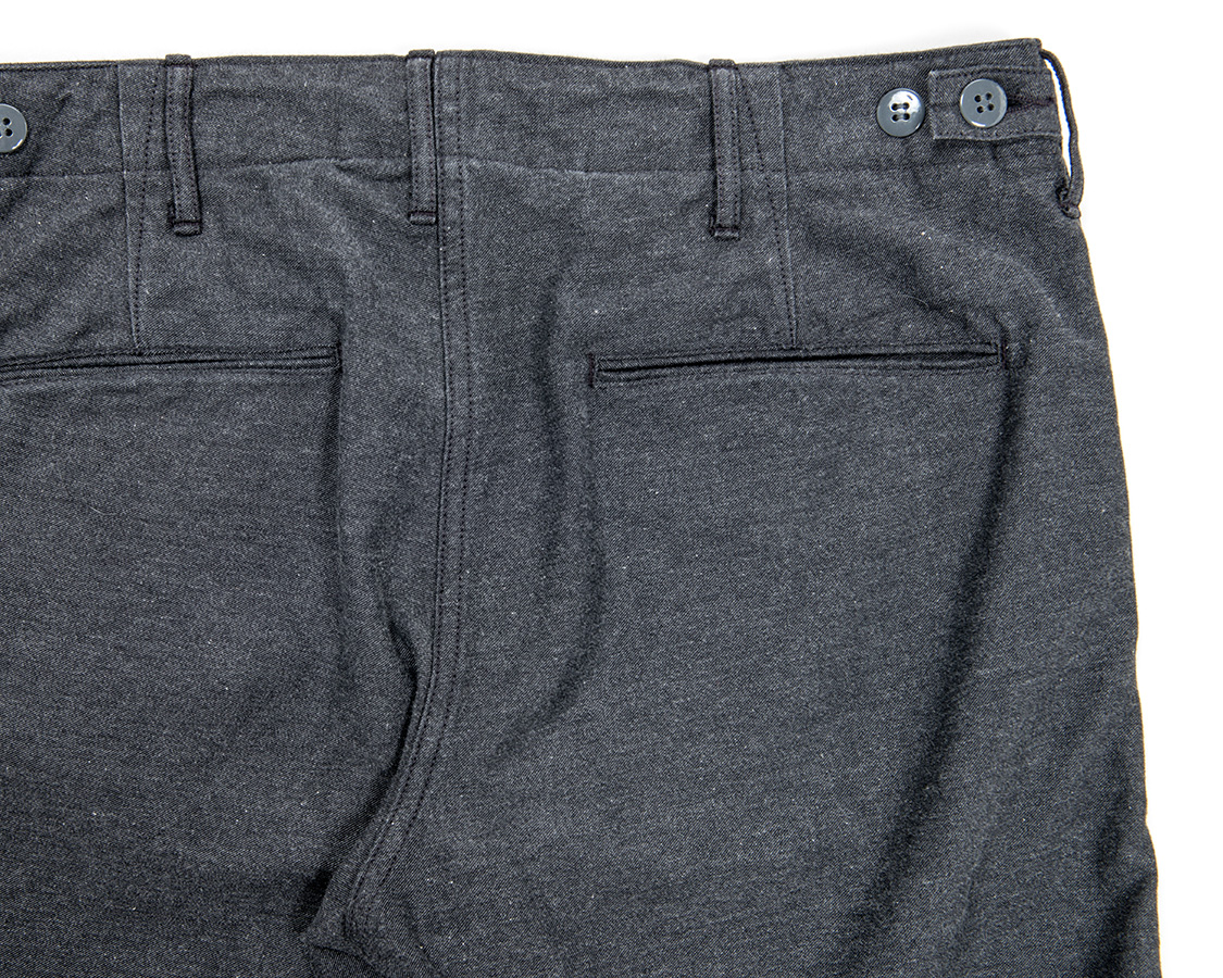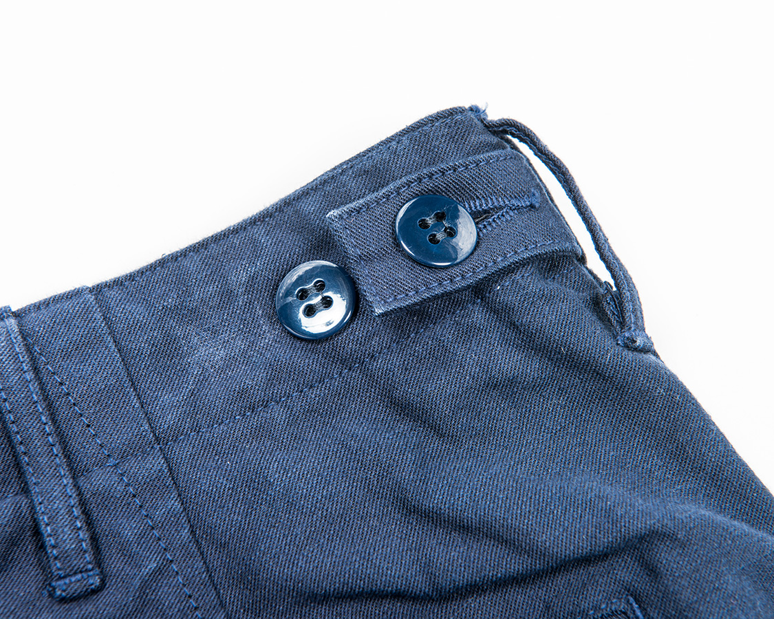 ウェストにはタブをつけてサイズ調節ができるように。ここはベルトをするときもあるので、厚みが無い、薄い四つ穴ボタンにしています。