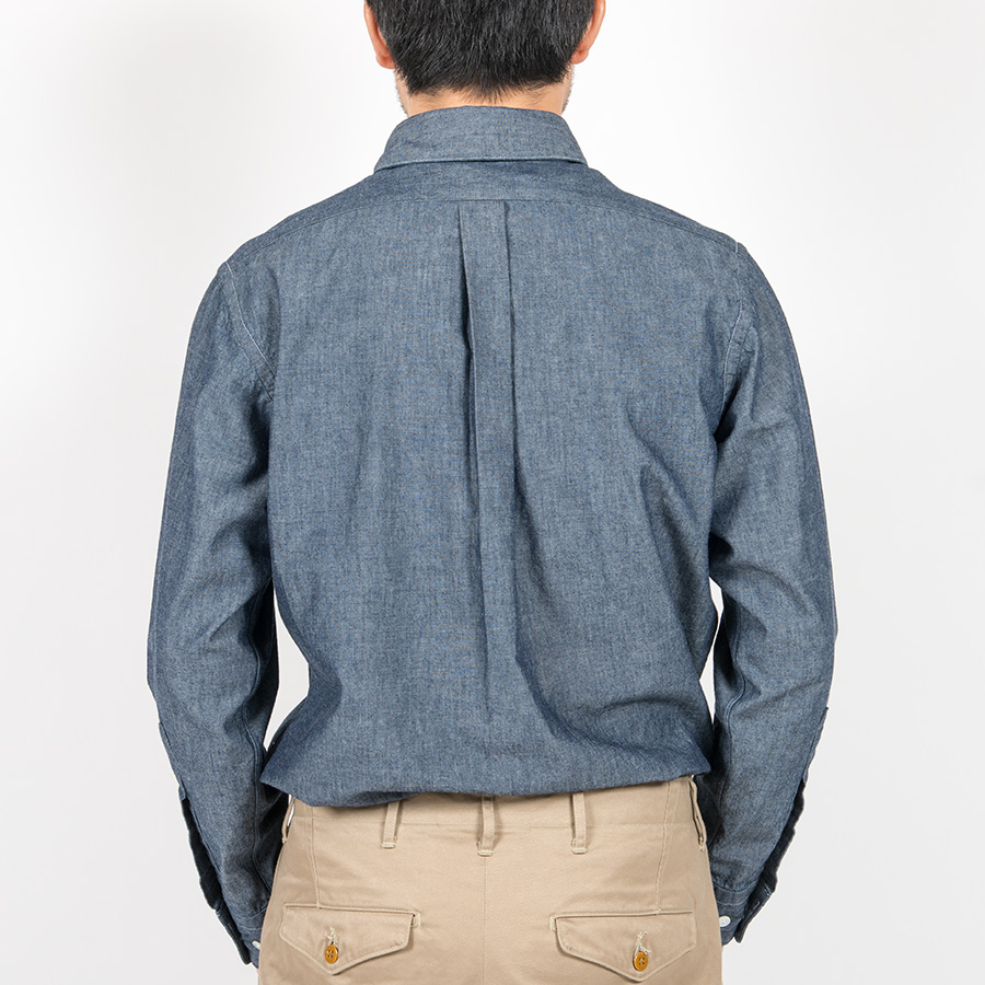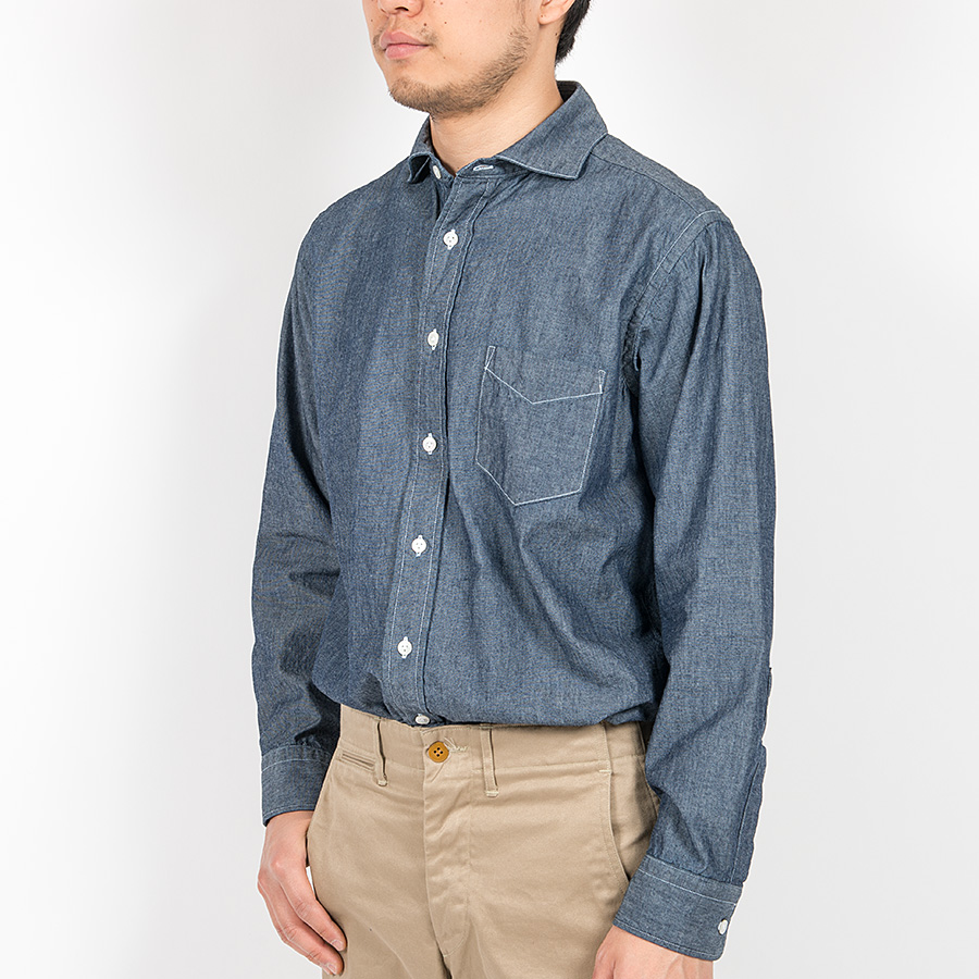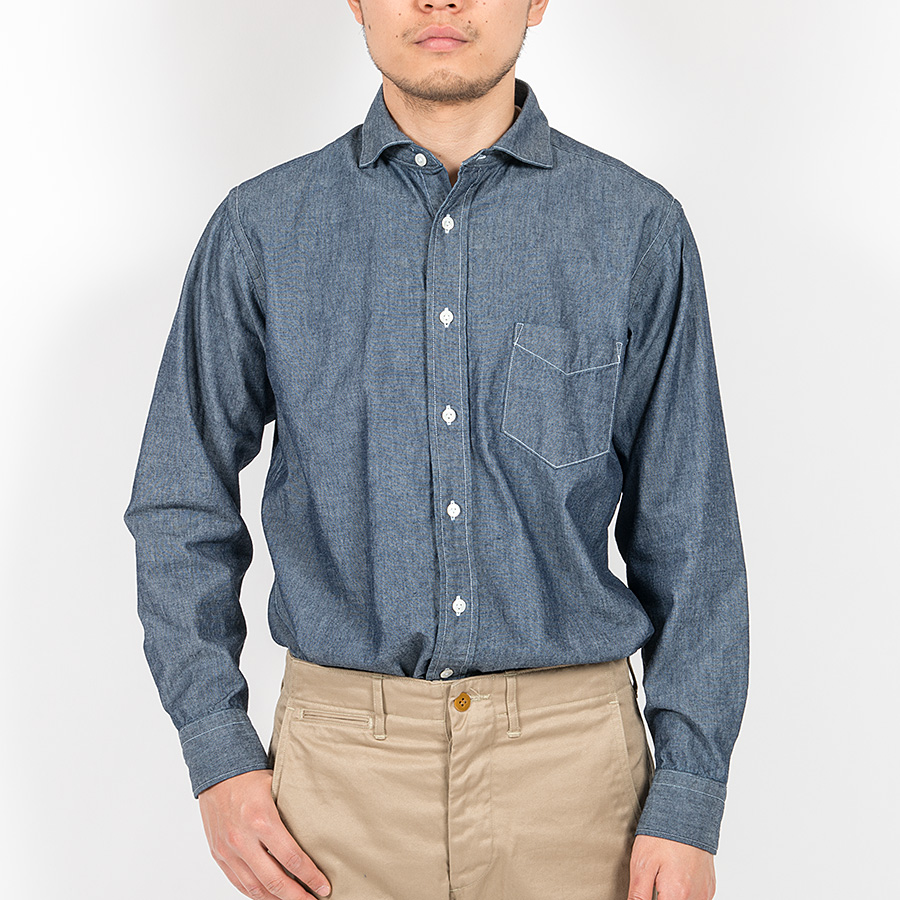 秋冬はシャンブレーを追加。ドレス的な表情・縫製のシャツにあえてタフな素材でミスマッチを。同じブルーシャンブレーでも、定番で使っているブルーよりも一段濃い、落ち着いたブルーを。