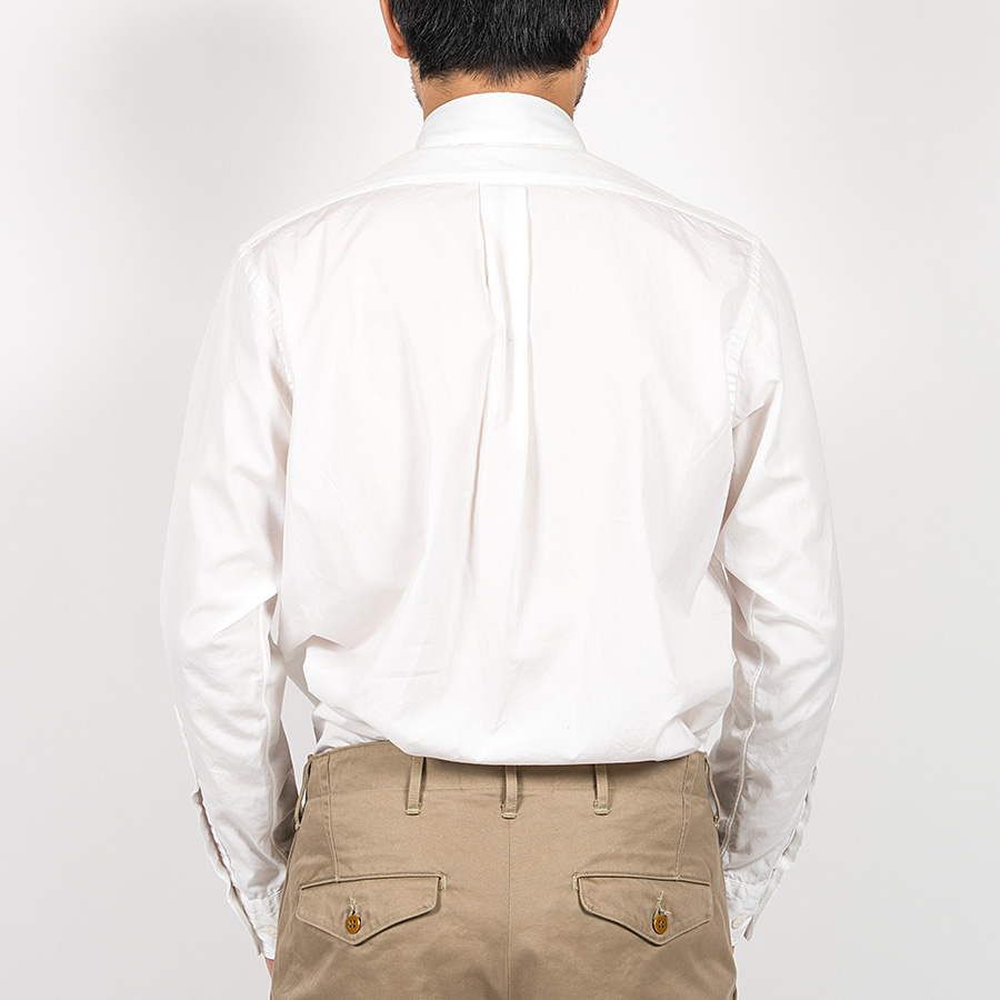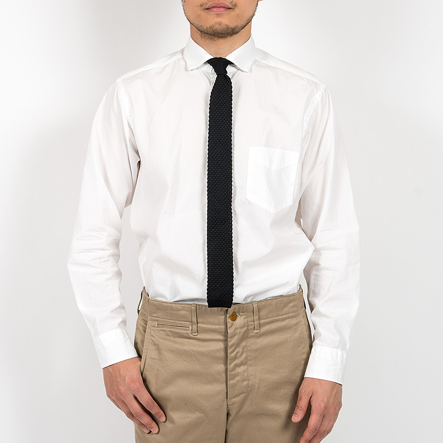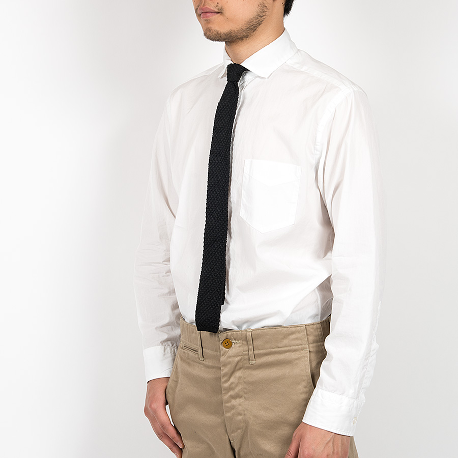 イメージは古着で見たBrooksやHathaway、Arrowなどがデッドストックであれば・・・といった物。シルエットは今期のBDで言うとModifiedに相当する、現代的なフィット感、肘巾は細め。さらにWORKERSではニットタイを作っています。ネクタイに合わせるシャツと言えばBDと並んでワイドスプレッド。ホワイトのブロードシャツにブラックやネイビーのニットタイ。下はジーンズでもチノでも。シャツ1枚に、はずしでファティーグパンツやベーカーパンツを合わせても。今シーズンはブラウン・グレイといったニットタイもラインナップしたので、シャツのベース色を変えてコーディネートも楽しめます。