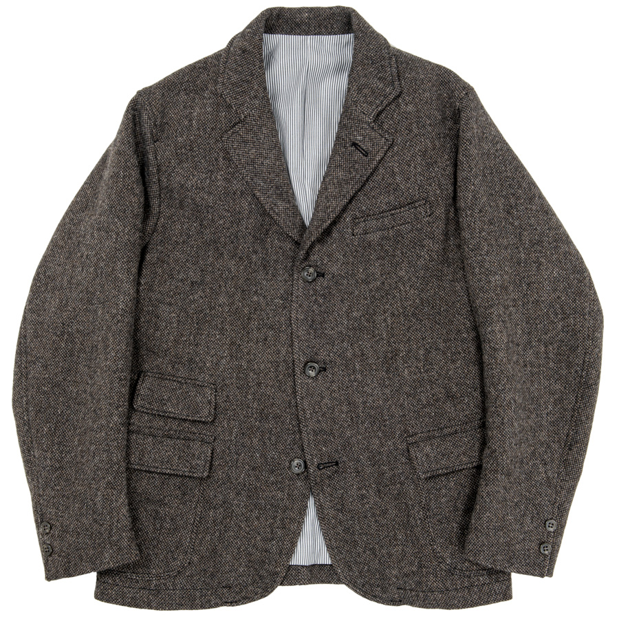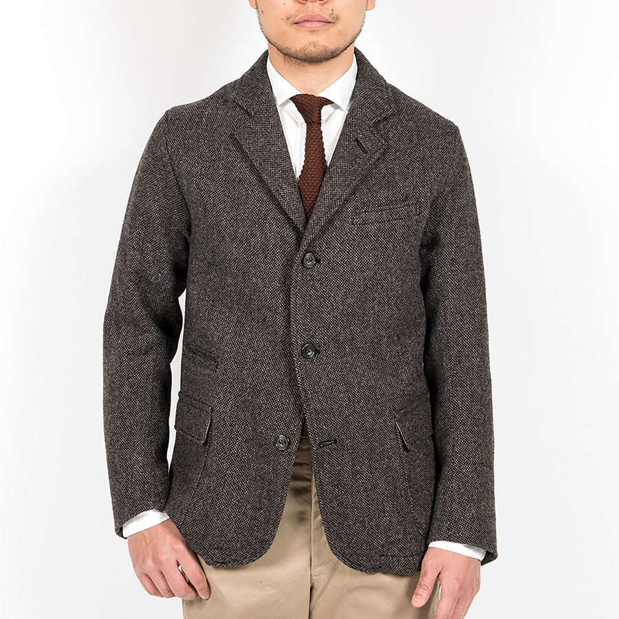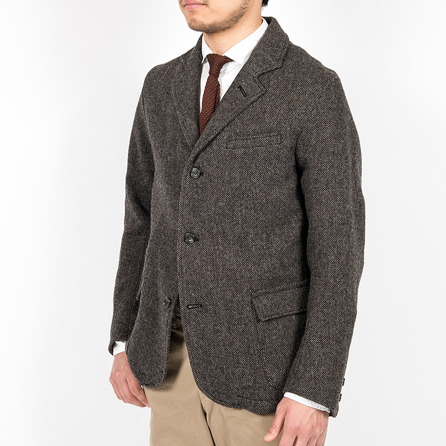 毎年、使いたい素材が多く悩むのがウールジャケット。今までヘリンボンを多く作ってきたので、今年はホームスパンを作ってみました。本来は家庭手紬で作られた糸を使って織られた生地を指しますが、現代では紡毛糸を使いざっくりした平織の総称として使われているため、便宜上「ホームスパン」と呼びます。ヨコ糸をブラック、タテ糸にグレー・ブラウンの色糸。ブラック×色糸により色のトーンが落ち着いています。また、ヘリンボンよりも柄として見えづらいので、マットな見え方。8番とかなり太めの糸、今年も英国羊毛を50%混ぜた糸を使っています。 |