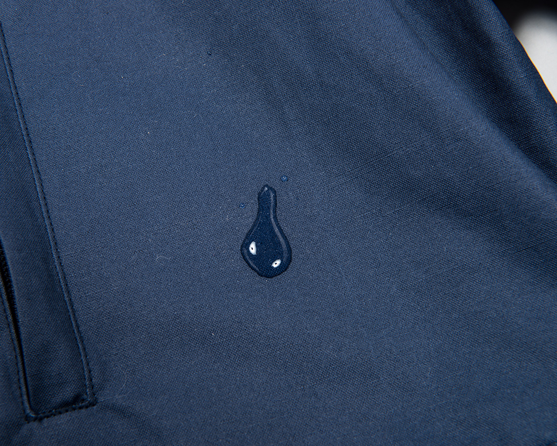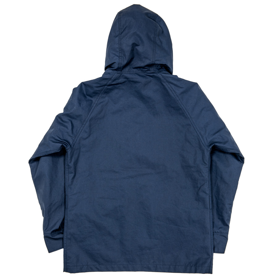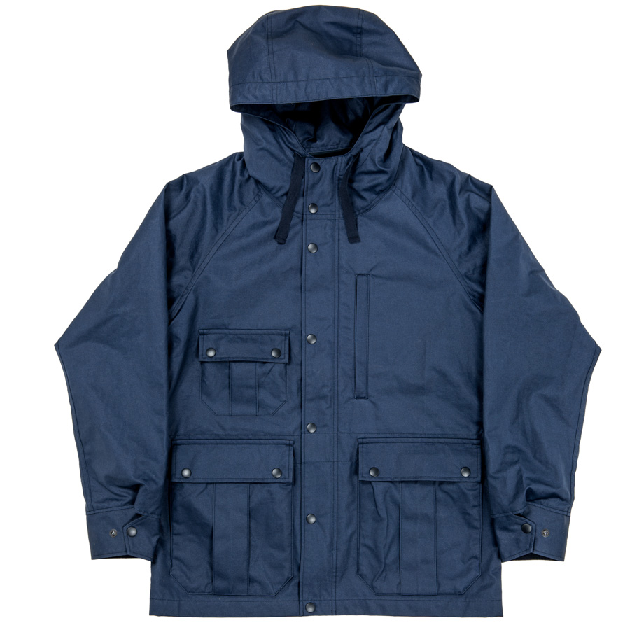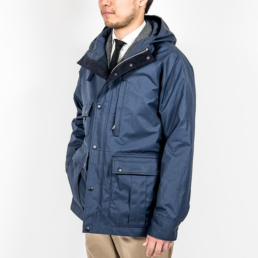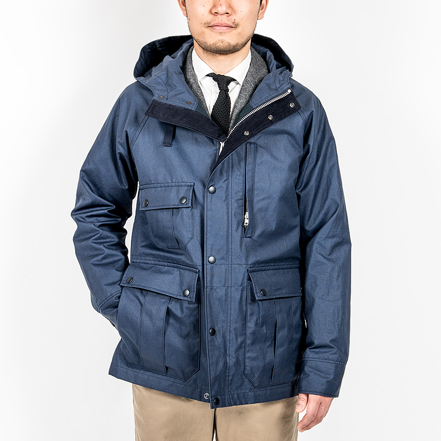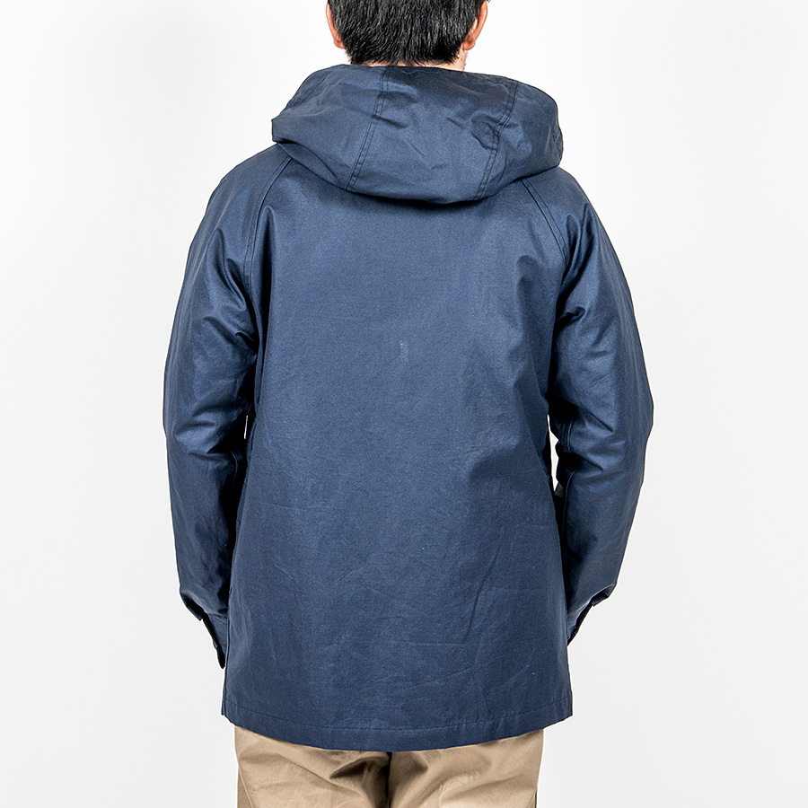 ネイビー、表生地はDeckTankerと同じコーティングキャンバス。マウンテンパーカーの企画が先にあり「厚みのある撥水性素材」を開発するためコーティングキャンバスが完成しました。コーティングの洗濯耐性は30回ほど。ベロっとはいきませんが、徐々にコーティングは薄くなっていきます。また、コーティング部分がこすれると若干白みがかった跡もつきます。パラフィンダックのように、経年変化と思い楽しんでいただければ。