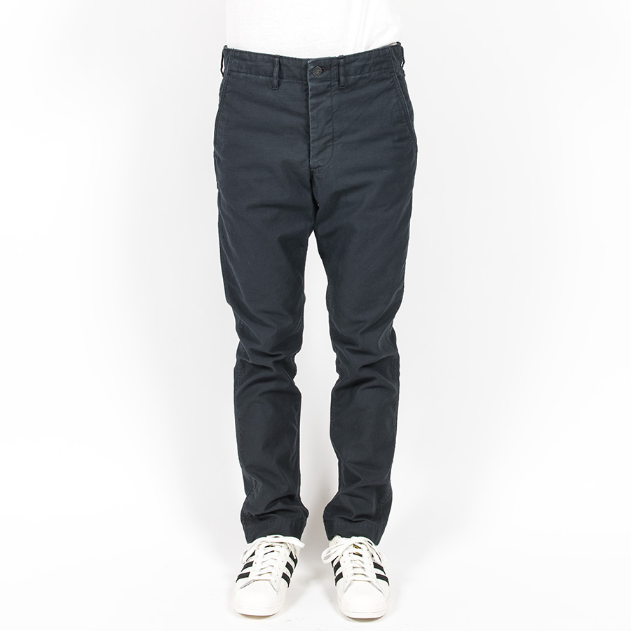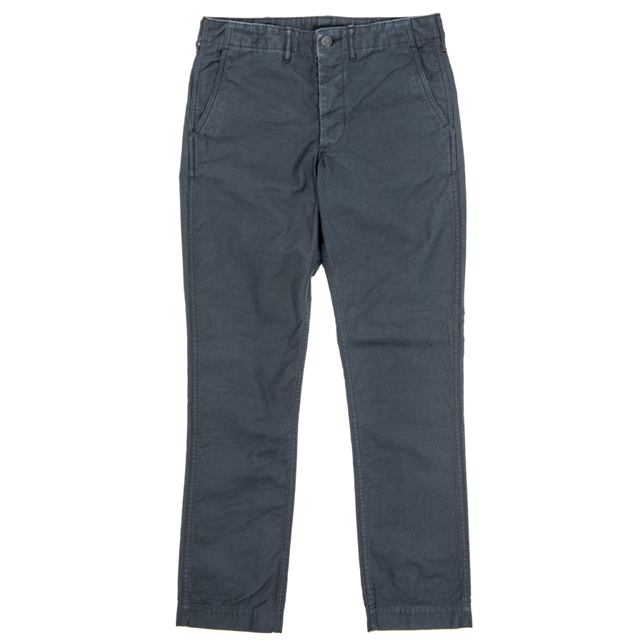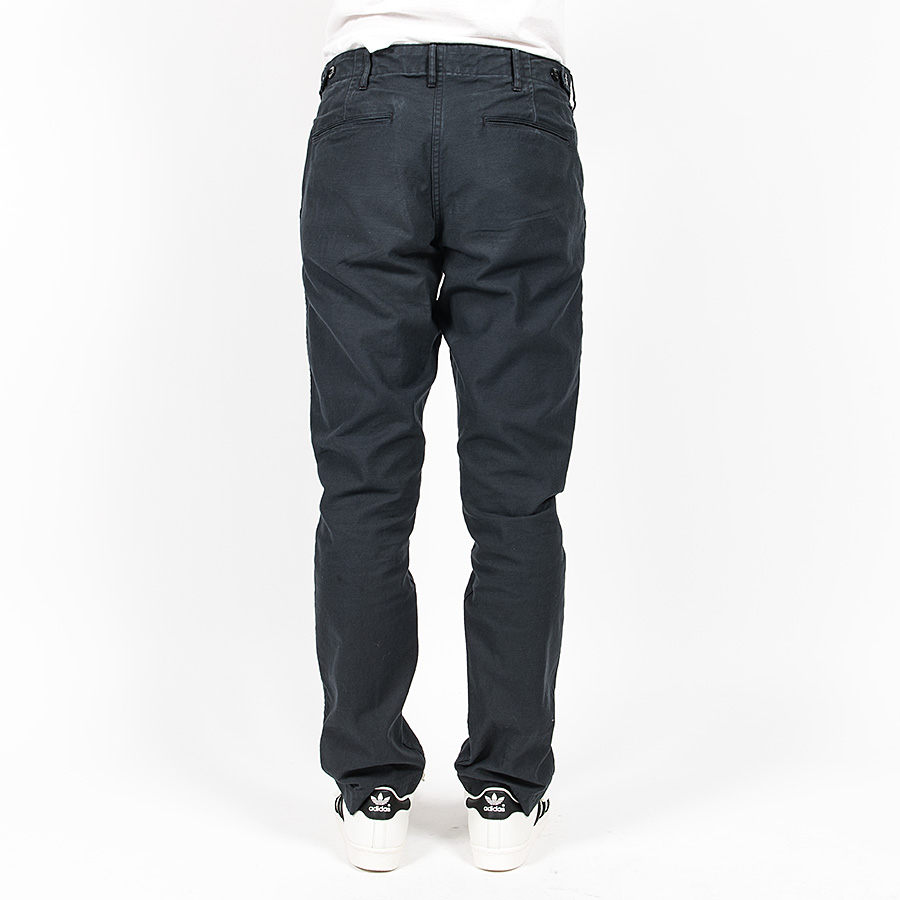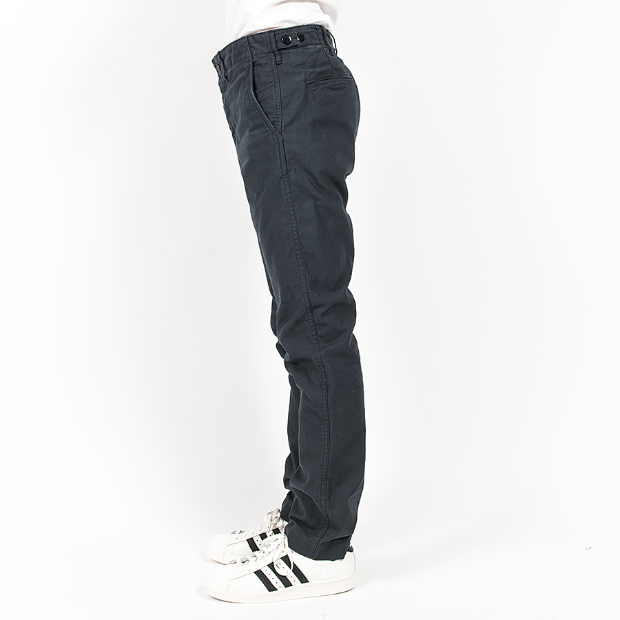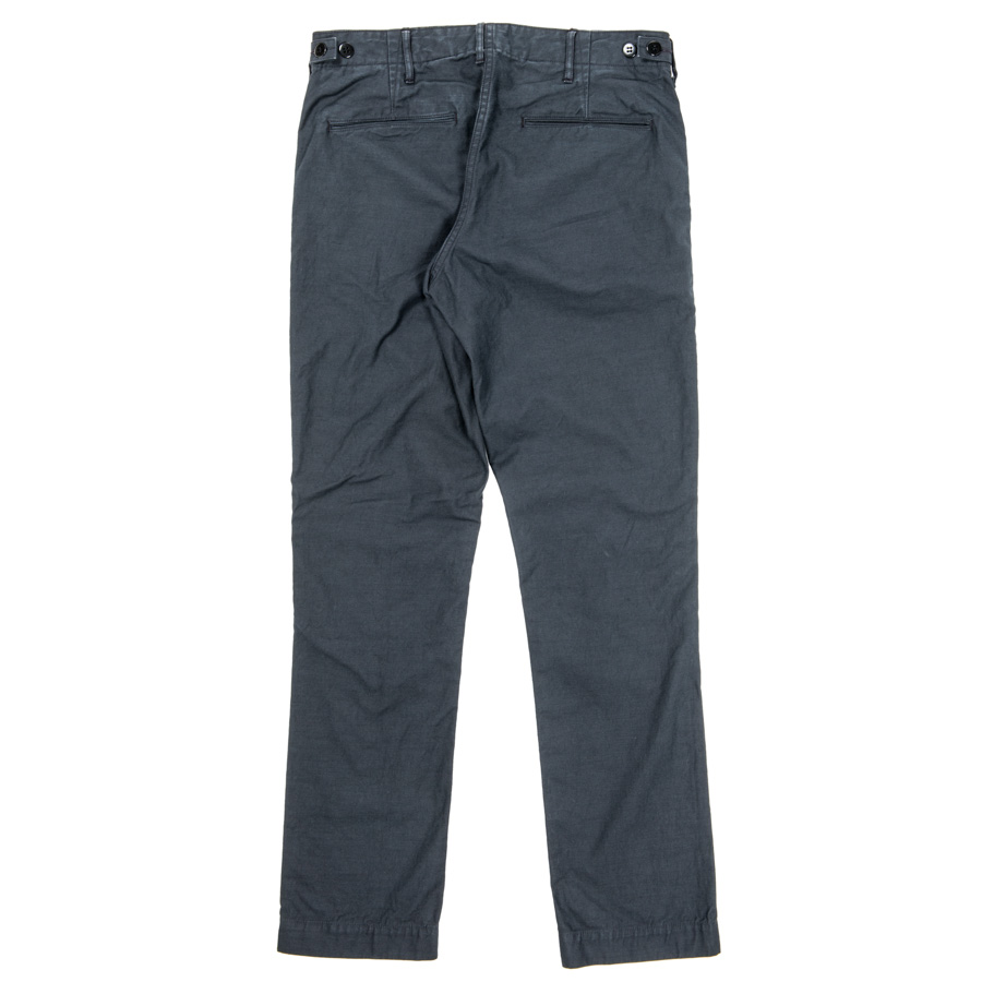 形はベーシックな細みのトラウザー型。「ユーティリティ」であるため、フロントボタンは打ち込みで強度を高めます。さらに、ウェストにはミリタリートラウザーズでおなじみ、サイズ微調節用のタブを。ここは糸付ボタンにして、ベルトをしてもボタンの厚みでウェストが痛くないように。フロントのコインポケットはオミット。細みのトラウザーズなのでウェスト周りに厚みを出したくなかったためです。製品はOW済です。 |