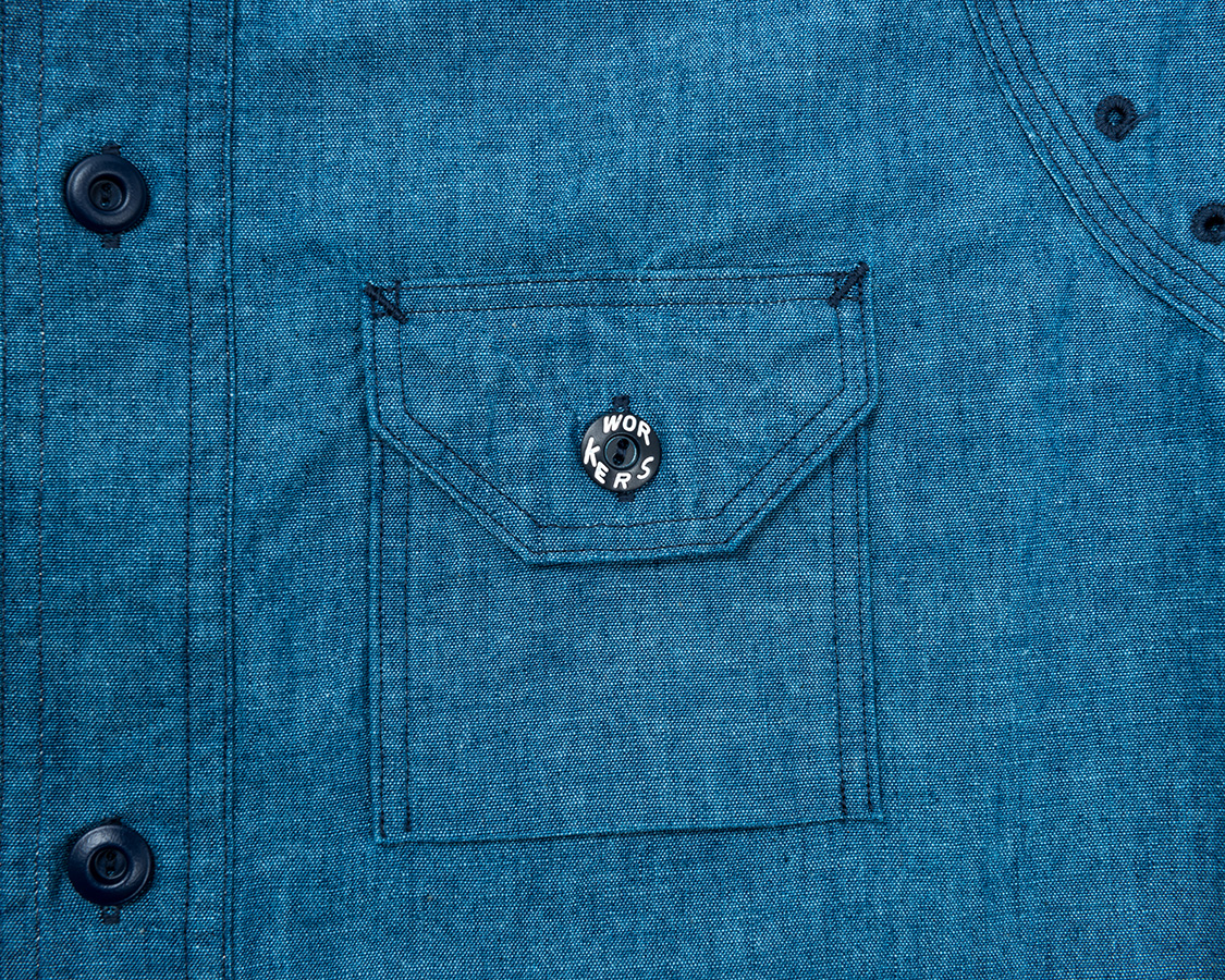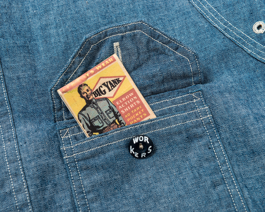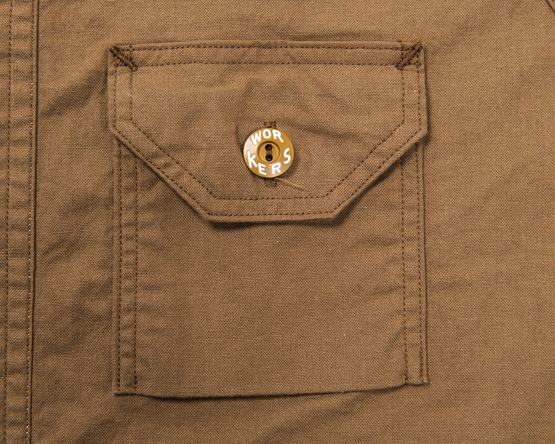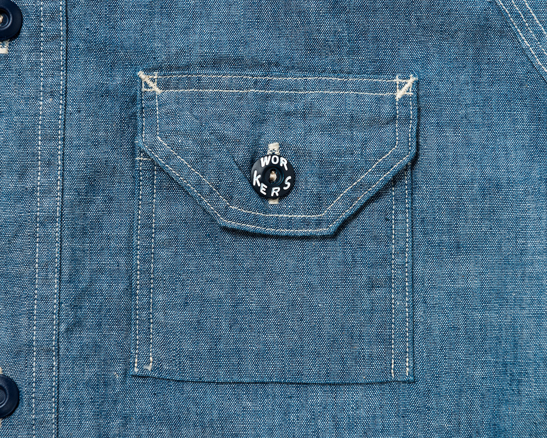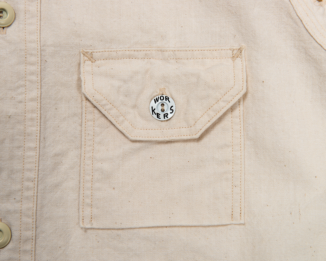 右胸側はシガレットポケット。リライアンス社にならって、WORKERSでも刻印入りのメタルボタンをつけています。