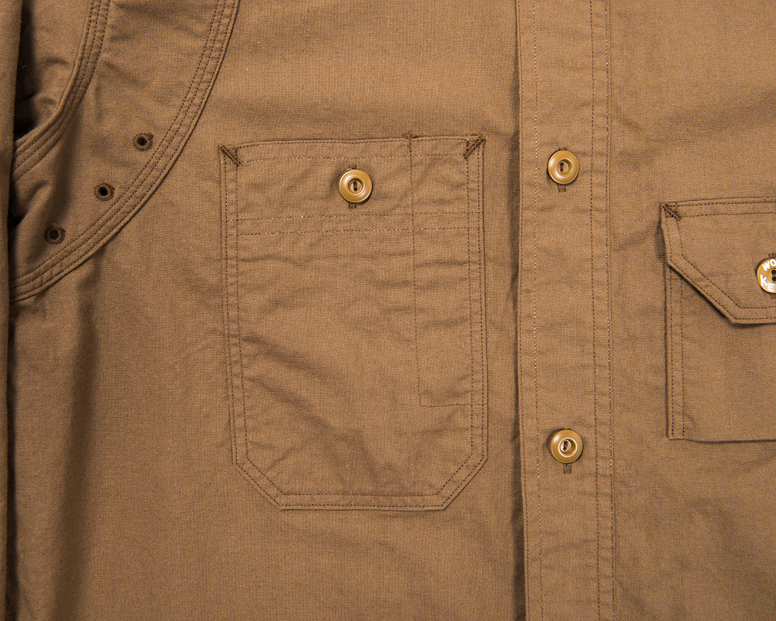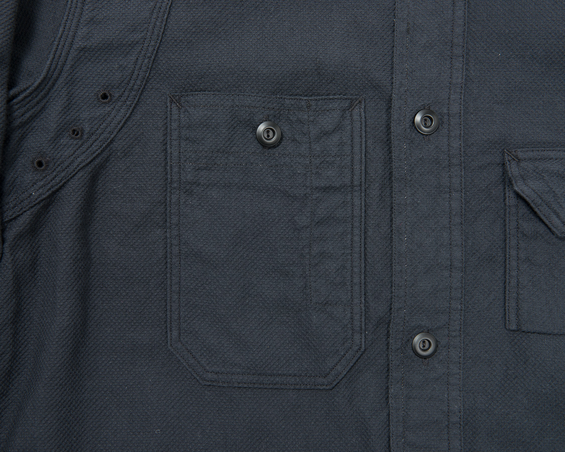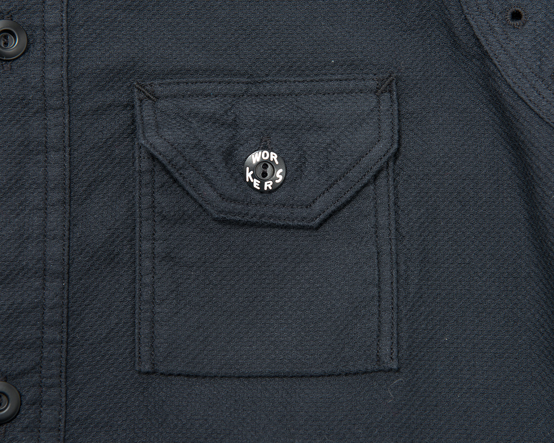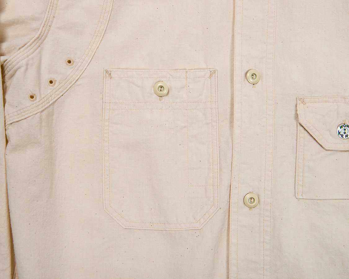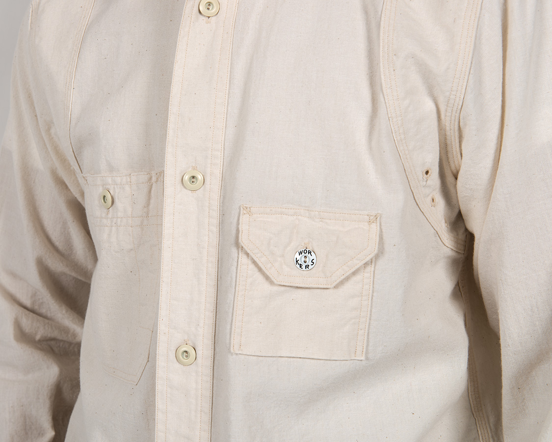 右胸側はシガレットポケット。リライアンス社にならって、WORKERSでも刻印入りのメタルボタンをつけています。