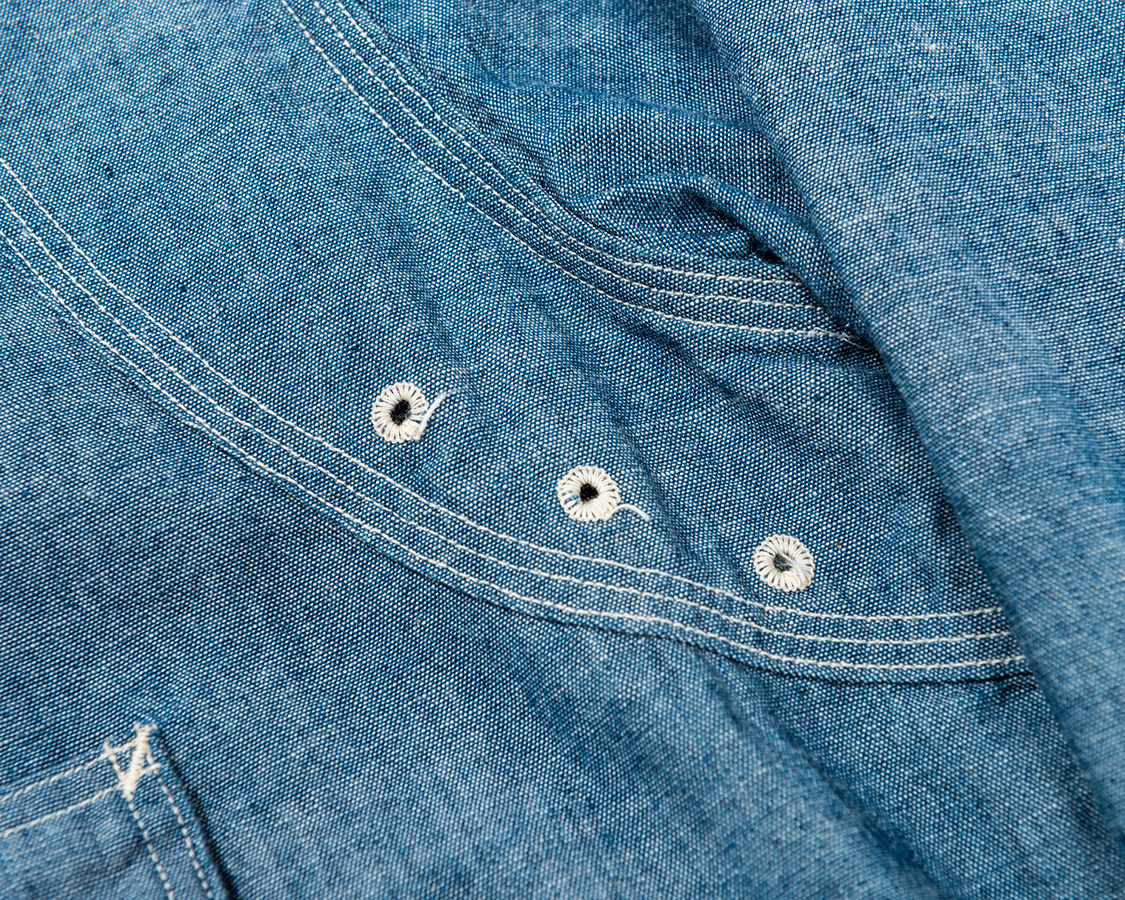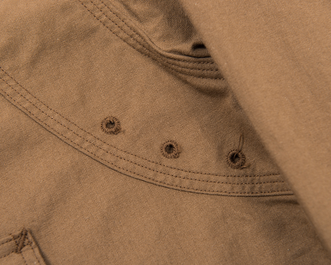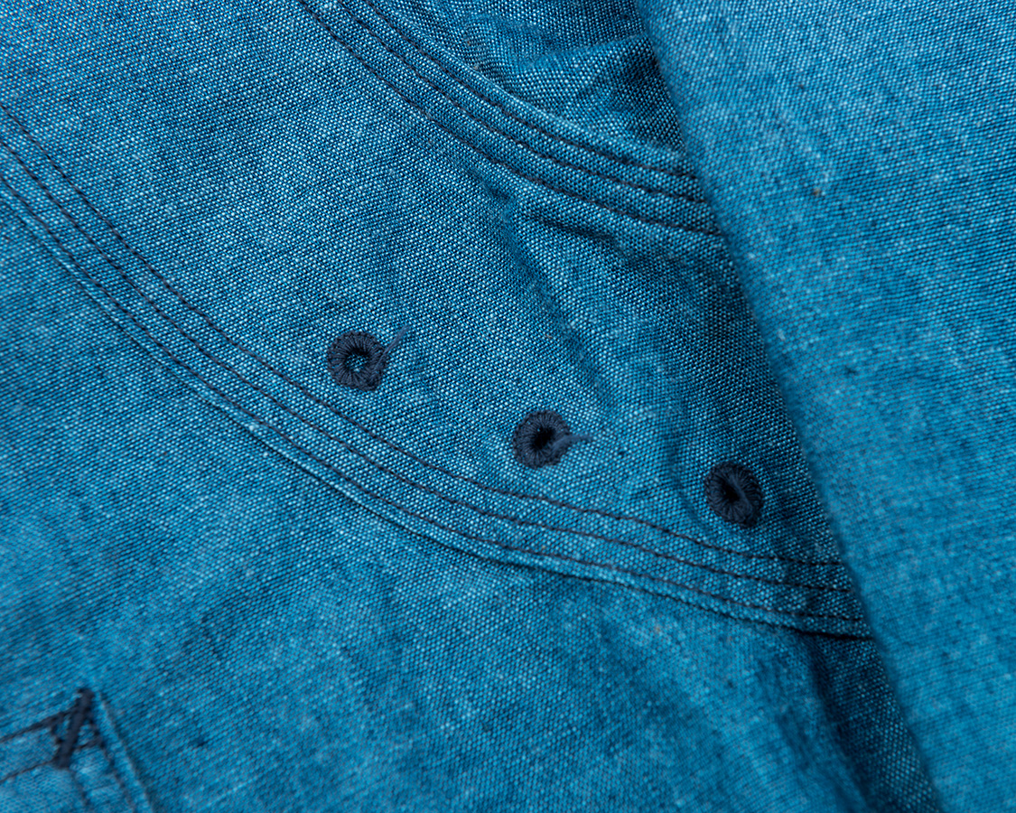 通気口はおなじみ、「本菊穴」。チェーンステッチ状になった糸のカガリが特徴。デザインでもあり、また布の重なる部分が蒸れないようにという機能でもある部分。