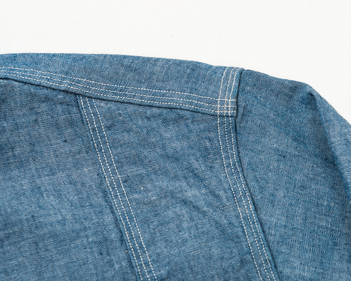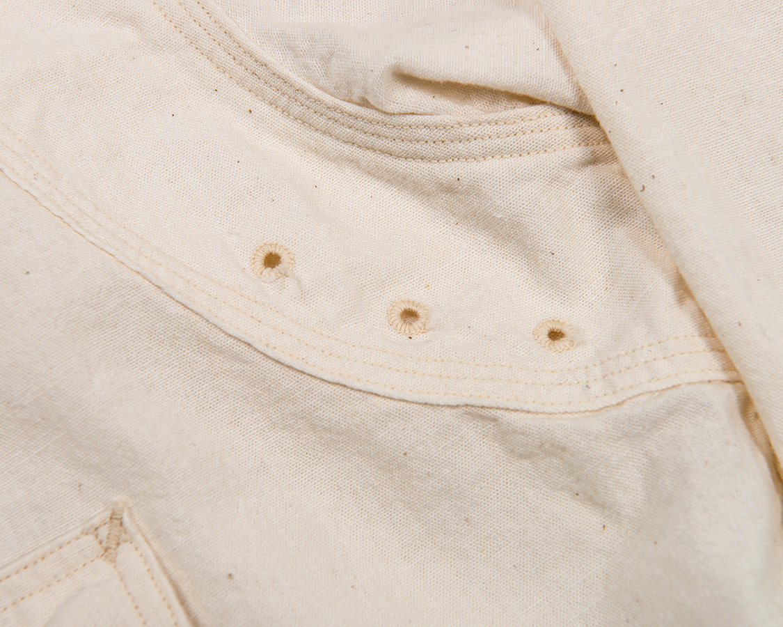 肩・袖ぐり・補強布の三日月布はすべてチェーンステッチ、トリプルステッチ。