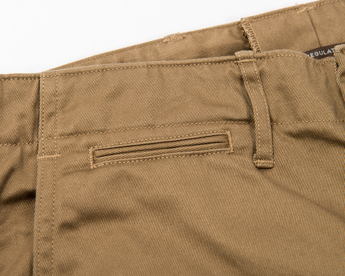 小股のダブルステッチ。チノパンというと良くあるのがここはステッチ無し。でもあえてWorkers Officer Trousersでは入れています。まず第一に強度の問題。やはり押さえステッチが入る方が強度は高い。さらに、ビンテージもここにステッチありも存在します。それを見た時に