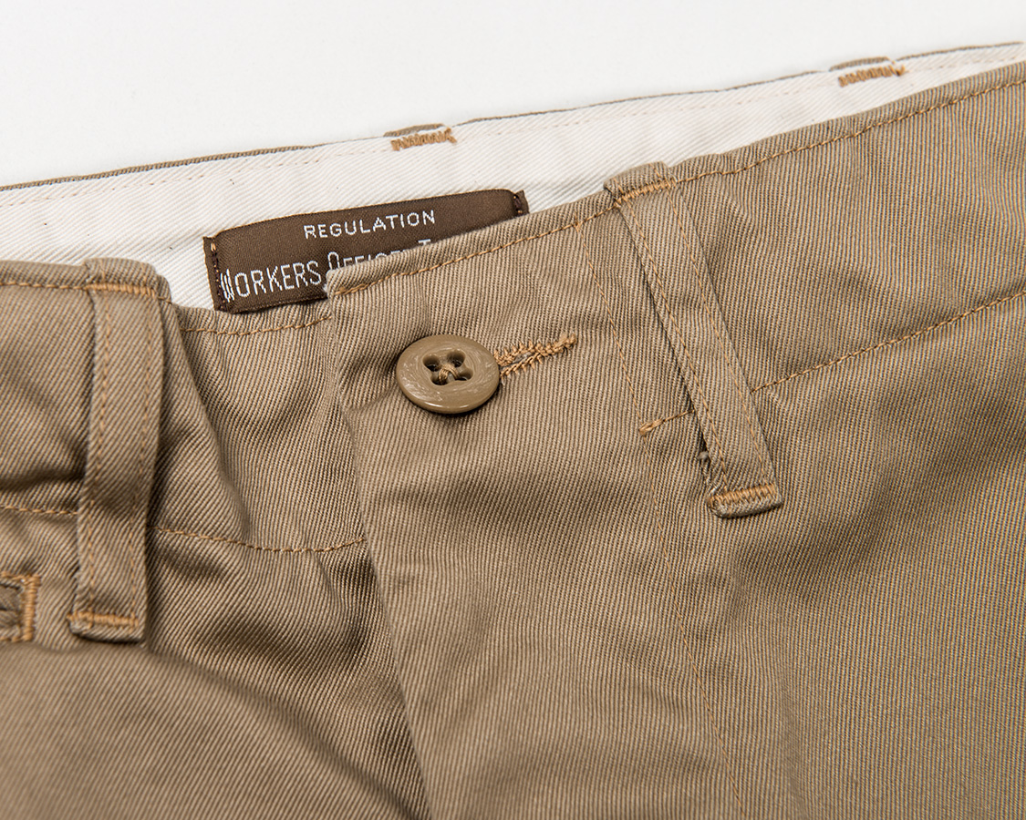フロントボタンフライ、ボタンホールの間にヒヨク止めがあるクラシカルな仕様。