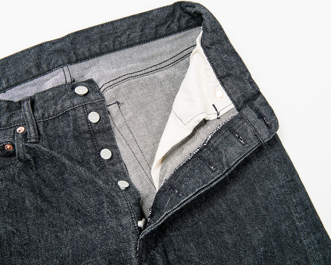 フロントボタンフライ。帯付け・巻き縫い・裾巻きといったチェーンステッチ部分は下糸だけコア糸(化繊の芯に綿糸を巻いたもの)を使って強度を上げています。