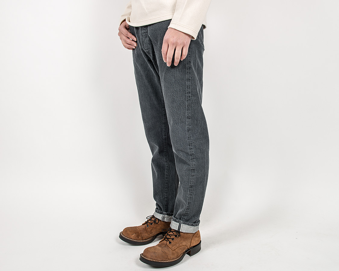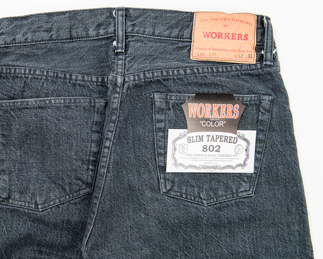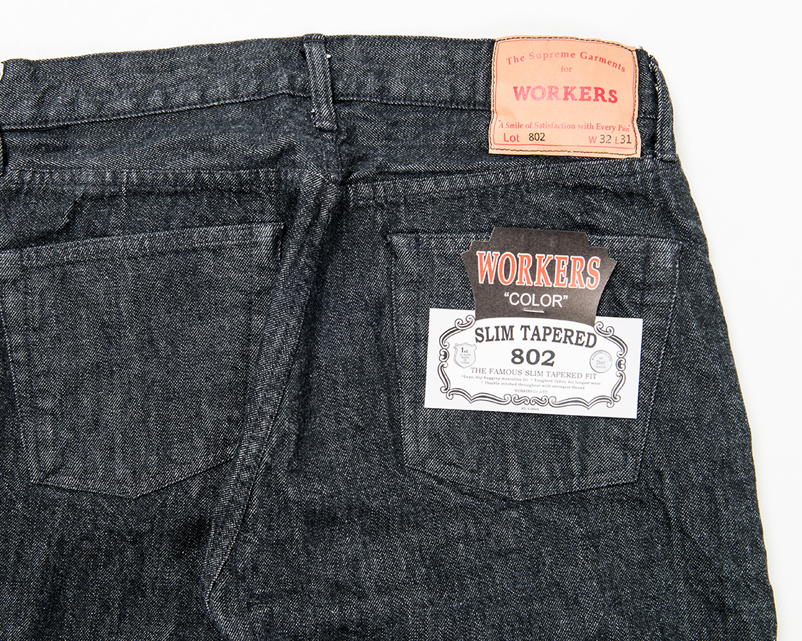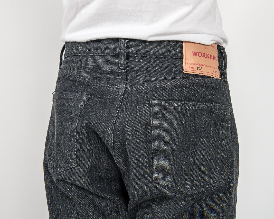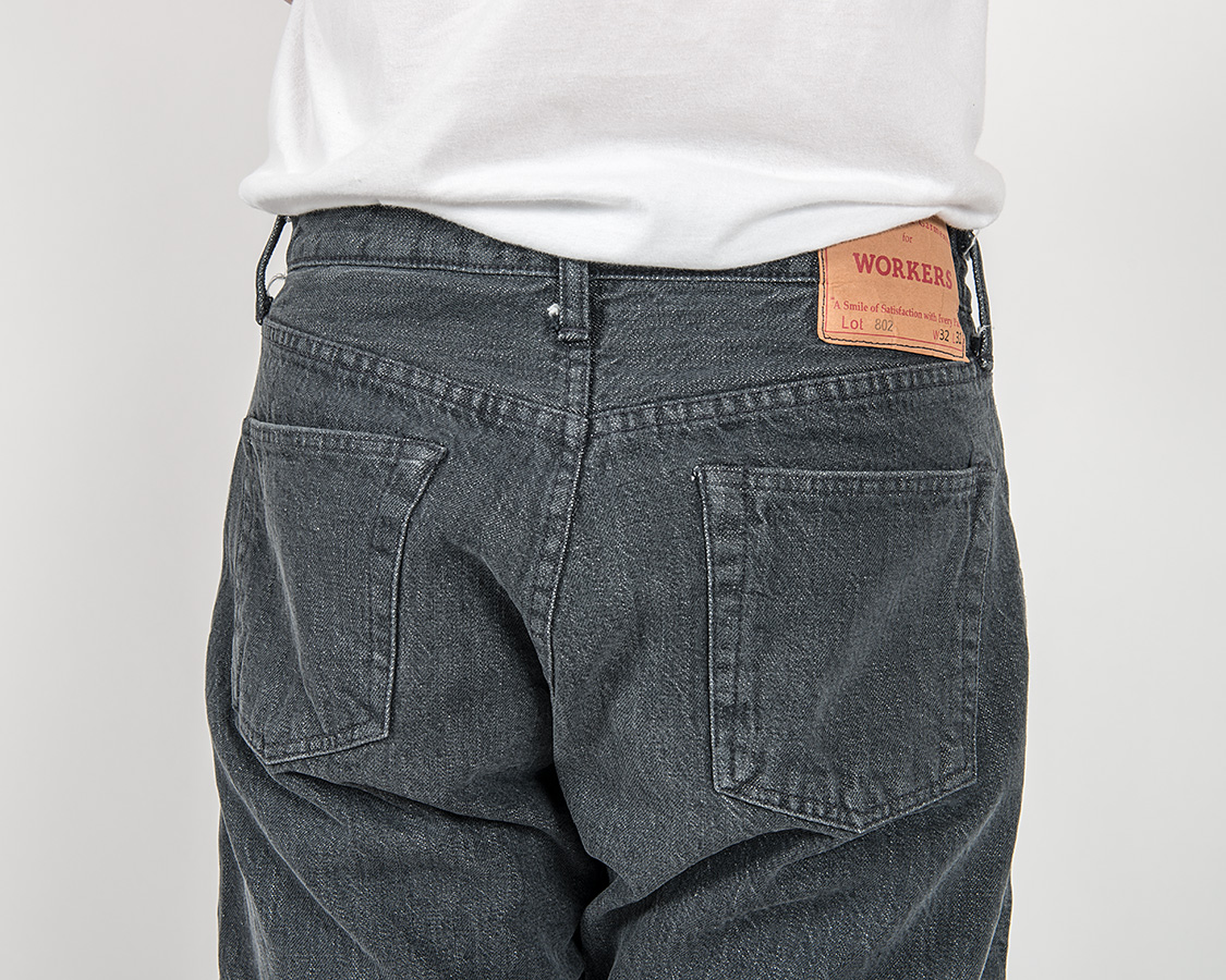 バックスタイル。やはりジーンズなので若干ヒップはタイト目。それでもWORKERSはSlim Tapered でもある程度ワタリを取るようにしています。腿の裏側あたり、ここにゆとりが無いと極端に動きづらくなるためです。ストレッチがあれば、ゆとりは少なくても快適ですが、WORKERSのデニムは綿100。最低限のゆとりは残します。