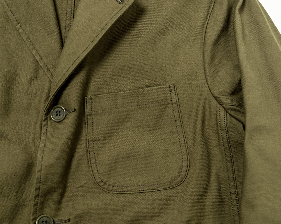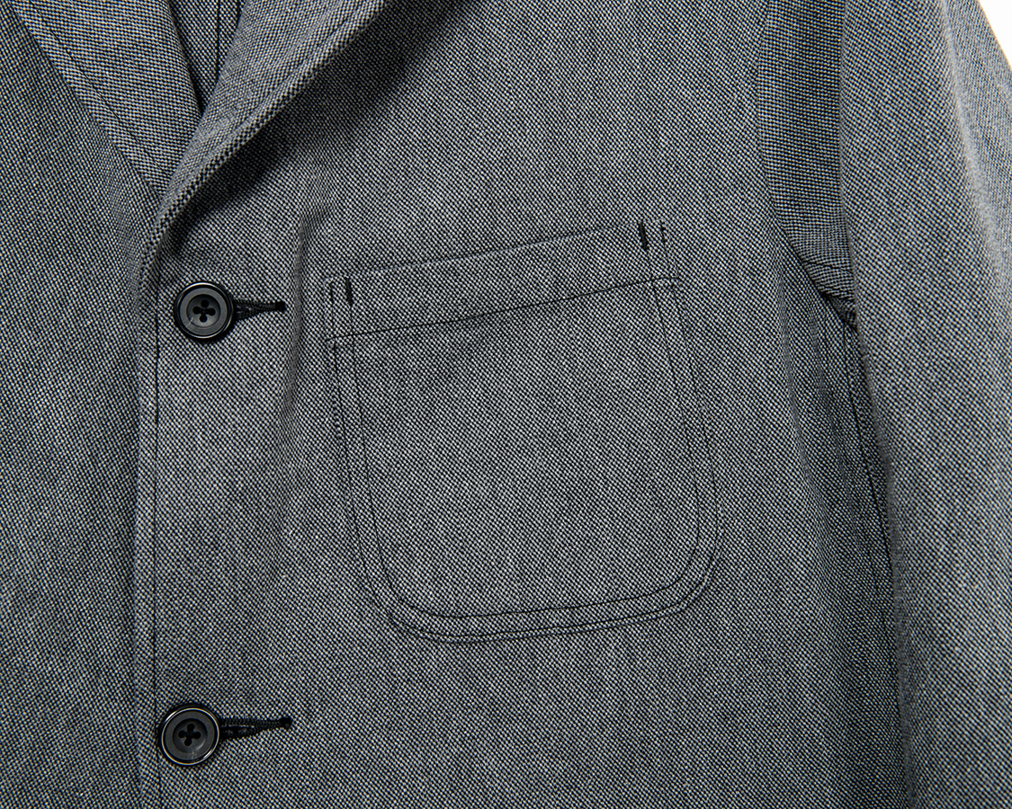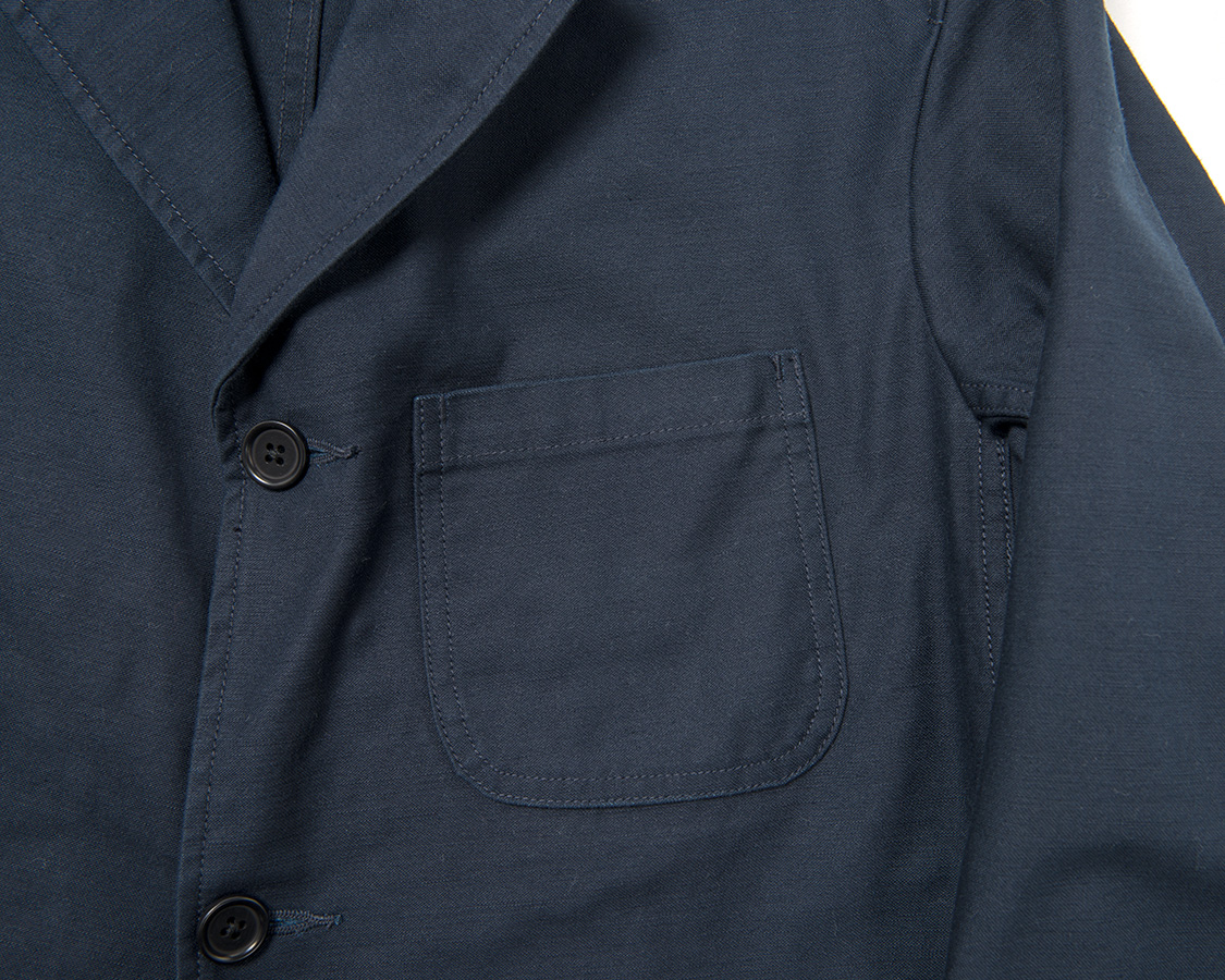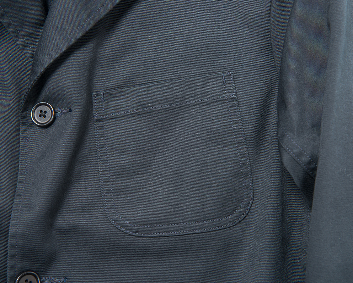 胸ポケットは樽型。Lounge Jacketは、どこかワークジャケット的な強固な作りなのでカン止めも入れています。