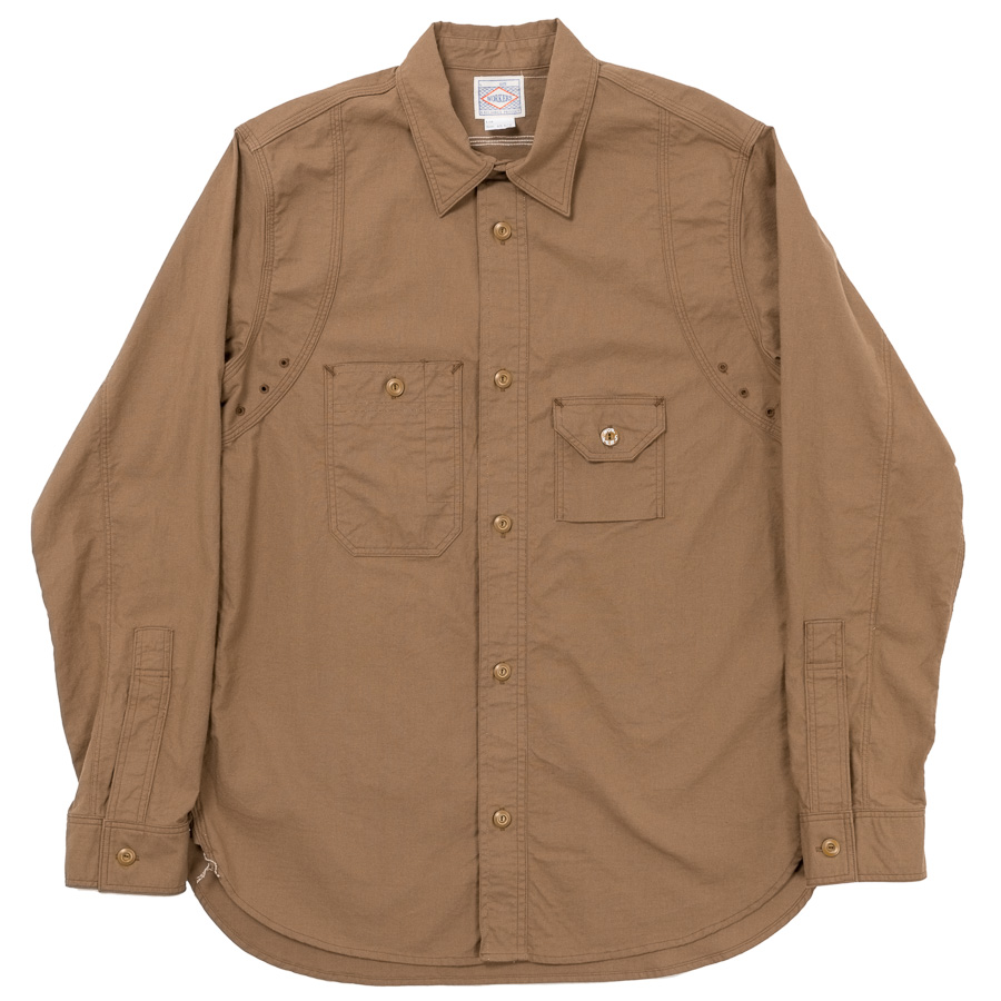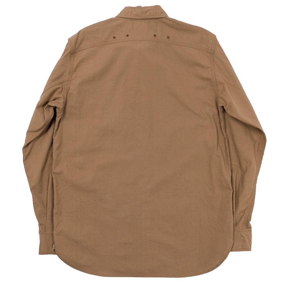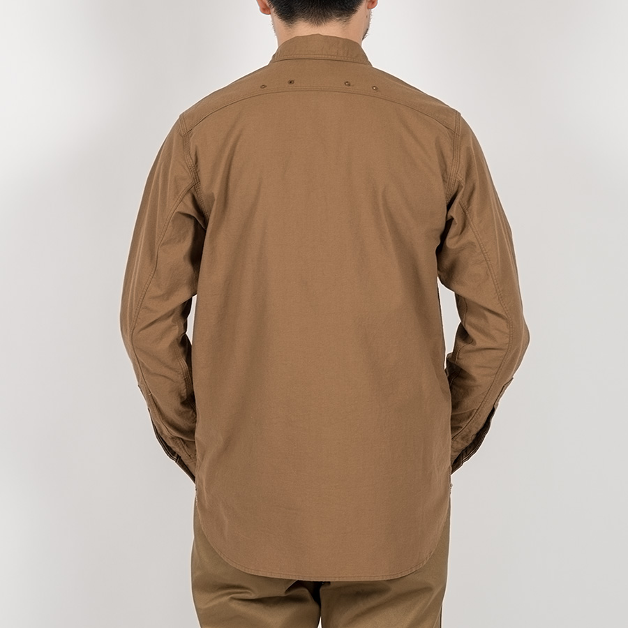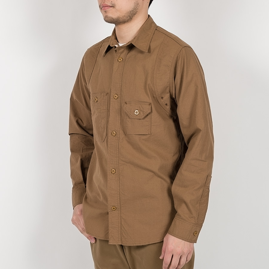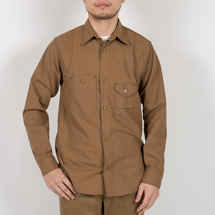 シガレットポケットは、身頃からポケット裏が浮いているのでタバコが湿気ないという機能。ただ、現代のたばこは大きすぎて入らないのでデザイン的に。さらにこのポケットには刻印入りの金属ボタン。他の部分もすべて金属ボタンで、いかにも強固なワークシャツらしい部品。ボタン、ブラウンは定番では無い色なので別注でペイントしています。