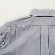 素材は3オンスクラス・100番双糸のブロードクロス。100番の糸を二本撚り、50番程度の太さにした糸で緊密に平織した生地。双糸の特徴はその強度と光沢感。糸切れは、糸ムラの細い部分で起こります。双糸の場合、その細い部分が片方に合っても、もう片方が補強してくれます。ただ、そもそも100番の糸として完成しているものを二本撚る為、ほぼ同じ太さの50番単糸よりも高価になります。