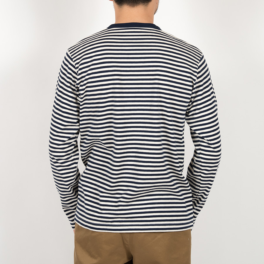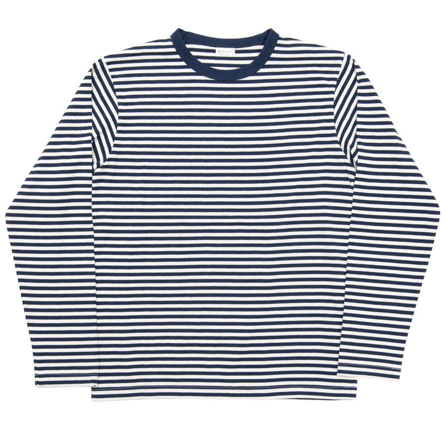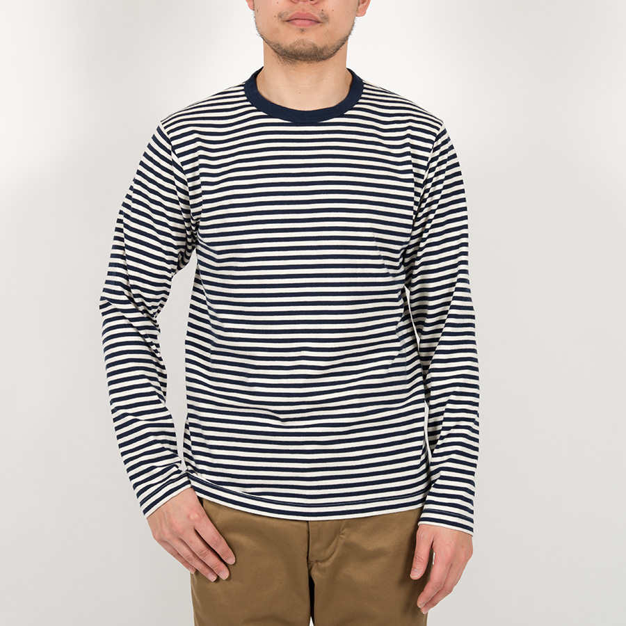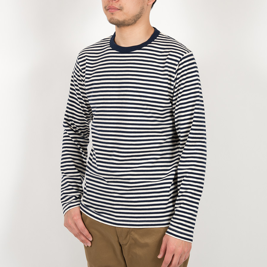 昨年作った、空紡糸の80-90年代フレンチ風の硬いボーダーは白部分を真っ白にしていました。同じボーダーでも、生地は柔らかく、白部分は生成りがかってぼやっとした色合いと、目指すところが違います。Tシャツと同じ組織の生地なので1枚で着られるのがポイント。ロンTを着る時に悩むのが「中は着るのか?着るならTシャツか?タンクトップか?」。この6オンスロンTシリーズは1枚で着てOK。 |