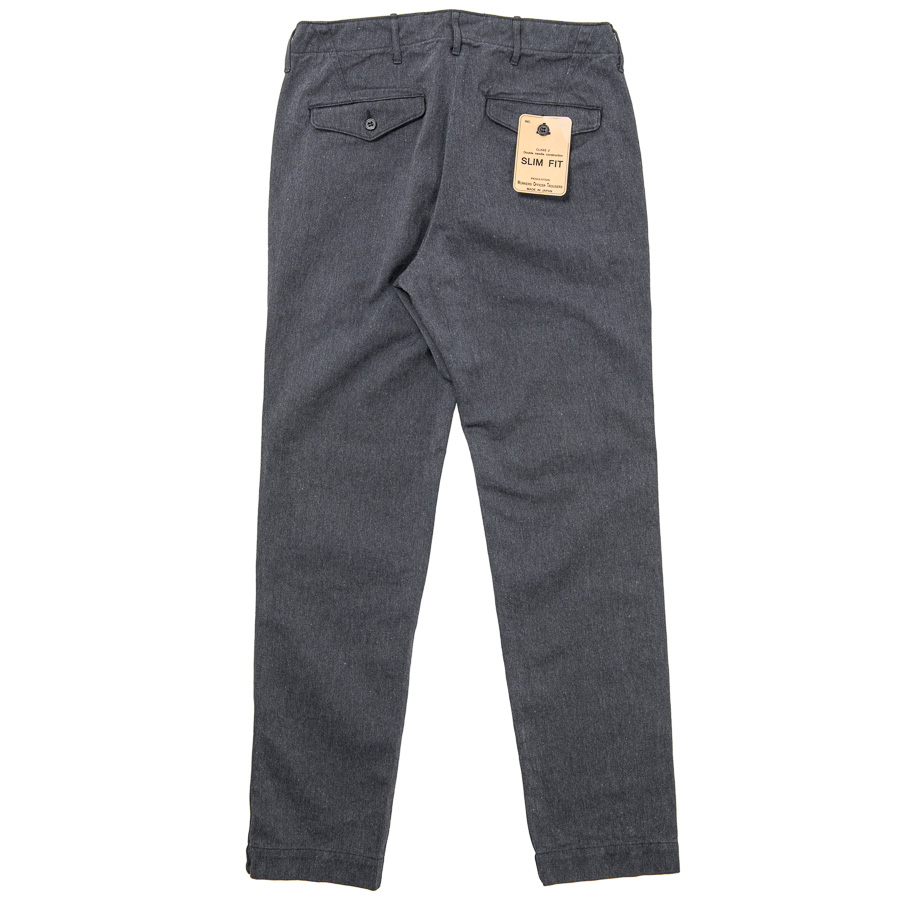 定番のSlimFit。膝から裾にかけてすっきりと。18センチ前後の裾幅で、これ以上細くするとテーパードになってしまうギリギリSlimFitと言える寸法。仕様はクラシックに、フロントはボタンフライ。ポケットは手の入れやすさを考えて斜め切り替えポケット。バックポケットはフラップ付の玉縁ポケット。ダーツを斜めに取ることで、分量をたくさん取れます。これにより、Slimでありながら、ヒップ周りは適度な丸みを持った穿きやすく綺麗なシルエットを作り出しています。
