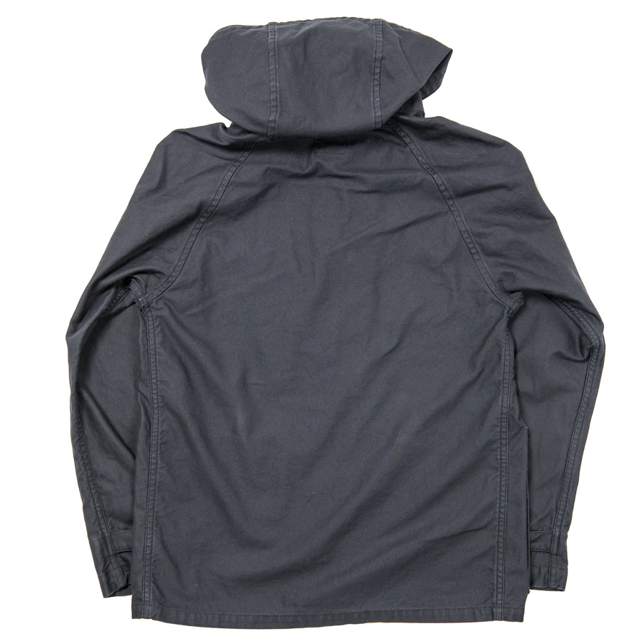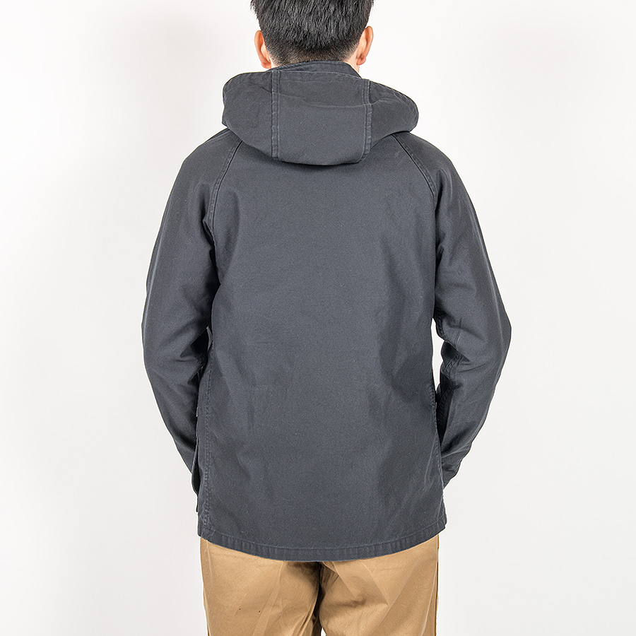 アウトドアウェア的な仕様。フードが後ろに抜けてしまうと首回りに締まりがありません。そこで、襟に切り替え線を入れ、フードを差し込んでいます。シルエット自体はWORKERSで言うとマウンテンパーカーに近い。少しゆったり目ですが、中にジャケットまでは着られない。シャツ+セーター程度がベスト。