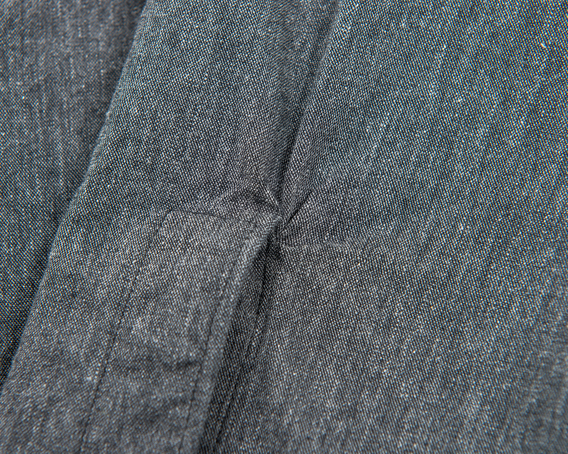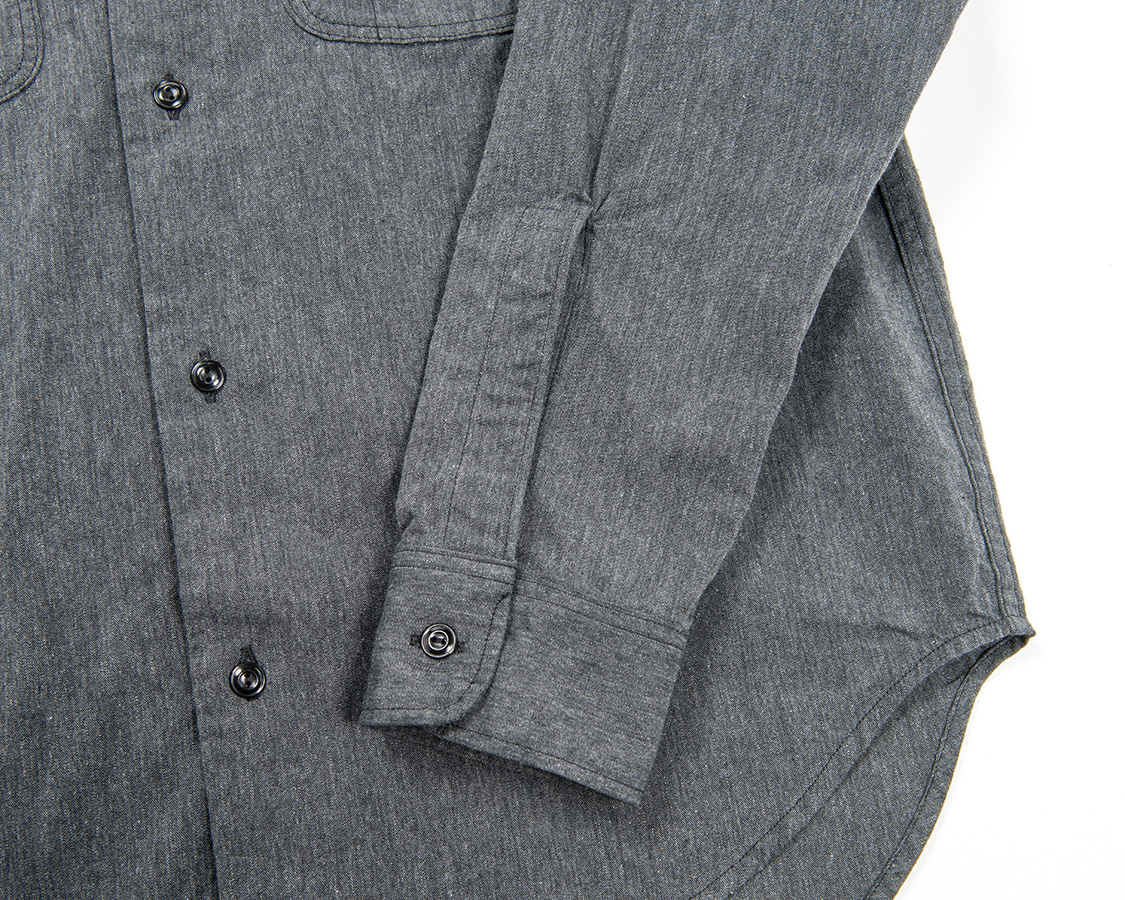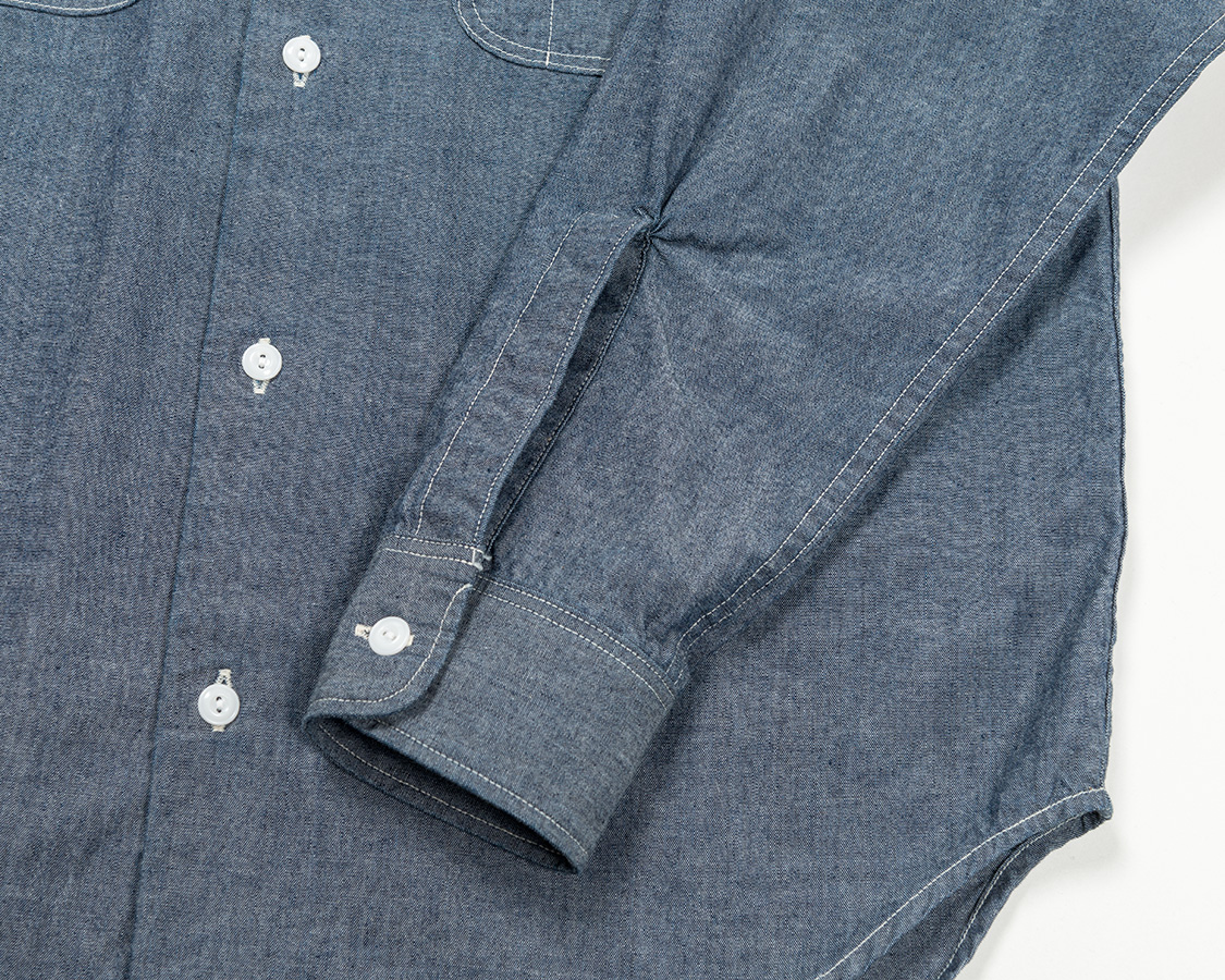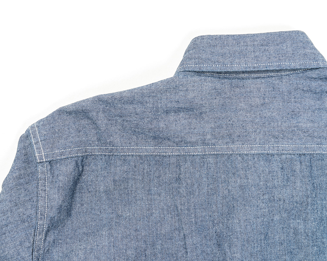 背面はまっすぐのヨーク。ここもぐわっと曲がってるとRelianceっぽいな〜などと感じる部分で、まっすぐだとシンプルな、いわゆる普通のワークシャツだよね、と感じる仕様。今回は、後者を狙っています。