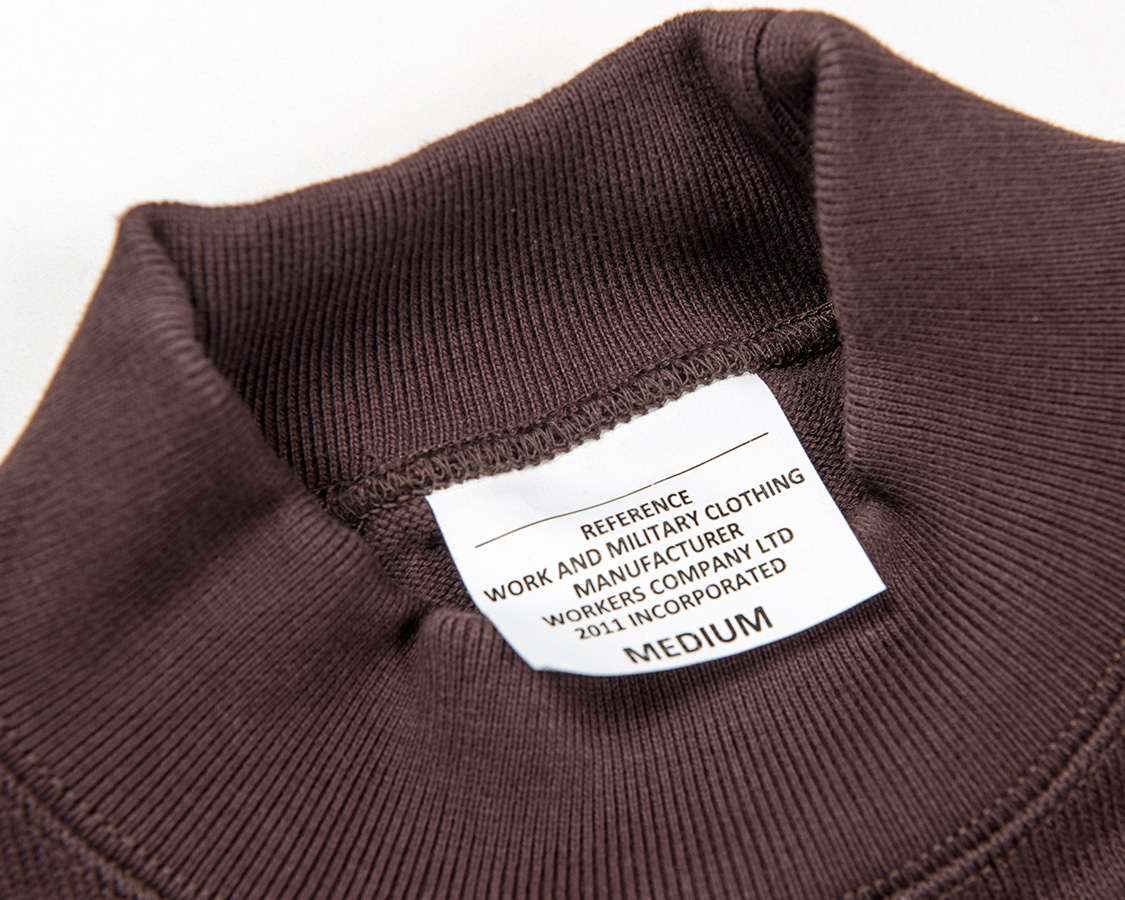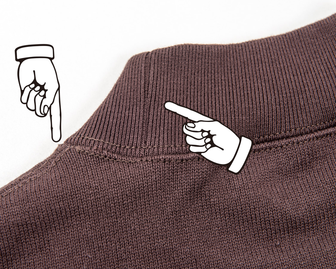 昨年からの変更で、ネームのつけ方を身頃たたきつけから、ネック流し込みに変更しました。身頃たたきつけだと、どうしてもたたきつけた部分が布で突っ張ります。これが不細工に見えることがあったので、ネック流し込みに変更しました。