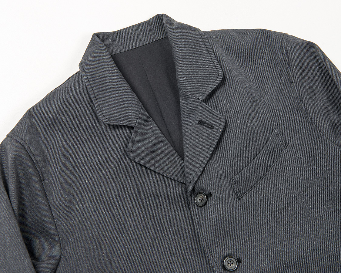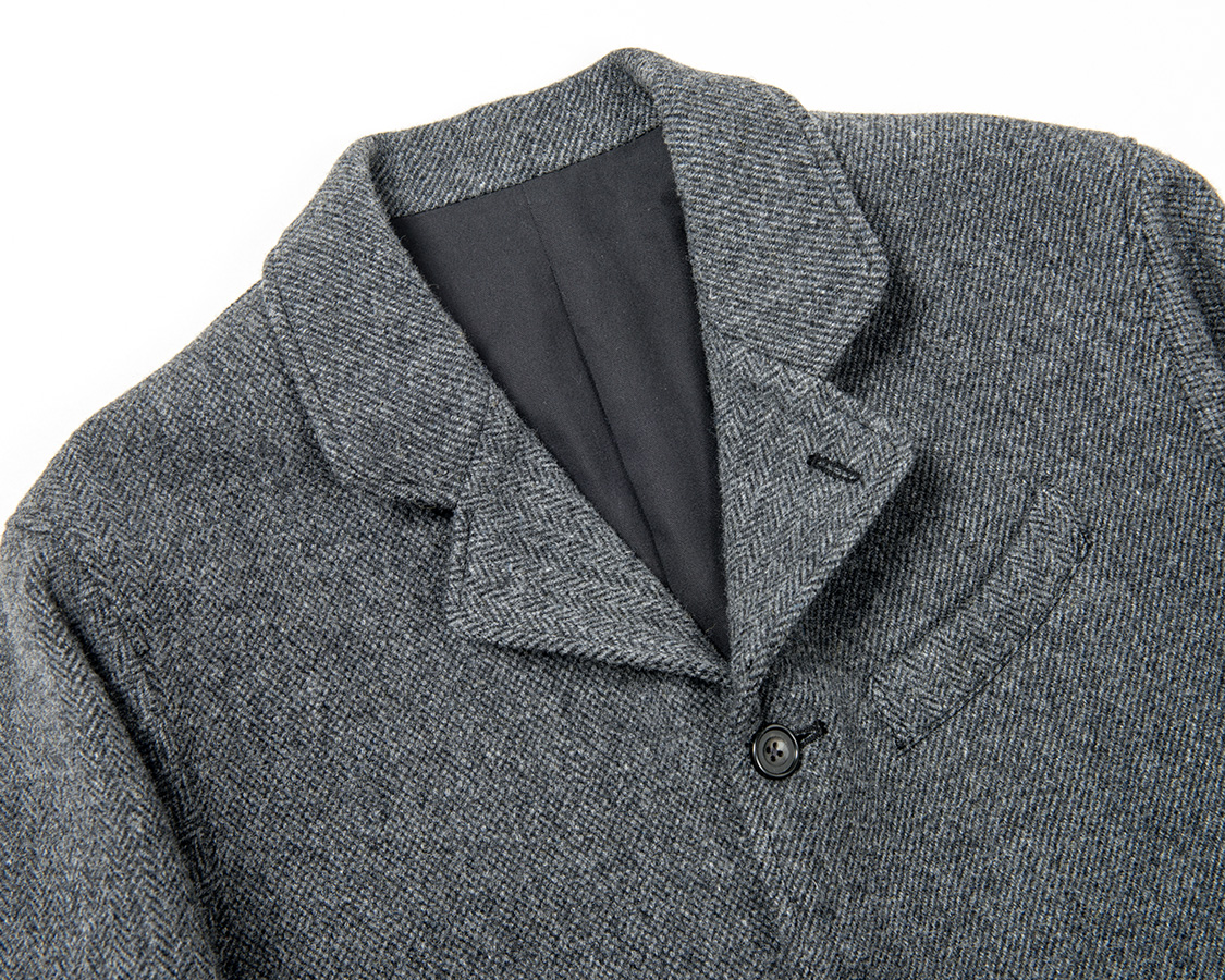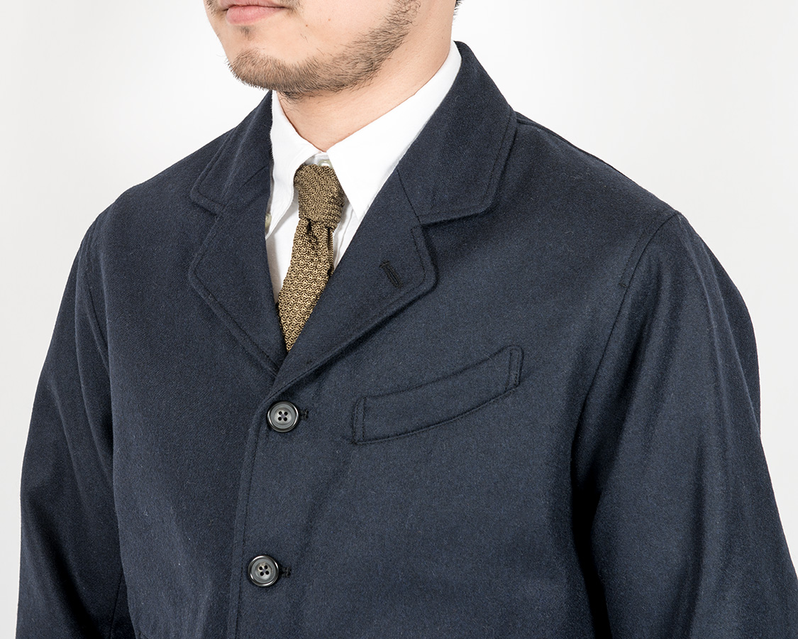 四つボタンなので少し狭いV。小さ目のラペル。襟・ラペルともに先は丸みを帯びる。
