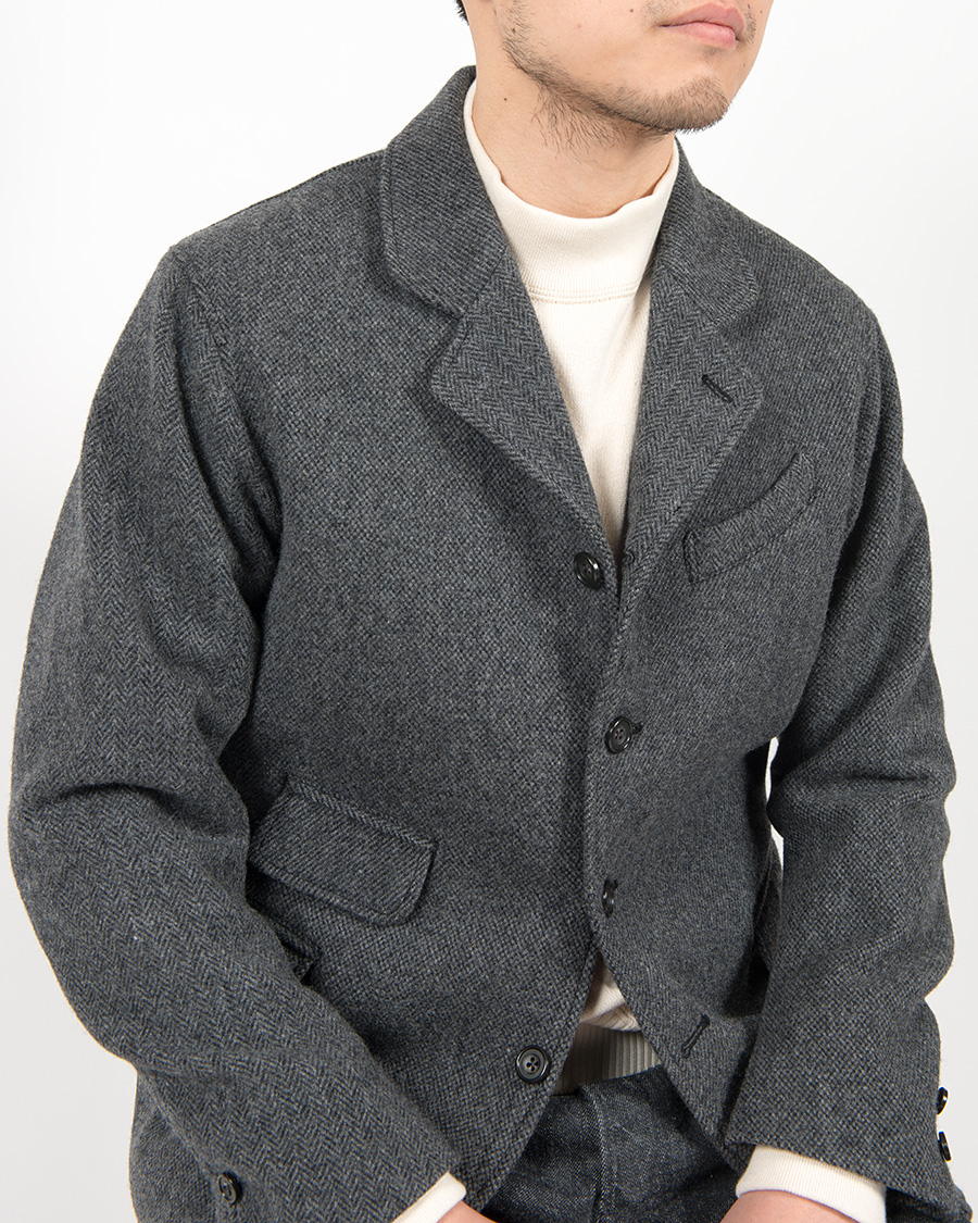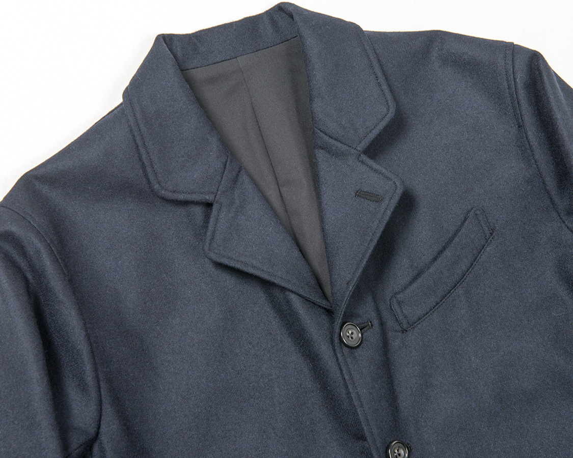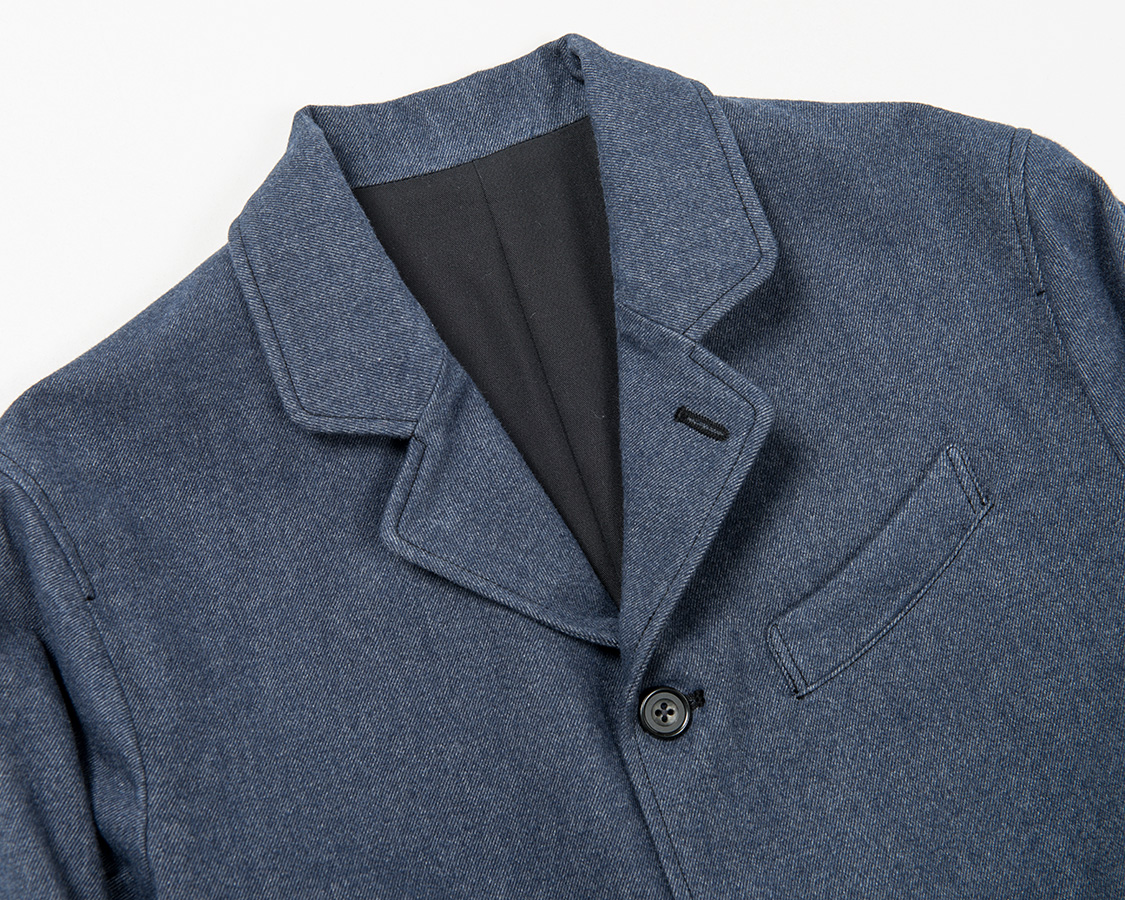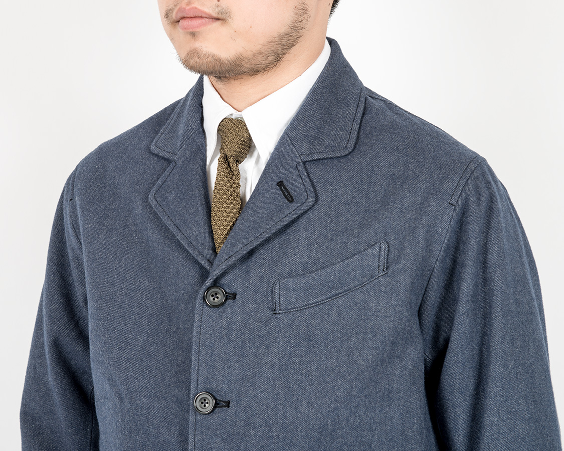 四つボタンなので少し狭いV。小さ目のラペル。襟・ラペルともに先は丸みを帯びる。