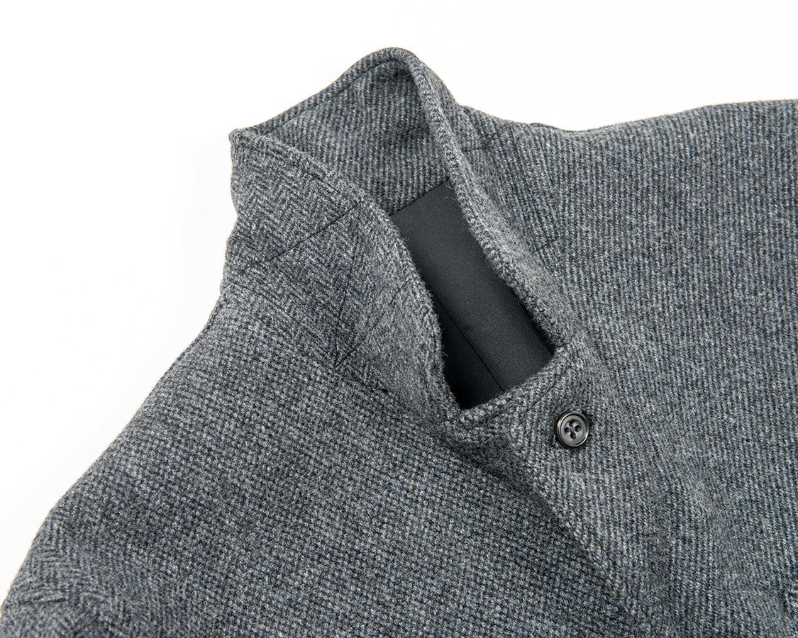襟裏には芯止めのステッチ。寒い時には襟を立てて、一番上のボタンをしめて着ることが出来ます。