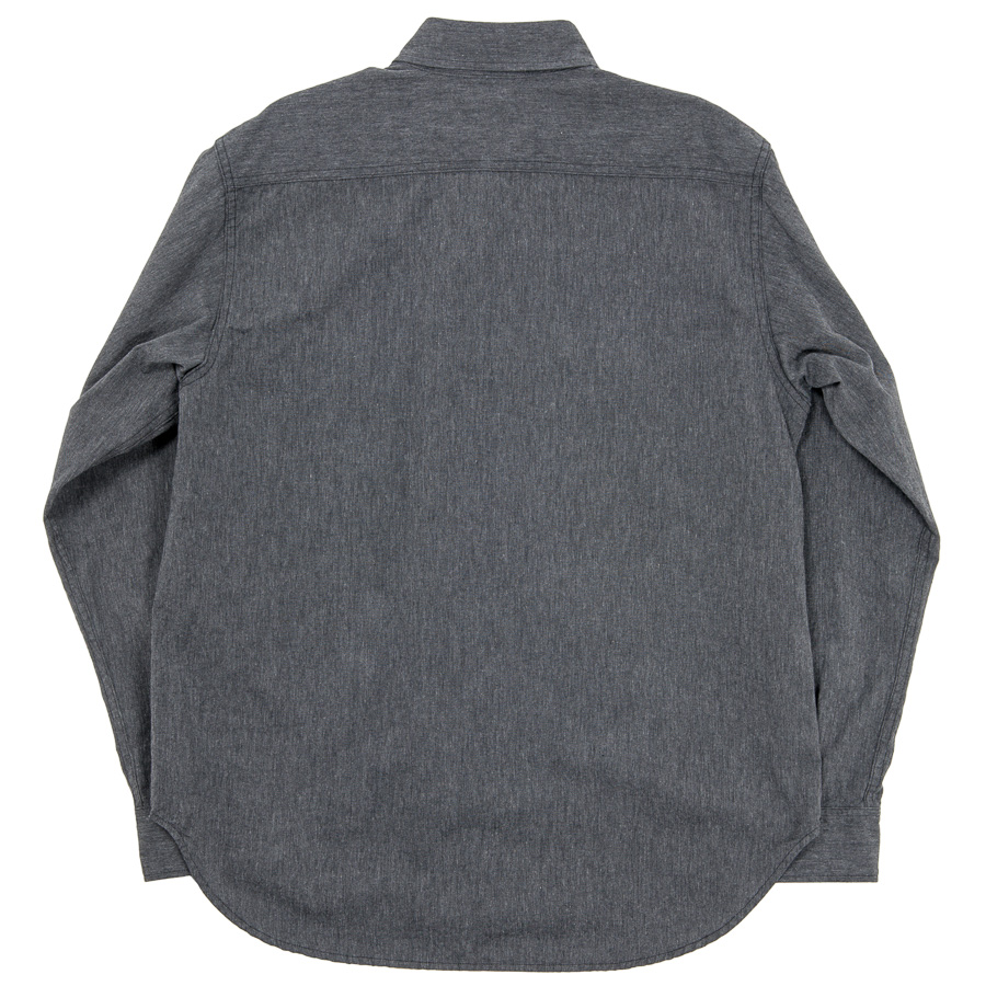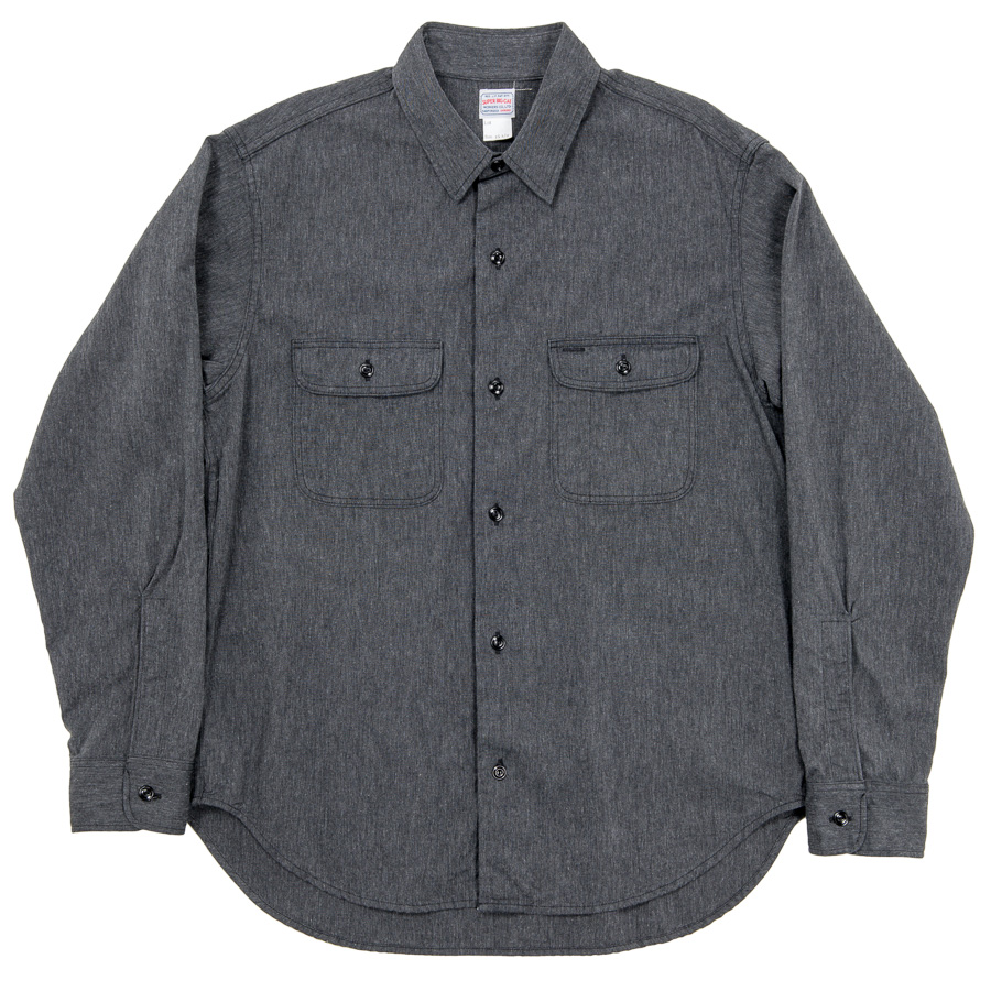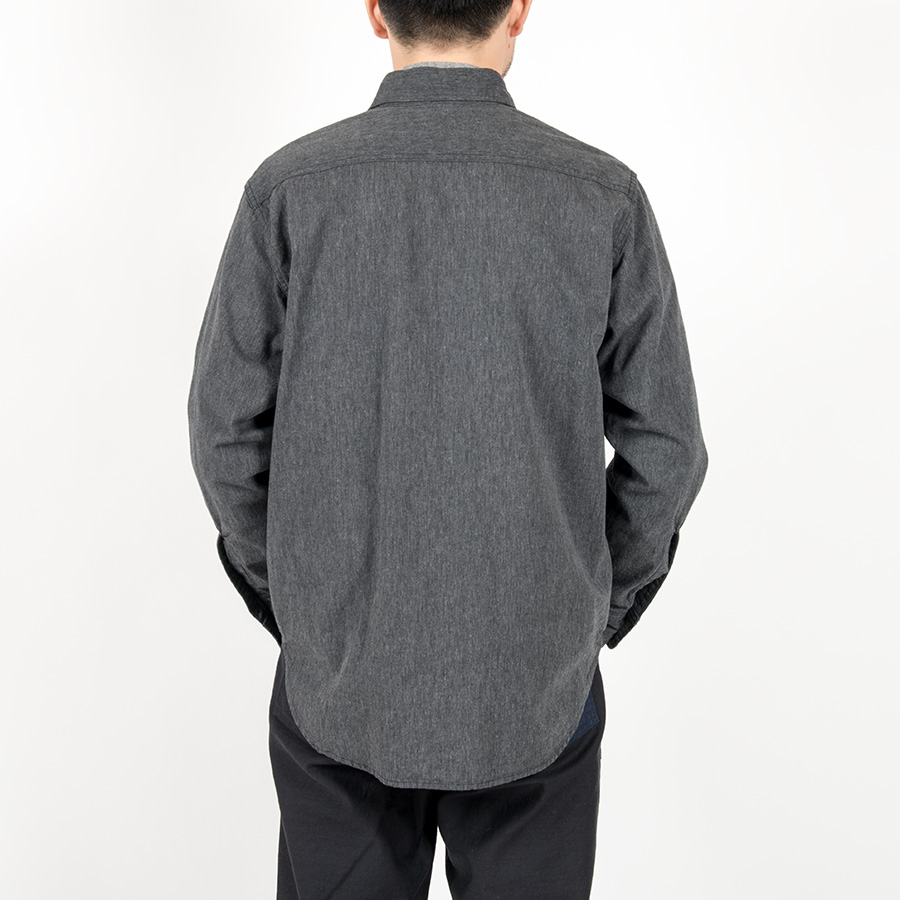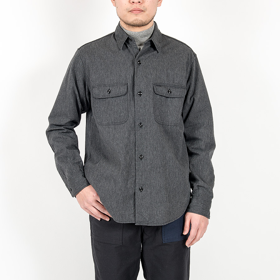素材は5オンス、杢糸(色糸と生成り糸をよった糸)を使ったフェイドグレイシャンブレー。 単色でグレーに糸を染めたのとは違う、表情のあるグレー色。