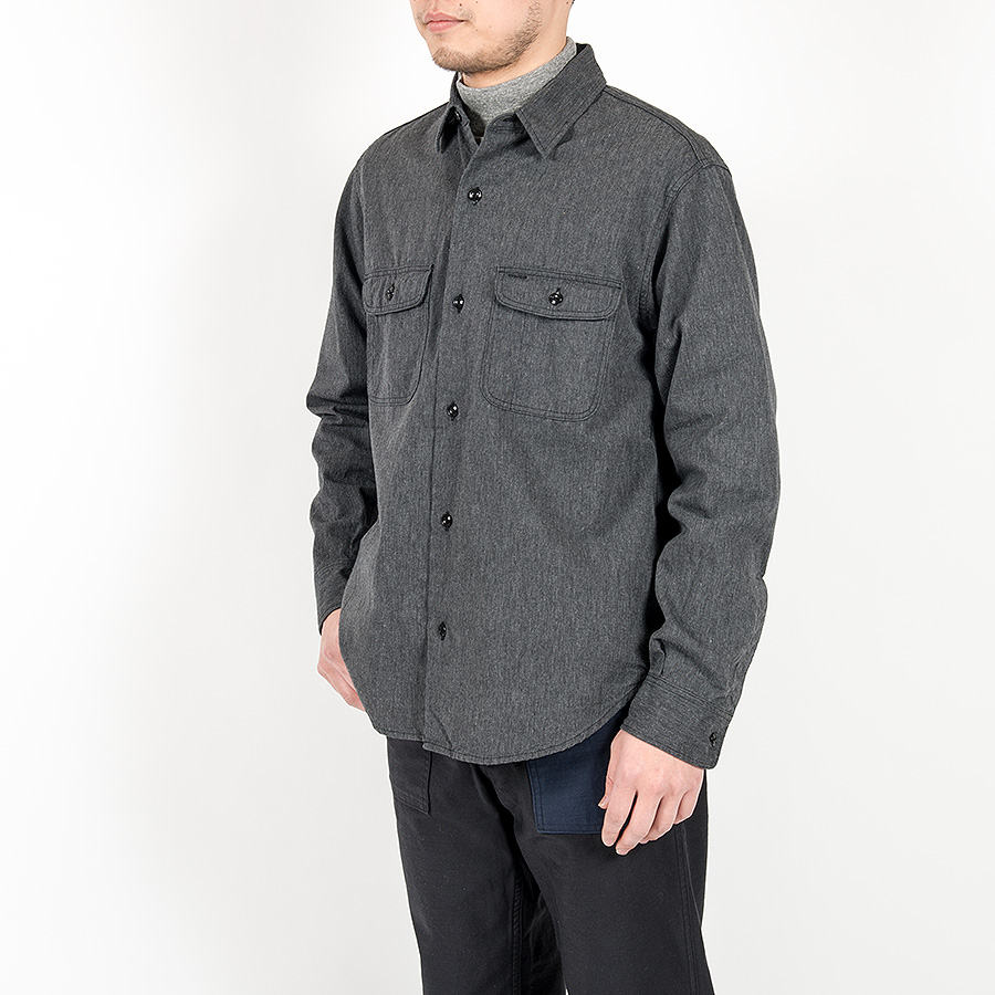 私自身は、冬場にゆったりと。インナーを着て、このシャツを着て。デスクワークはそれでOK。寒い倉庫作業は中綿ジャケットをさらに上に着る。