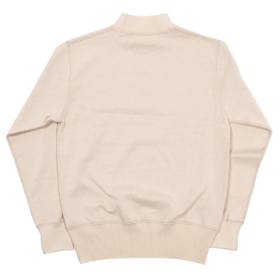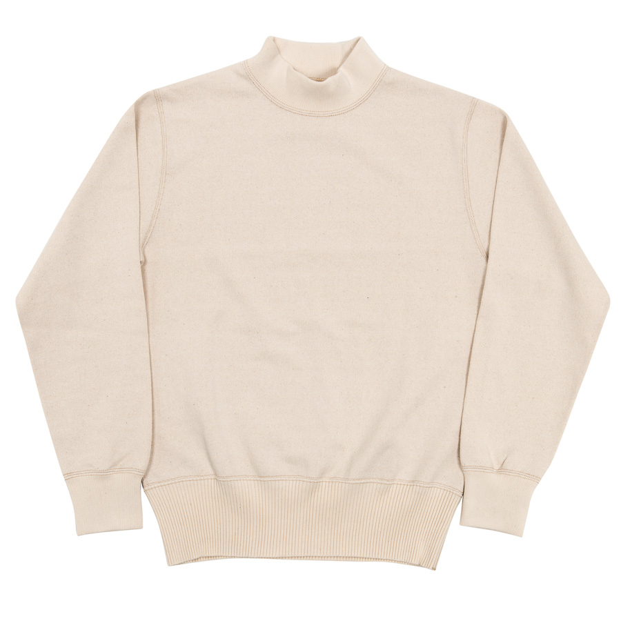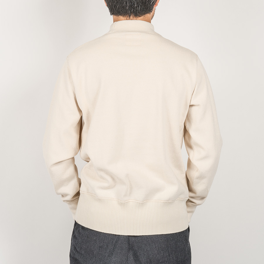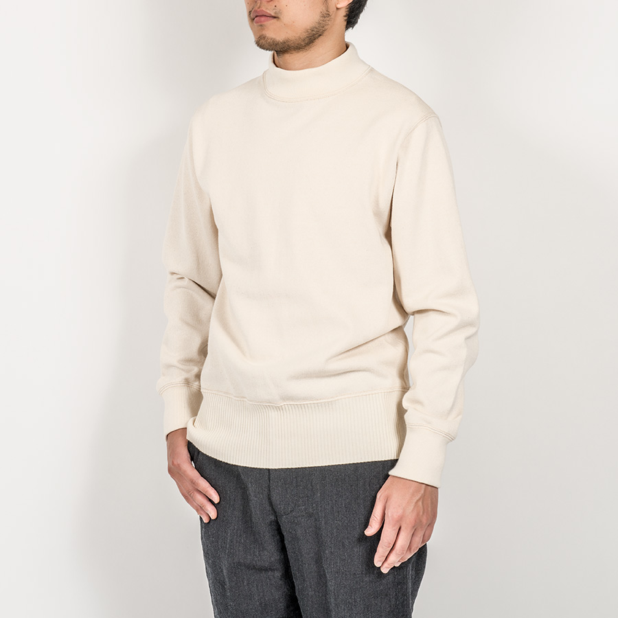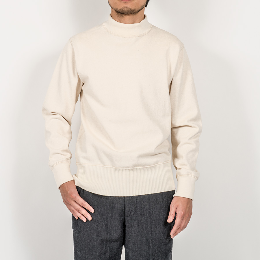 裾は針抜き、袖口と襟は通常のフライスと編み目を変えています。これを縫い合わせることで、かなりセーターに近い雰囲気に。もともと、古着のUSNセーター自体、身頃・襟・袖口(場合によっては裾)と別々に作った部品を縫い合わせて作る「ニットソー」がほとんど。そのため、今回のようにコットンでカットソーで作ってもかなり近い風合いに成っています。シャツの上はもちろん、コットンなのでチクチクしないのでTシャツの上に1枚でも着て頂けます。