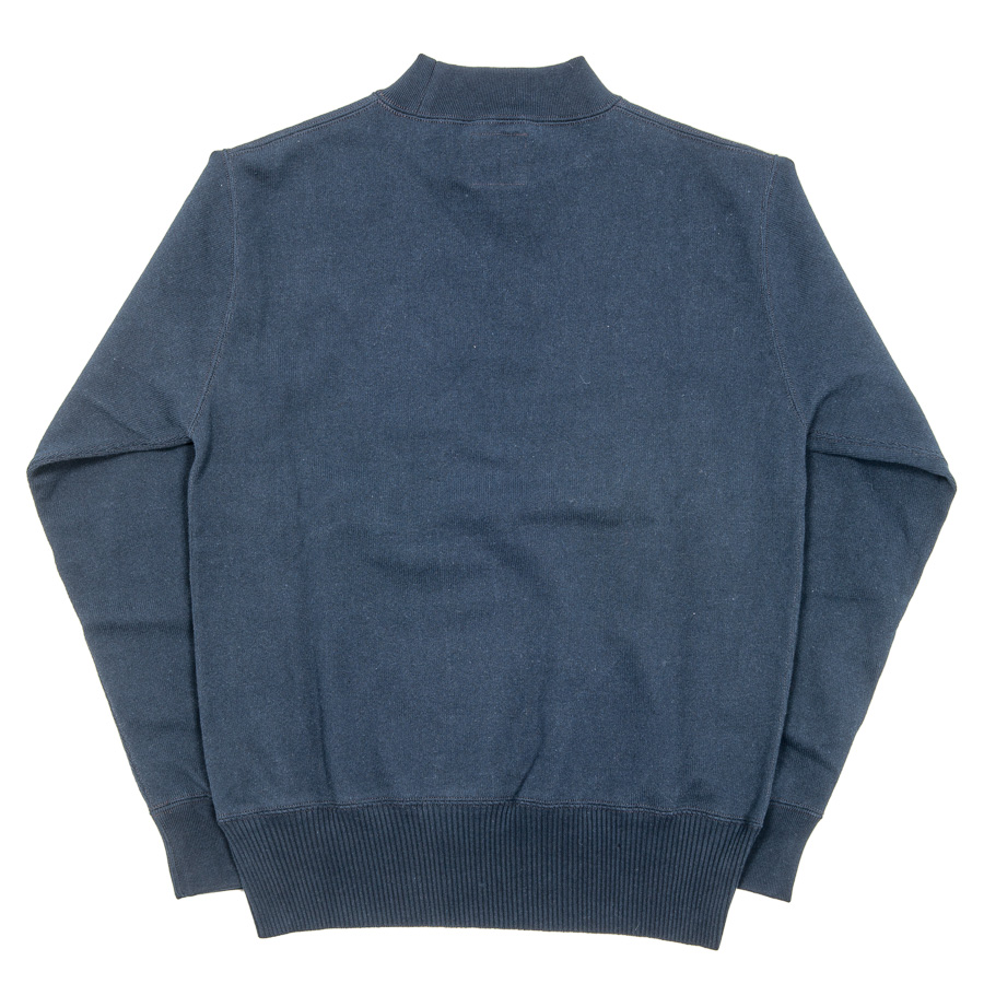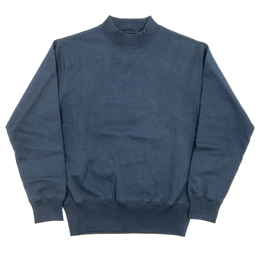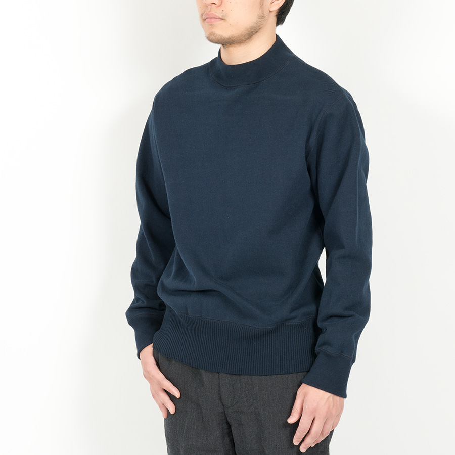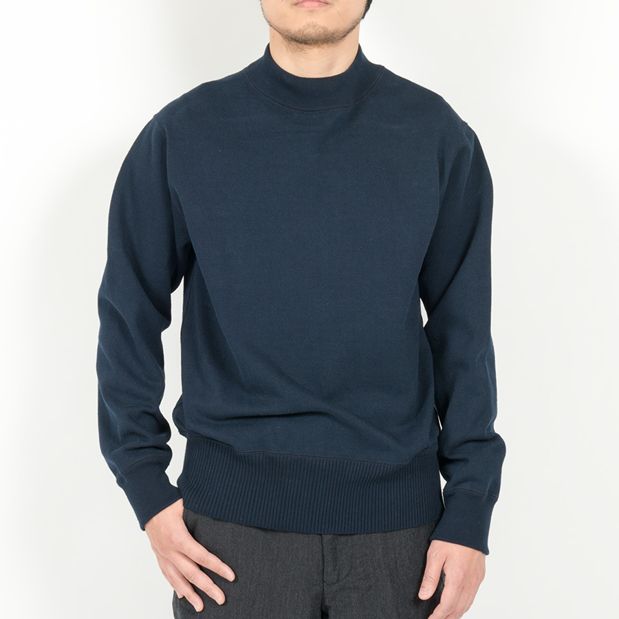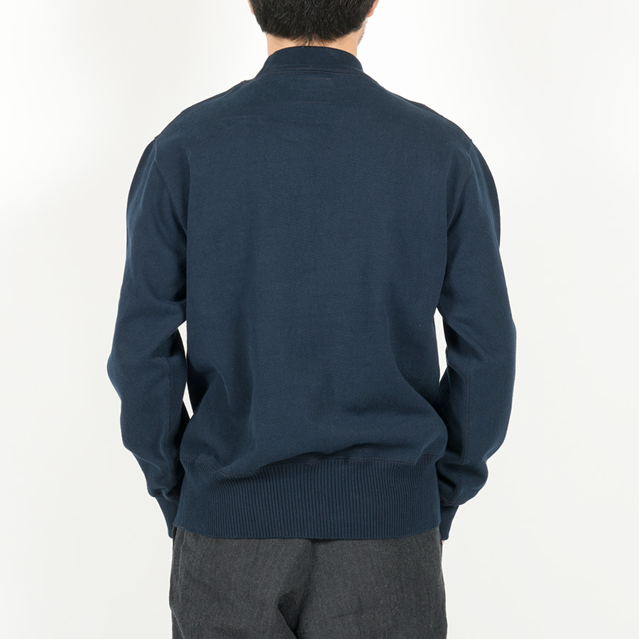 裾は針抜き、袖口と襟は通常のフライスと編み目を変えています。これを縫い合わせることで、かなりセーターに近い雰囲気に。もともと、古着のUSNセーター自体、身頃・襟・袖口(場合によっては裾)と別々に作った部品を縫い合わせて作る「ニットソー」がほとんど。そのため、今回のようにコットンでカットソーで作ってもかなり近い風合いに成っています。シャツの上はもちろん、コットンなのでチクチクしないのでTシャツの上に1枚でも着て頂けます。