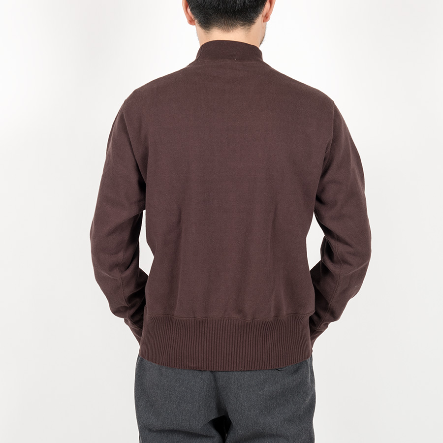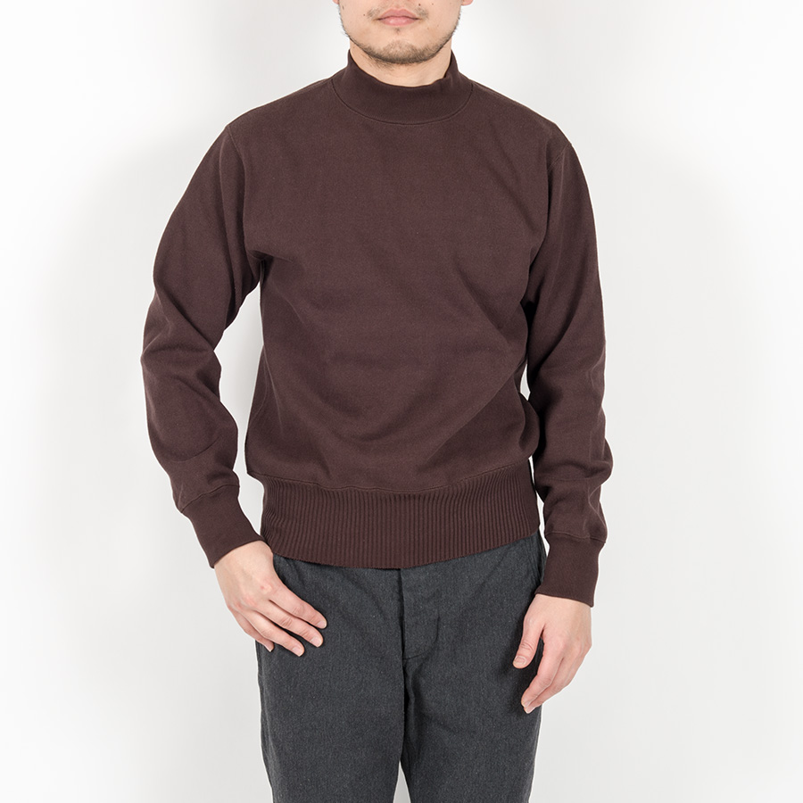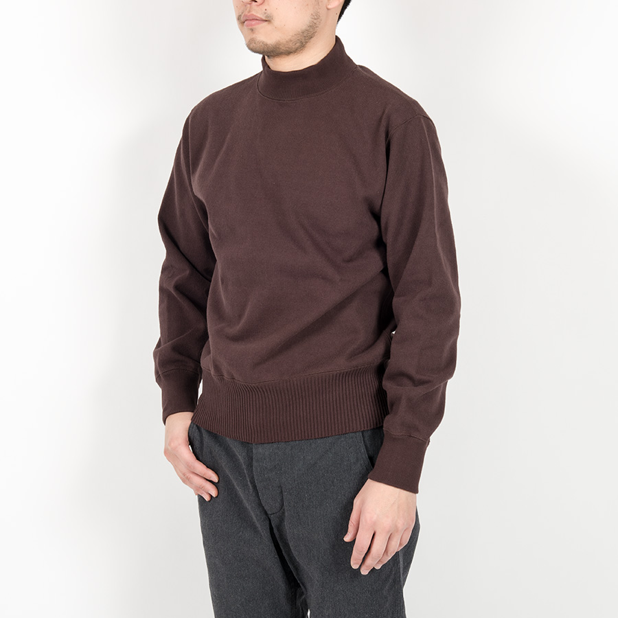 裾は針抜き、袖口と襟は通常のフライスと編み目を変えています。これを縫い合わせることで、かなりセーターに近い雰囲気に。もともと、古着のUSNセーター自体、身頃・襟・袖口(場合によっては裾)と別々に作った部品を縫い合わせて作る「ニットソー」がほとんど。そのため、今回のようにコットンでカットソーで作ってもかなり近い風合いに成っています。シャツの上はもちろん、コットンなのでチクチクしないのでTシャツの上に1枚でも着て頂けます。
