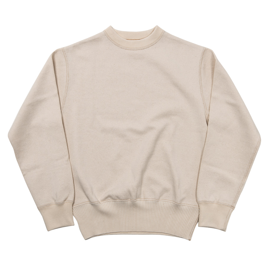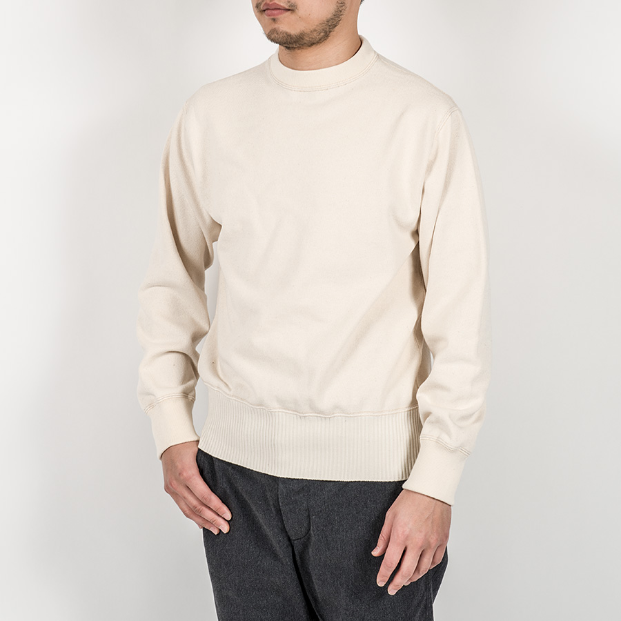 昨年来、好評の極厚「セーター風カットソー」のCrew Neckバージョン。モックネックは暖かい、でも首回りの締め付けを嫌う向きもあります。そこで、首回りを通常のクルーネックに。当初は、横編みの針抜きリブをつけてみたりもしたのですが、テンションが足らない。という事で、テンションが強いフライス(リブ)にして、さらに寸法調節。つまり過ぎない、でもゆるゆるで首が伸びてもしまわない。素材に合わせて、バランスの良い寸法を目指しています。