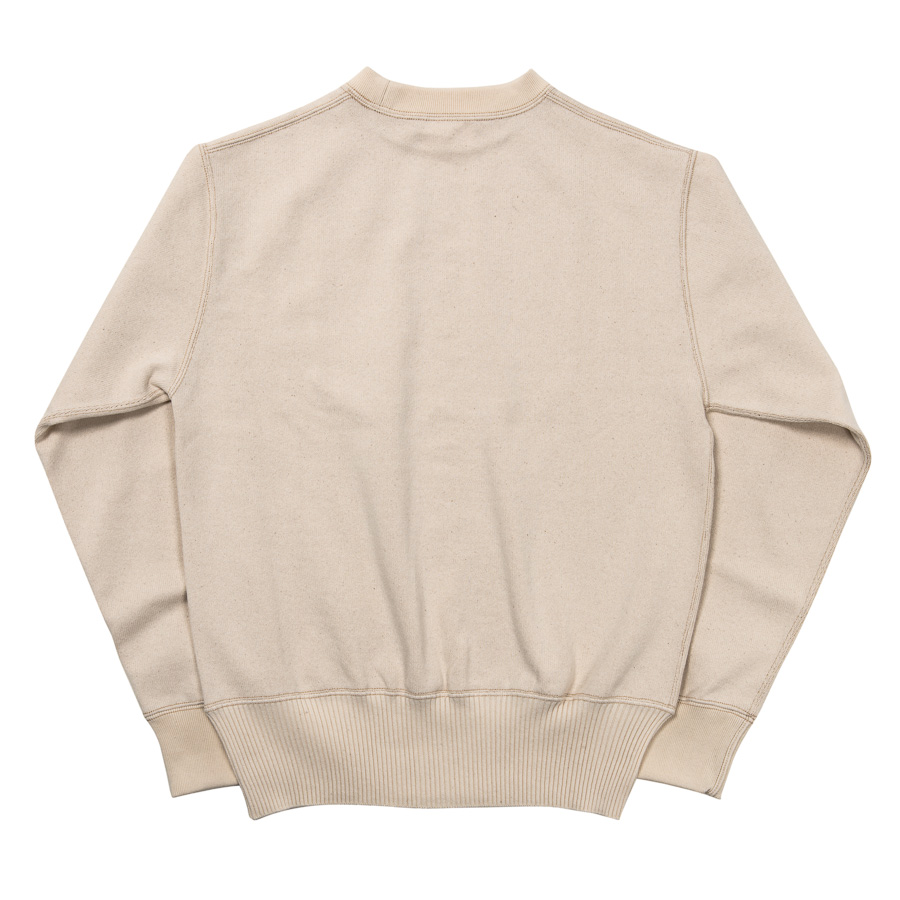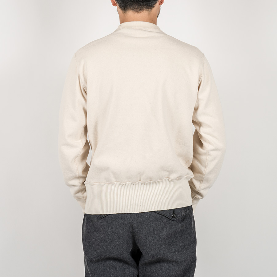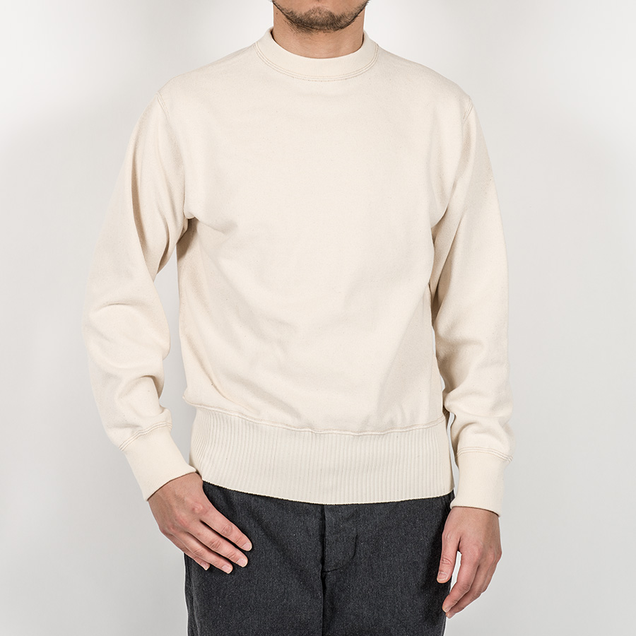 裾は針抜き、袖口と襟は通常のフライスと編み目を変えています。これを縫い合わせることで、かなりセーターに近い雰囲気に。もともと、古着のUSNセーター自体、身頃・襟・袖口(場合によっては裾)と別々に作った部品を縫い合わせて作る「ニットソー」がほとんど。そのため、今回のようにコットンでカットソーで作ってもかなり近い風合いに成っています。シャツの上はもちろん、コットンなのでチクチクしないのでTシャツの上に1枚でも着て頂けます。