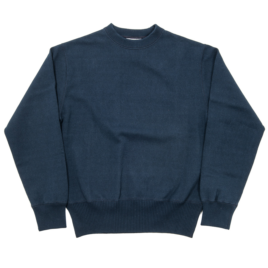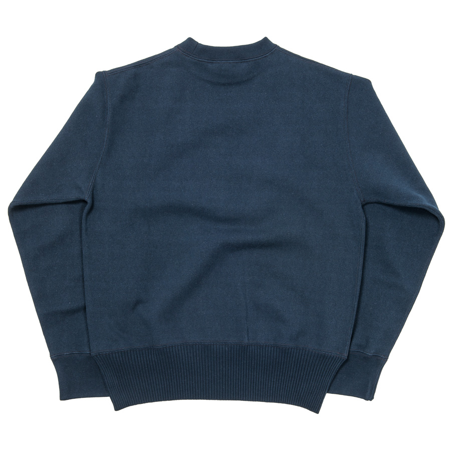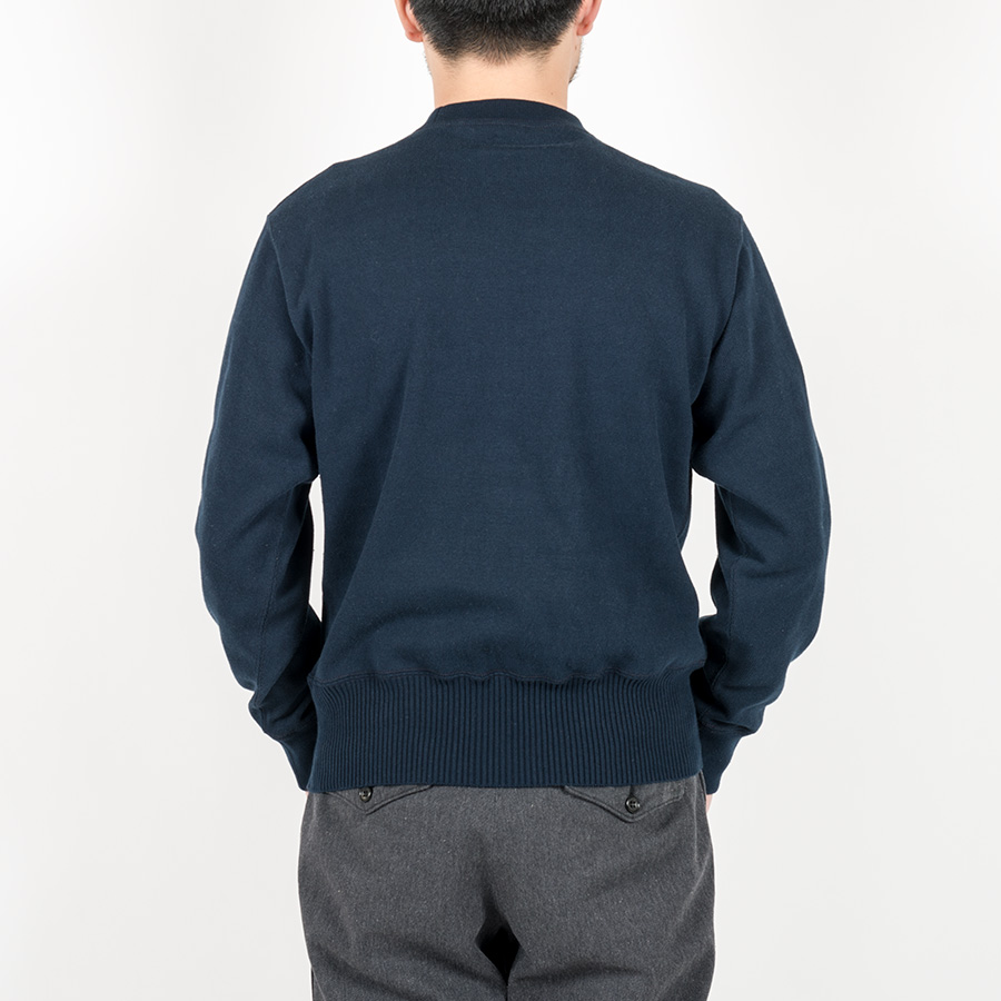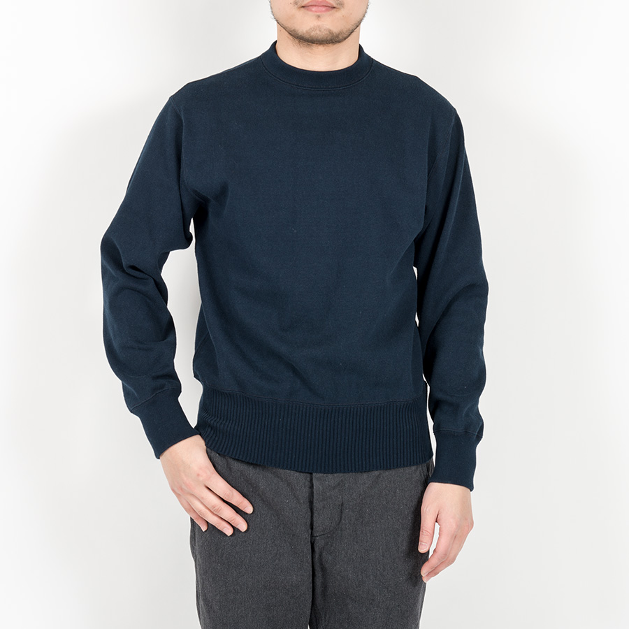 裾は針抜き、袖口と襟は通常のフライスと編み目を変えています。これを縫い合わせることで、かなりセーターに近い雰囲気に。もともと、古着のUSNセーター自体、身頃・襟・袖口(場合によっては裾)と別々に作った部品を縫い合わせて作る「ニットソー」がほとんど。そのため、今回のようにコットンでカットソーで作ってもかなり近い風合いに成っています。シャツの上はもちろん、コットンなのでチクチクしないのでTシャツの上に1枚でも着て頂けます。