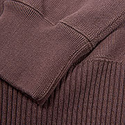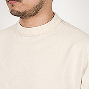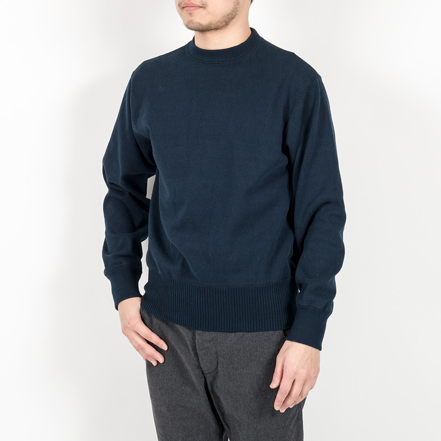 昨年来、好評の極厚「セーター風カットソー」のCrew Neckバージョン。モックネックは暖かい、でも首回りの締め付けを嫌う向きもあります。そこで、首回りを通常のクルーネックに。当初は、横編みの針抜きリブをつけてみたりもしたのですが、テンションが足らない。という事で、テンションが強いフライス(リブ)にして、さらに寸法調節。つまり過ぎない、でもゆるゆるで首が伸びてもしまわない。素材に合わせて、バランスの良い寸法を目指しています。