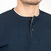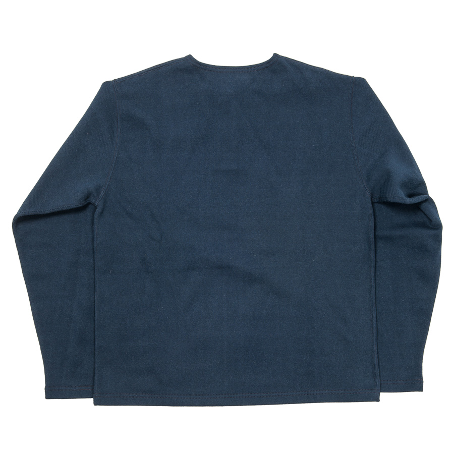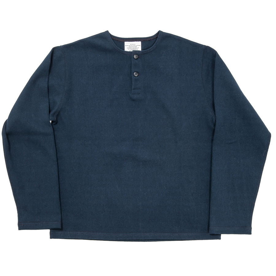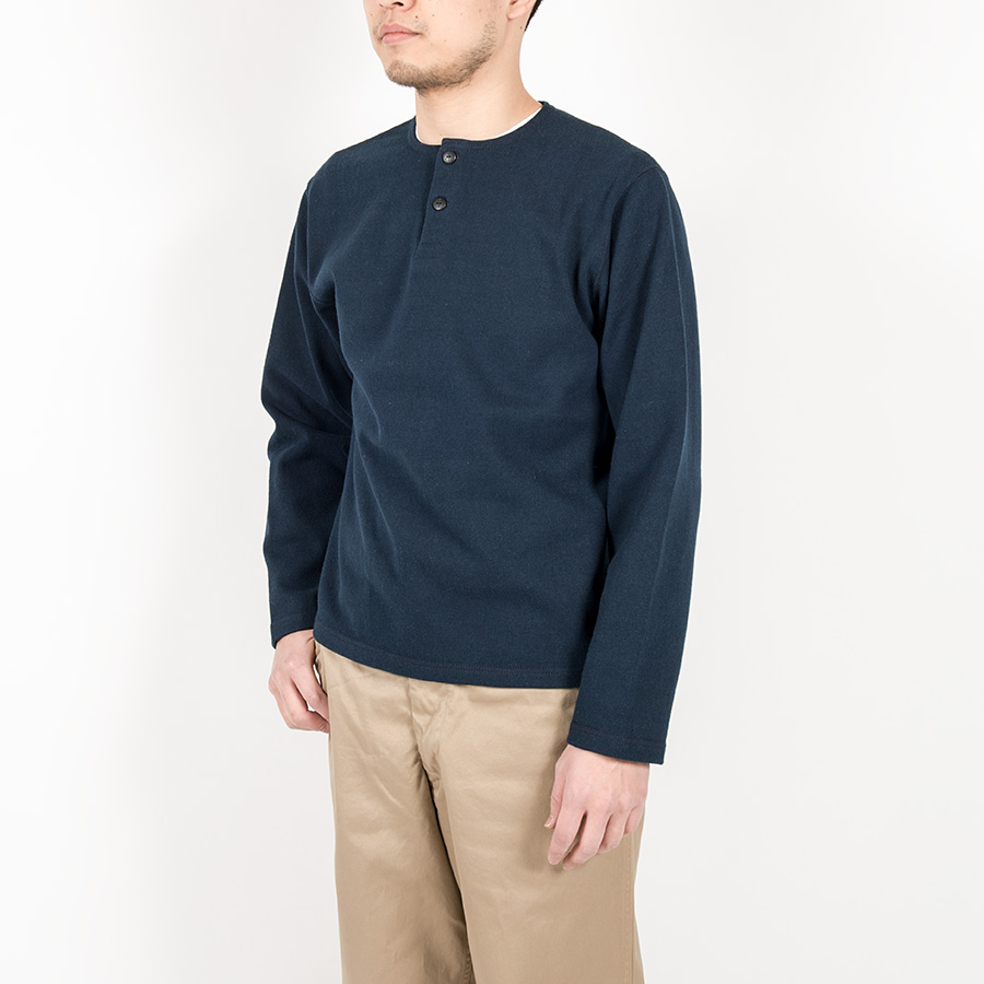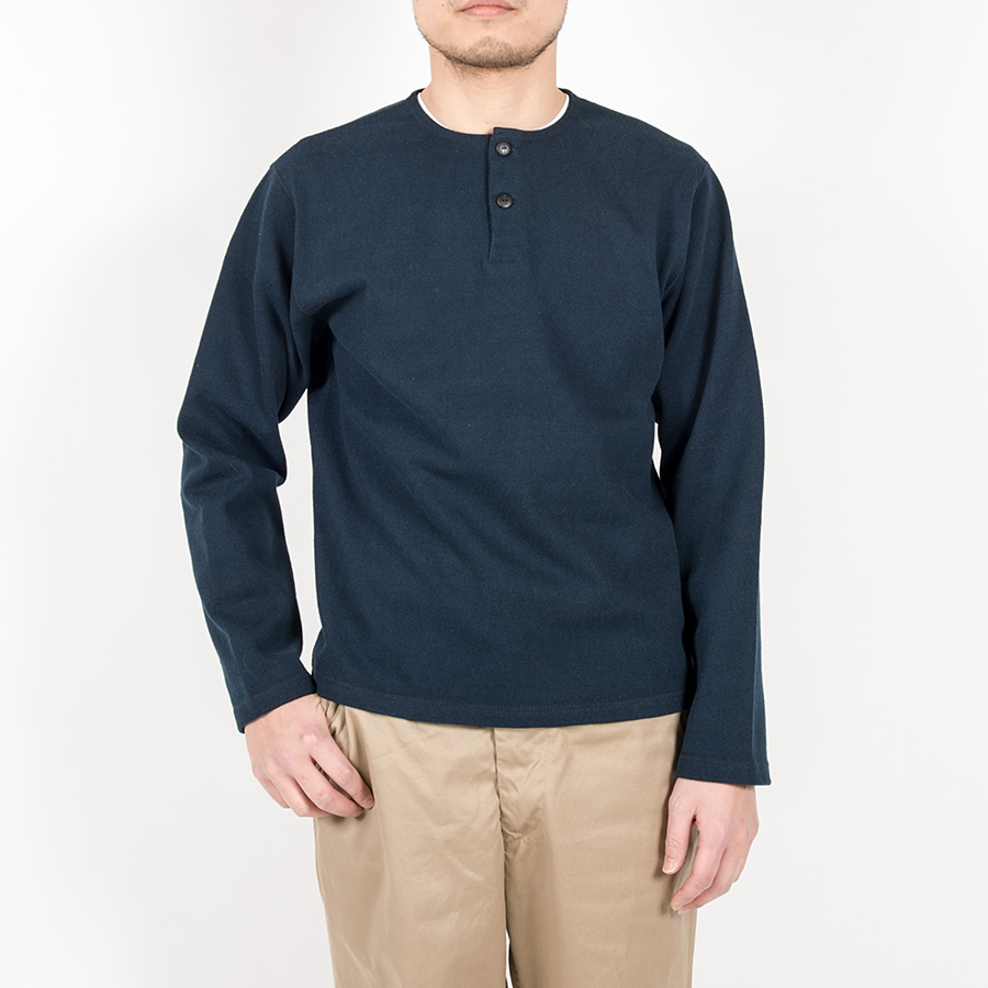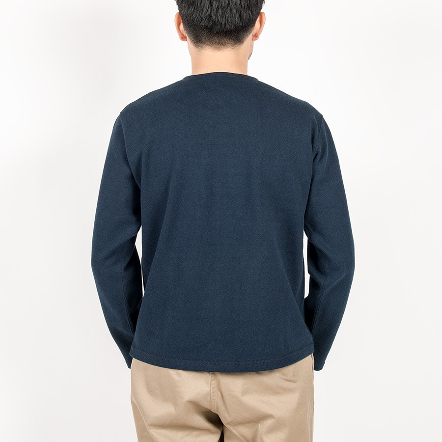 ボタンは別注でブラックは水牛、ホワイトはコロゾ(ヤシ)に碇刻印入り。ヘンリーはリブよりもずどんと落ちているイメージなので、袖口・裾はリブ無し。
