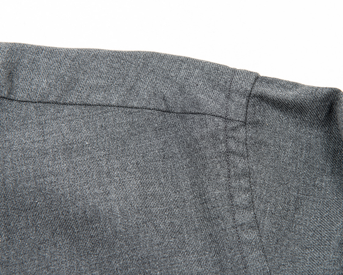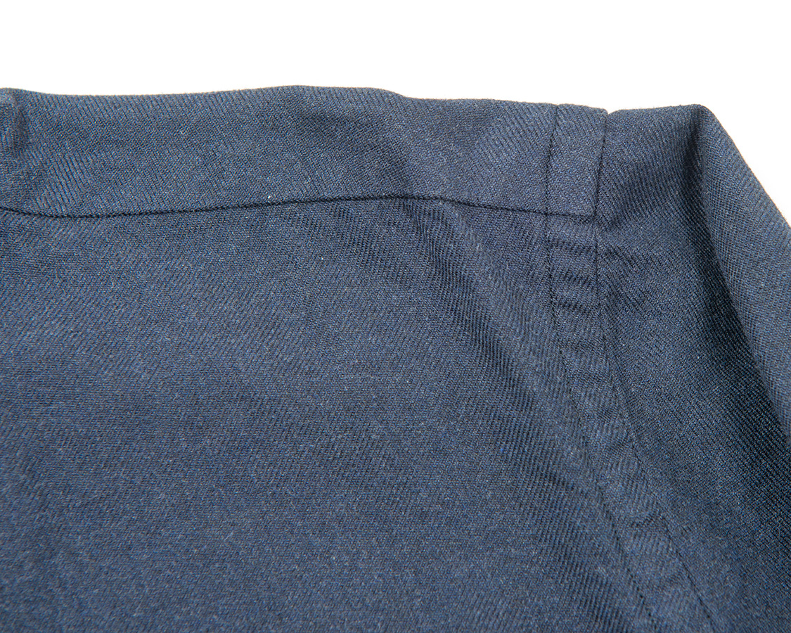 ステッチが無いので、よりドレスウェア的に見えるヨーク。押さえていないので、若干ヨークが動きやすいのもポイント。ワークシャツであれば、どこもかしこもステッチで固めてしまう。逆にリゾート的なシャツ(オープンカラーとか)だと見返しが止めていなかったり、カフスも1本のステッチで止めていたり、動きやすい仕様。