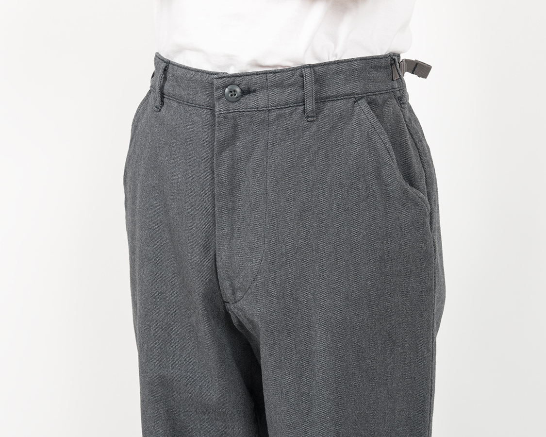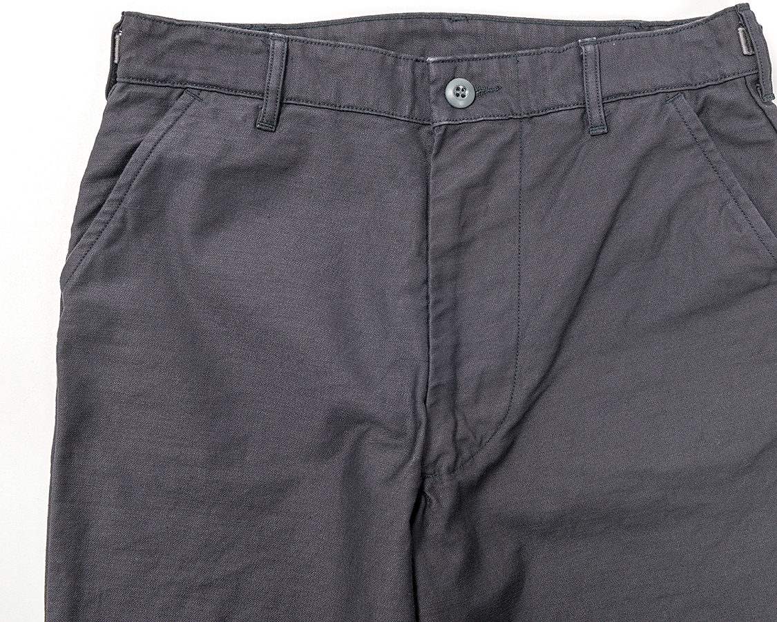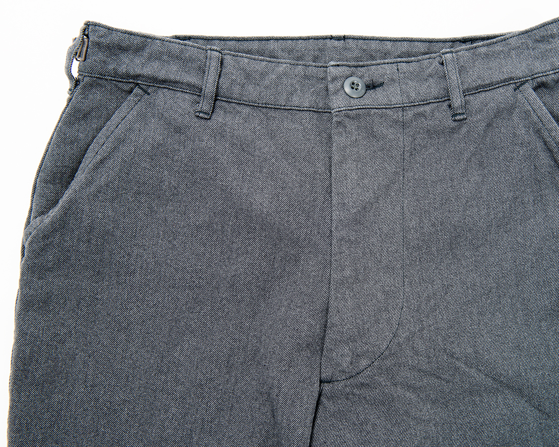 リバースドサテン、いわゆるバックサテン。ベーカーパンツの生地を元に作ったもので、オリーブは特に軍パンっぽい。一方、グレーのサージは同じデザインでもかなりシックに。よりドレスウェアというか、アメリカンクラシックで良くあるトラウザーズに近い雰囲気。