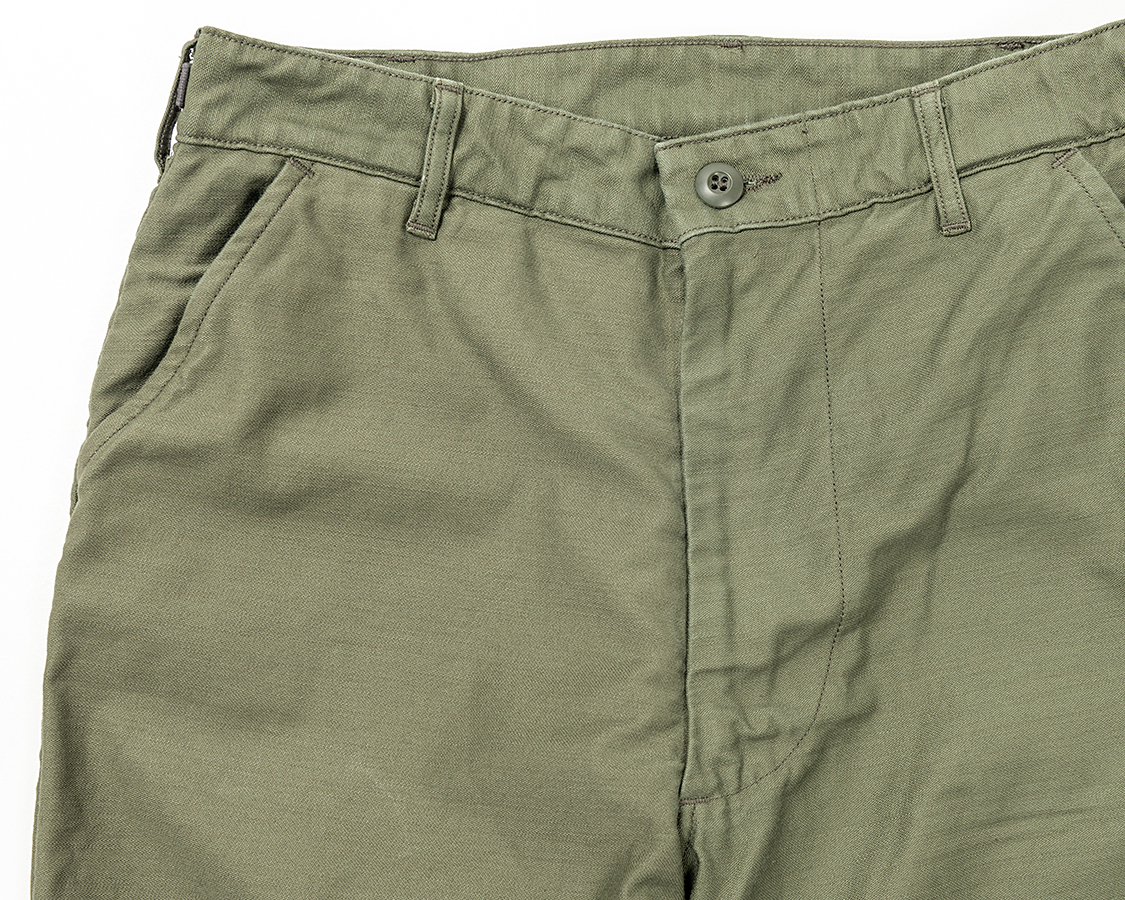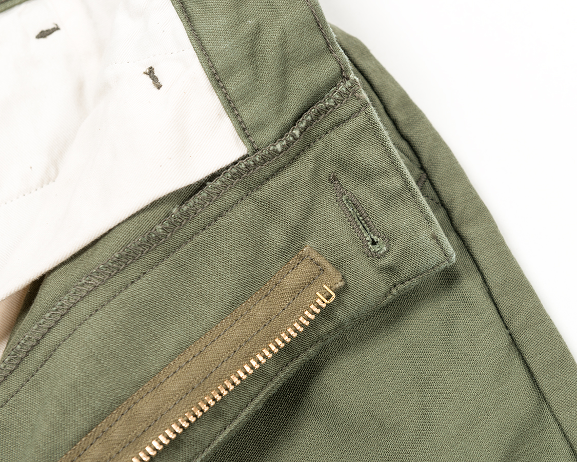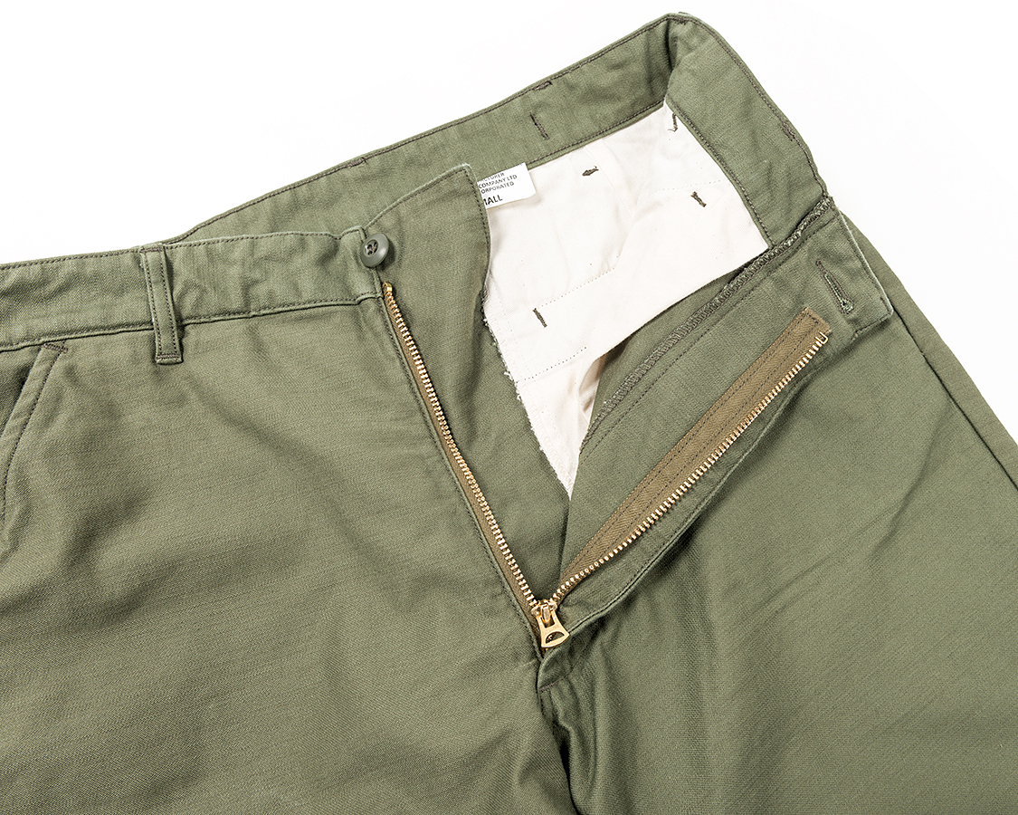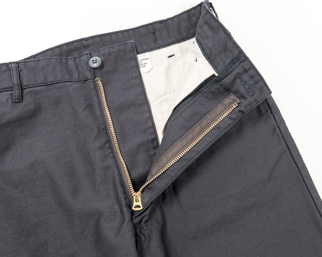 リバースドサテン、いわゆるバックサテン。ベーカーパンツの生地を元に作ったもので、オリーブは特に軍パンっぽい。一方、グレーのサージは同じデザインでもかなりシックに。よりドレスウェアというか、アメリカンクラシックで良くあるトラウザーズに近い雰囲気。