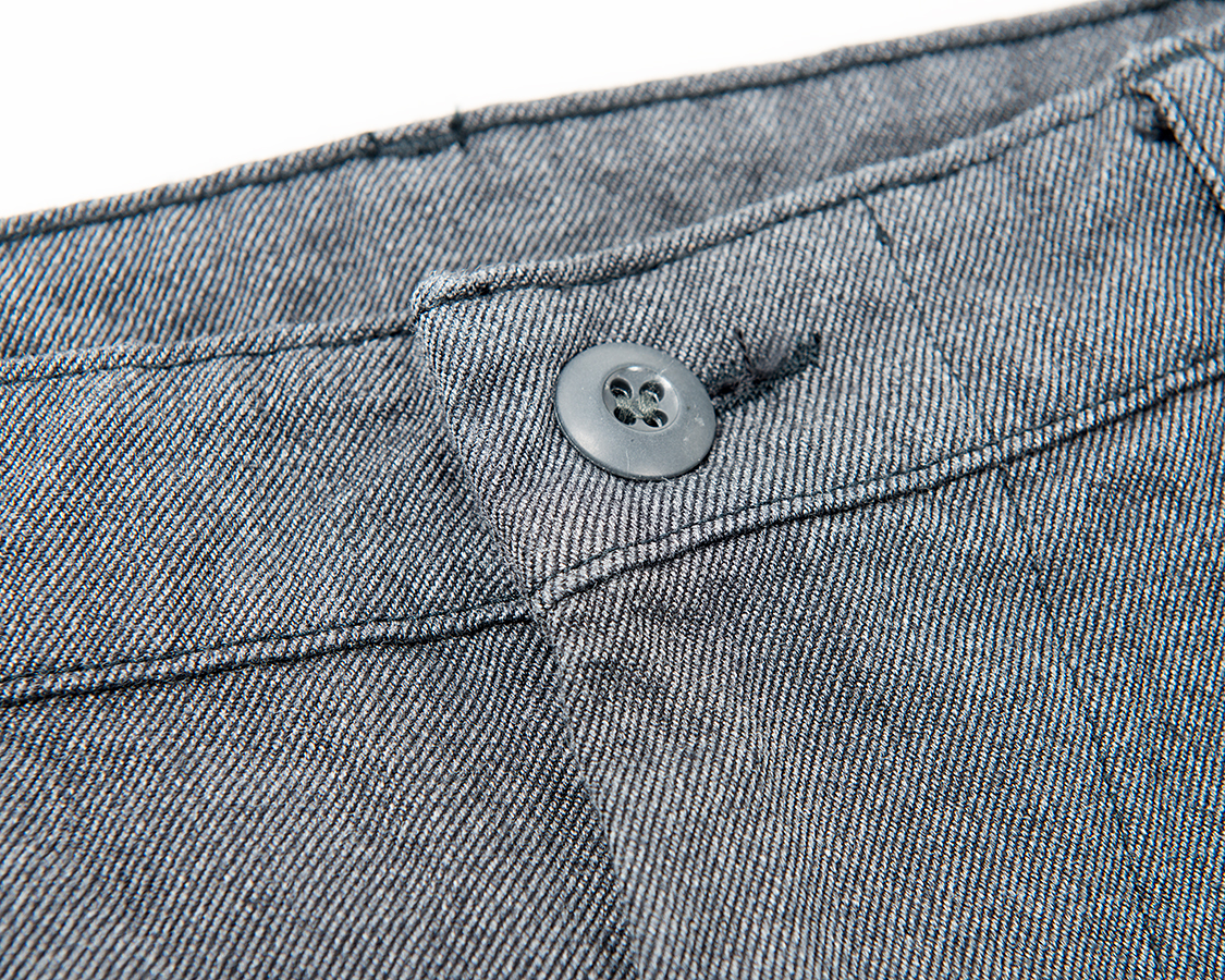 フロントはななめ切り替えポケット。コインポケットは無しで、ここだけ見るといわゆる「トラウザーズ」のデザインだが素材による雰囲気の違いがよくります。