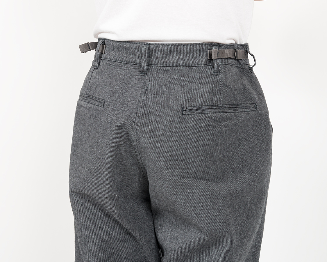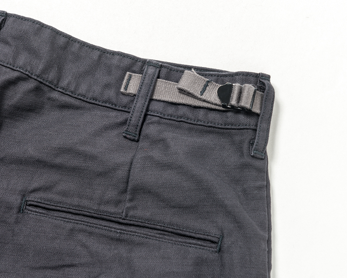 この手のバックルは、テープの厚み・表面のざらつき具合と金具の隙間、これが上手く合っていないと滑ってしまいますが、FWP Trousersで使った組み合わせは実績あり、ばっちりです。
