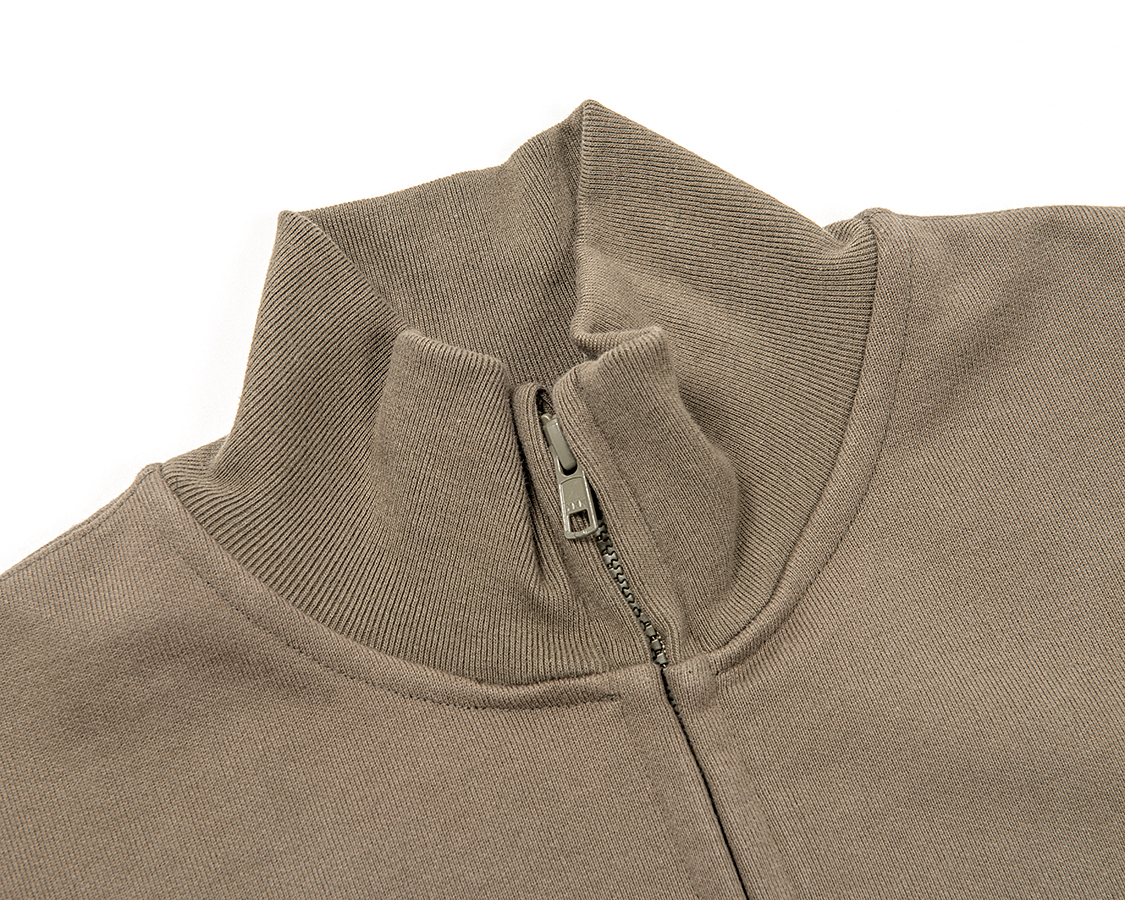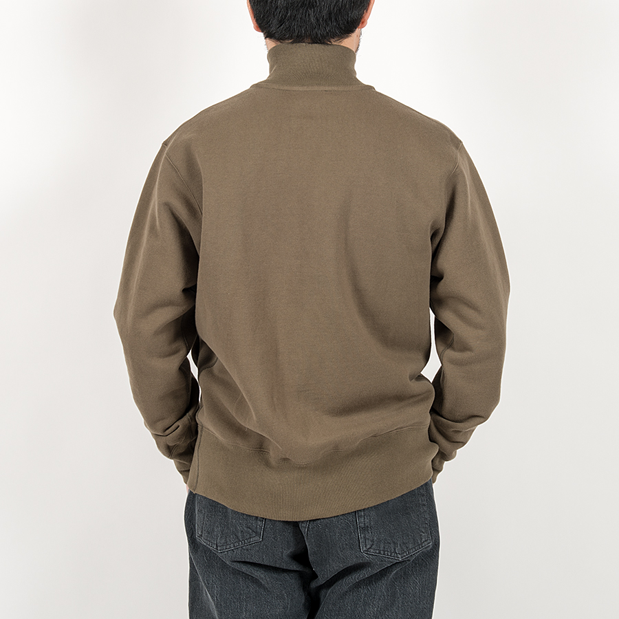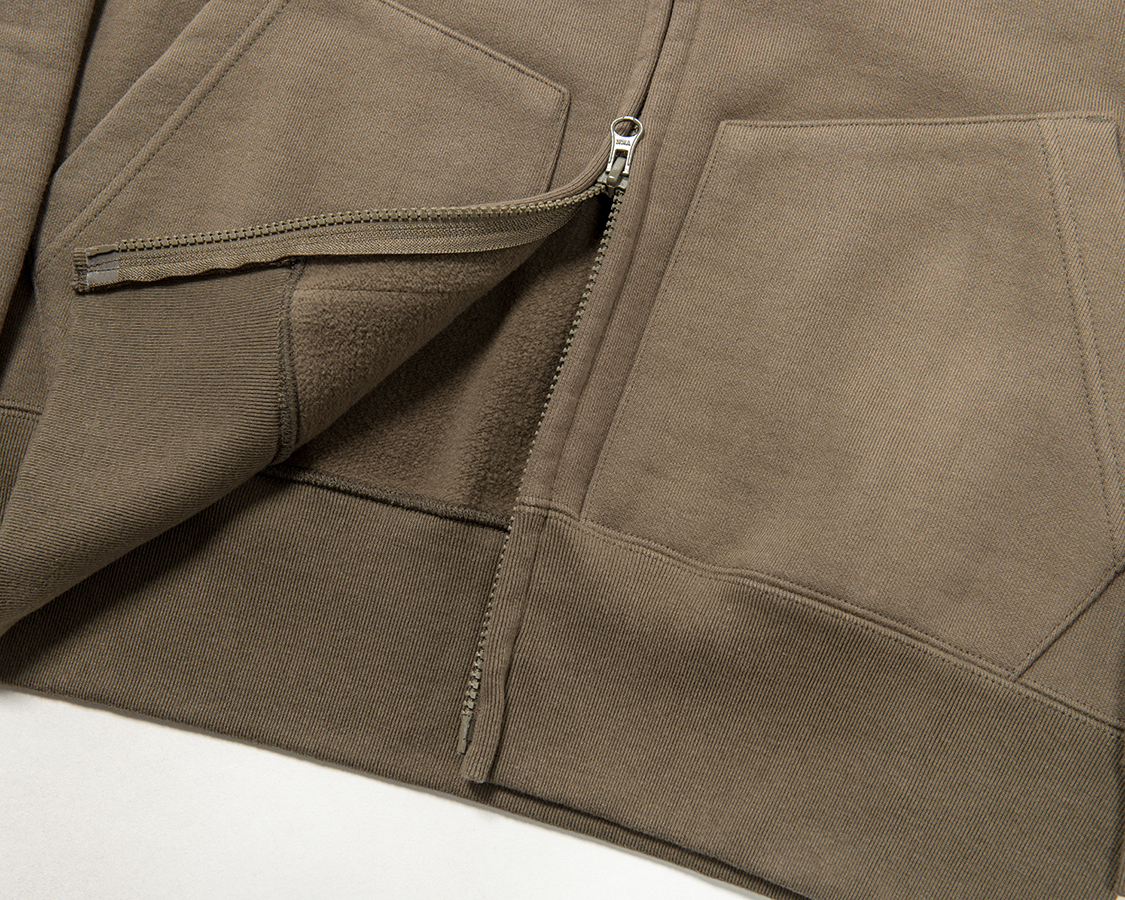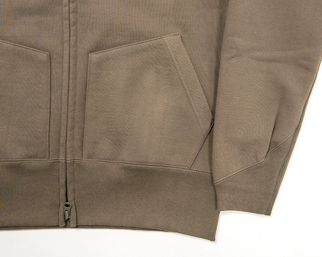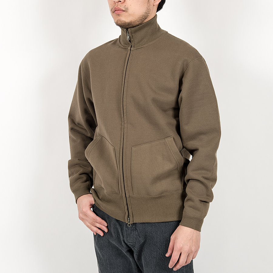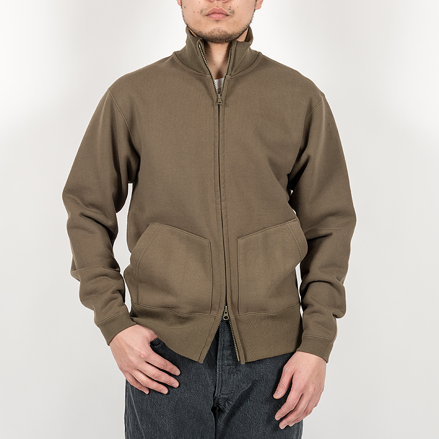 16FWで作った15オンスクラス、裏起毛のスウェットシリーズ。丸首・パーカーともに着てみて暖かさに満足。その生地を使って、スタンドカラー・フロントジップの実用的なブルゾンを作りました。