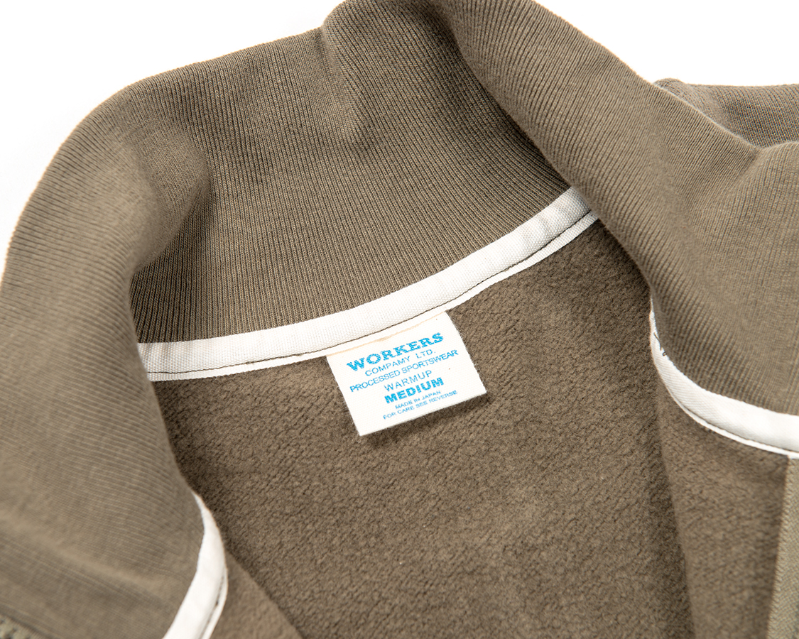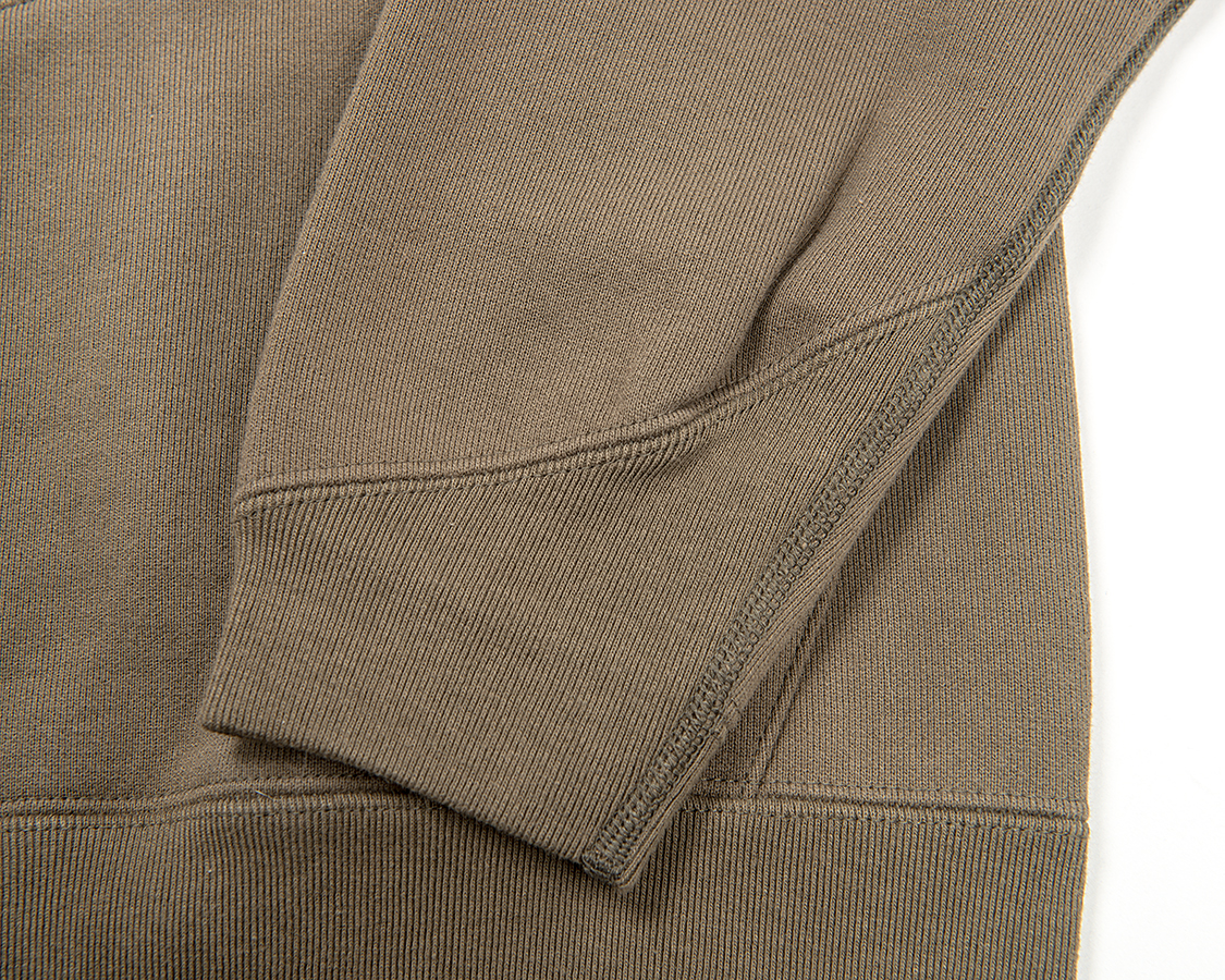 ただ、作るのに難しい部分もあります。首周りとフロントジッパーの交差部分、ここがライト裏毛のような厚みの無い生地ならば始末も楽なのですが、ヘビー裏毛だと難しい。ゆっくりでないと縫えない&素材もこれでもかと分厚い生地を作ったので製品としては高価になりましたが、その価値はある一枚になっていると思います。 |
