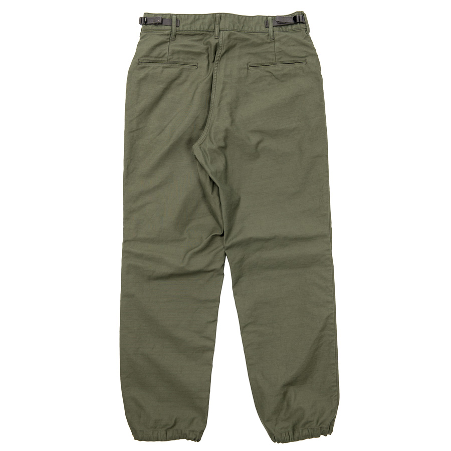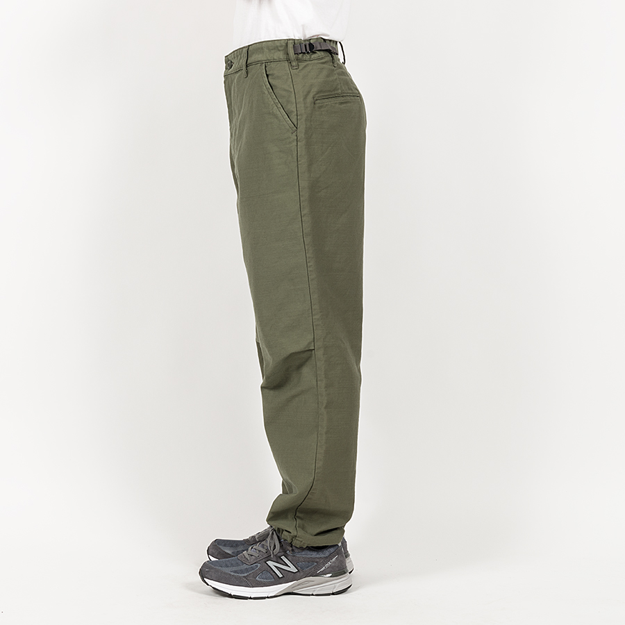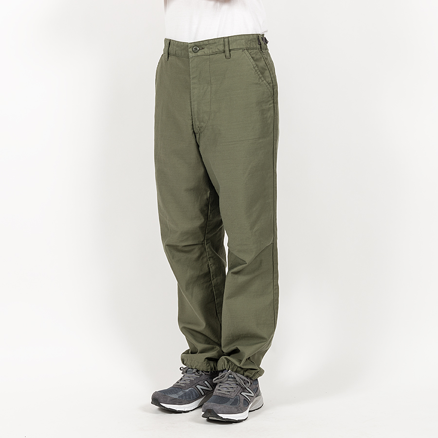 軍パン独特の楽なゆったりしたシルエット。膝のタックが立体的なシルエットを作っています。裾の紐(スピンドル)も