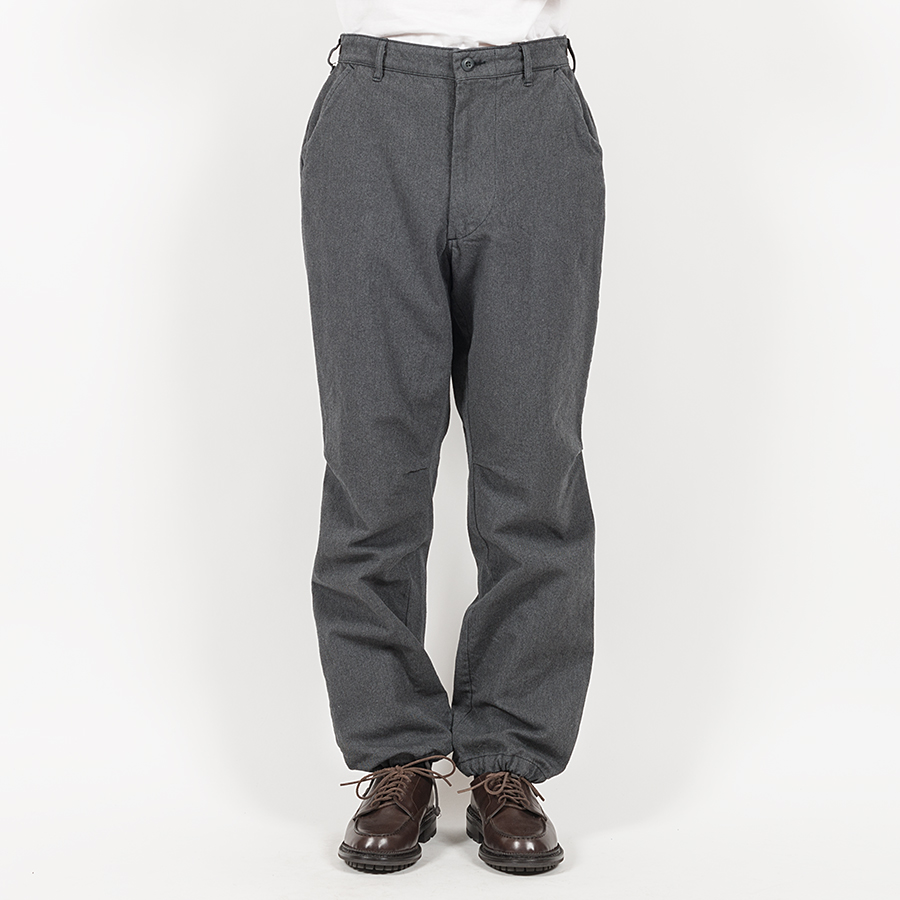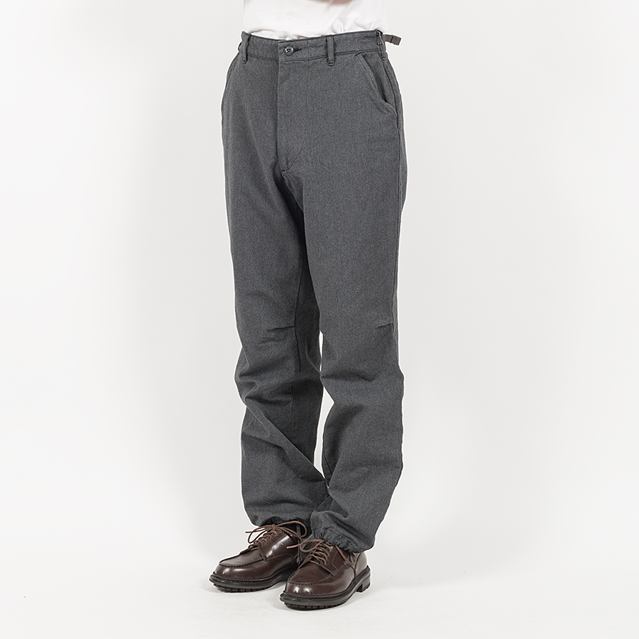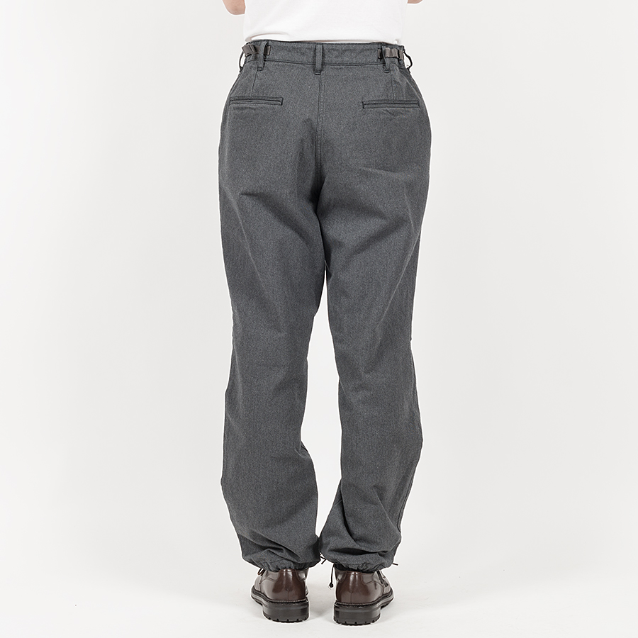 軍パン独特の楽なゆったりしたシルエット。膝のタックが立体的なシルエットを作っています。裾の紐(スピンドル)も