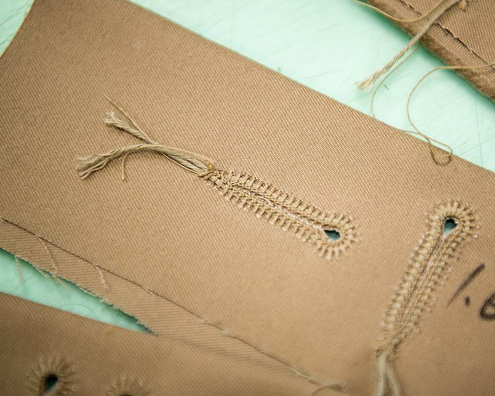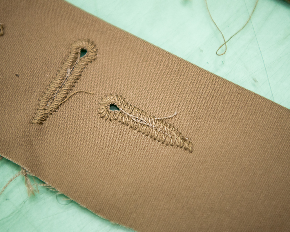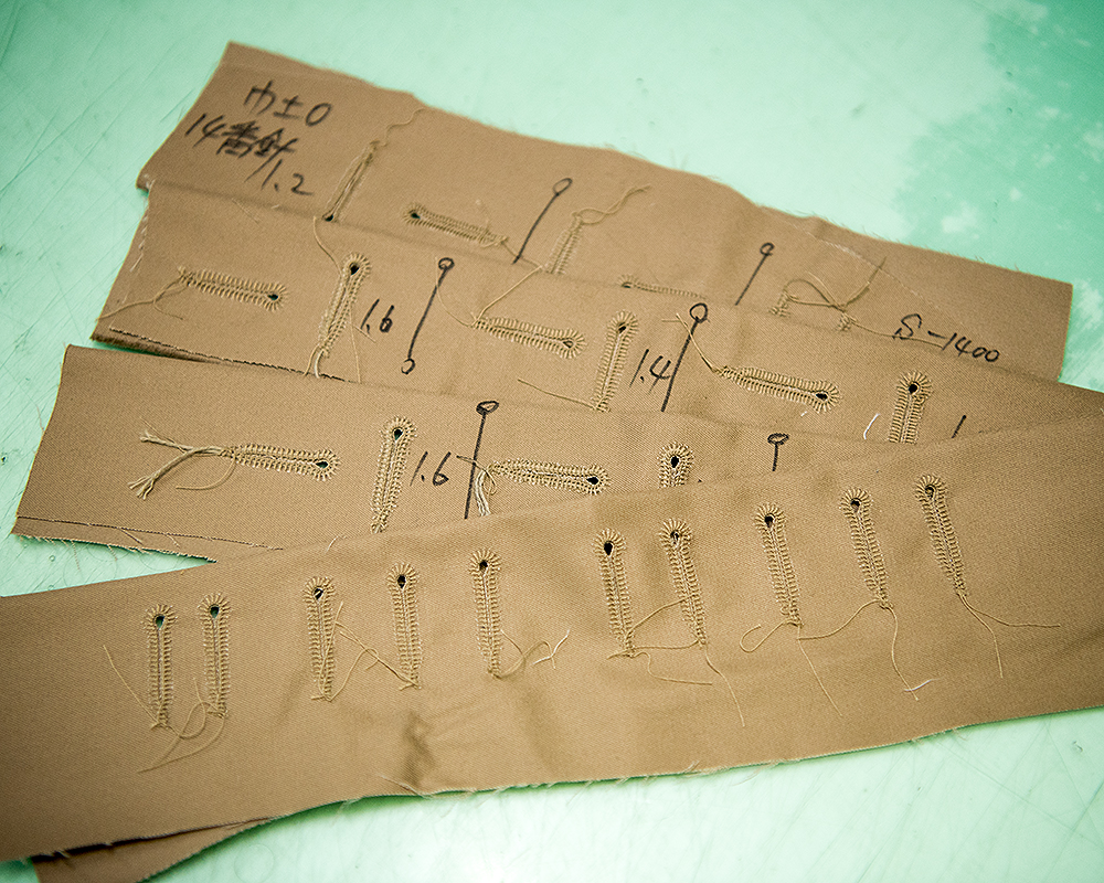 高密度すぎるので、どうしても縫いながら糸を切っています。ボタンホール部分が特に顕著。その為、表から見える側のホールを本来であれば裏目(チェーンが見えない)側を使います。
