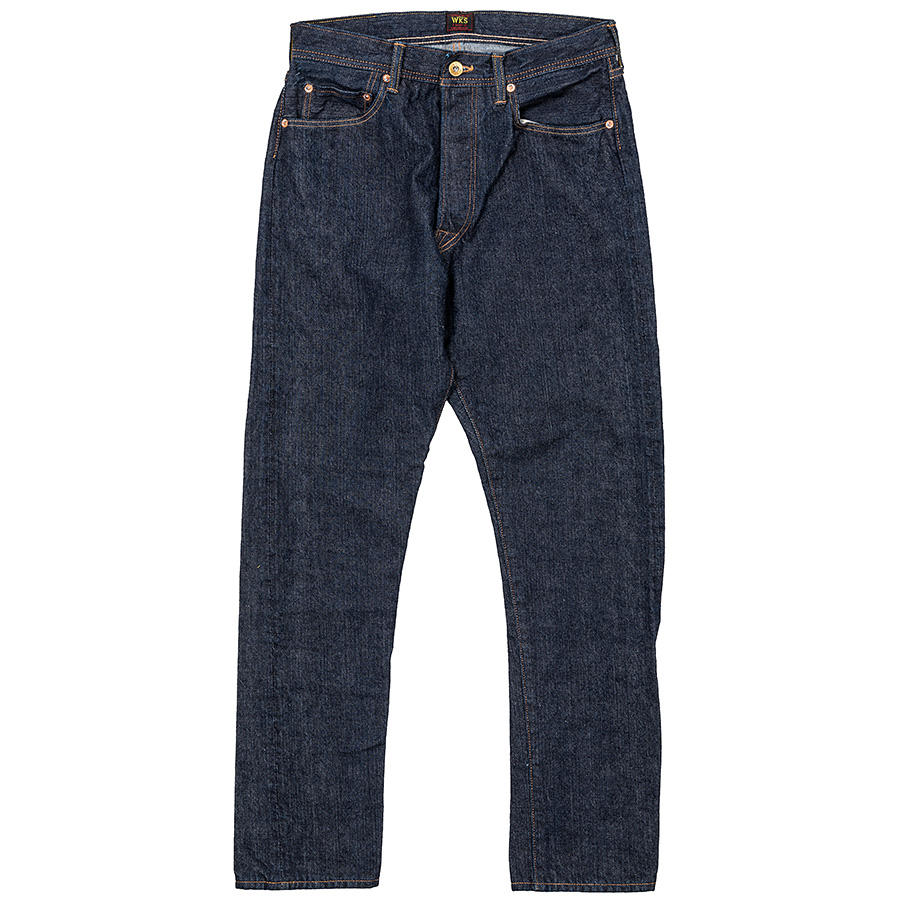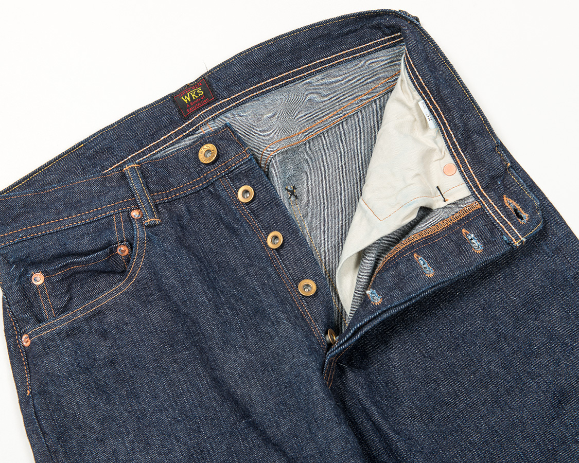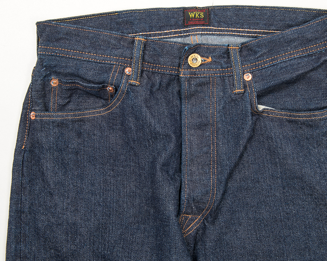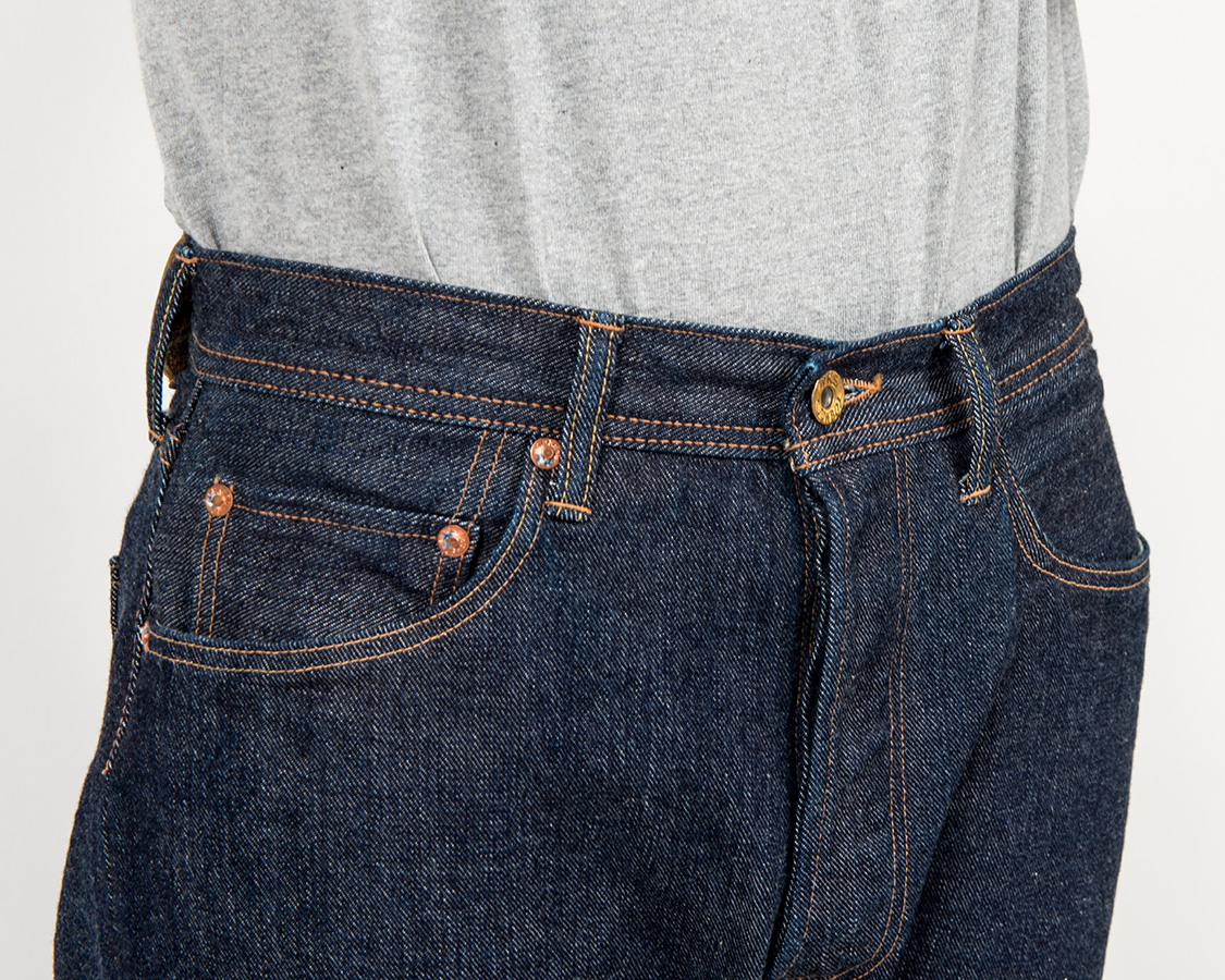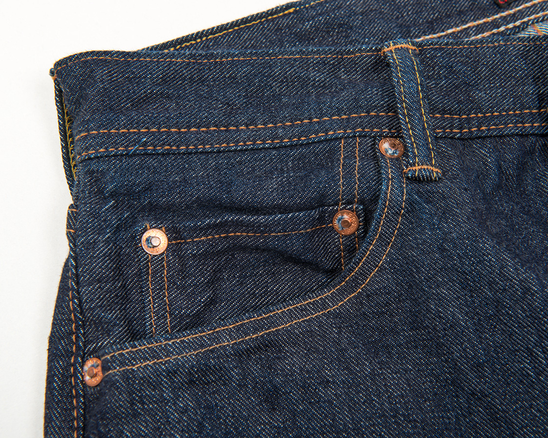 フロント。帯付けがダブルステッチでカンザスなワークウェアの名残を残します。でもポケットはサンフランシスコ的で、そこに打ち抜きリベットを叩き潰す。サンフランシスコで、まだワークウェアとして作られたいた時代の仕様を取り入れています。