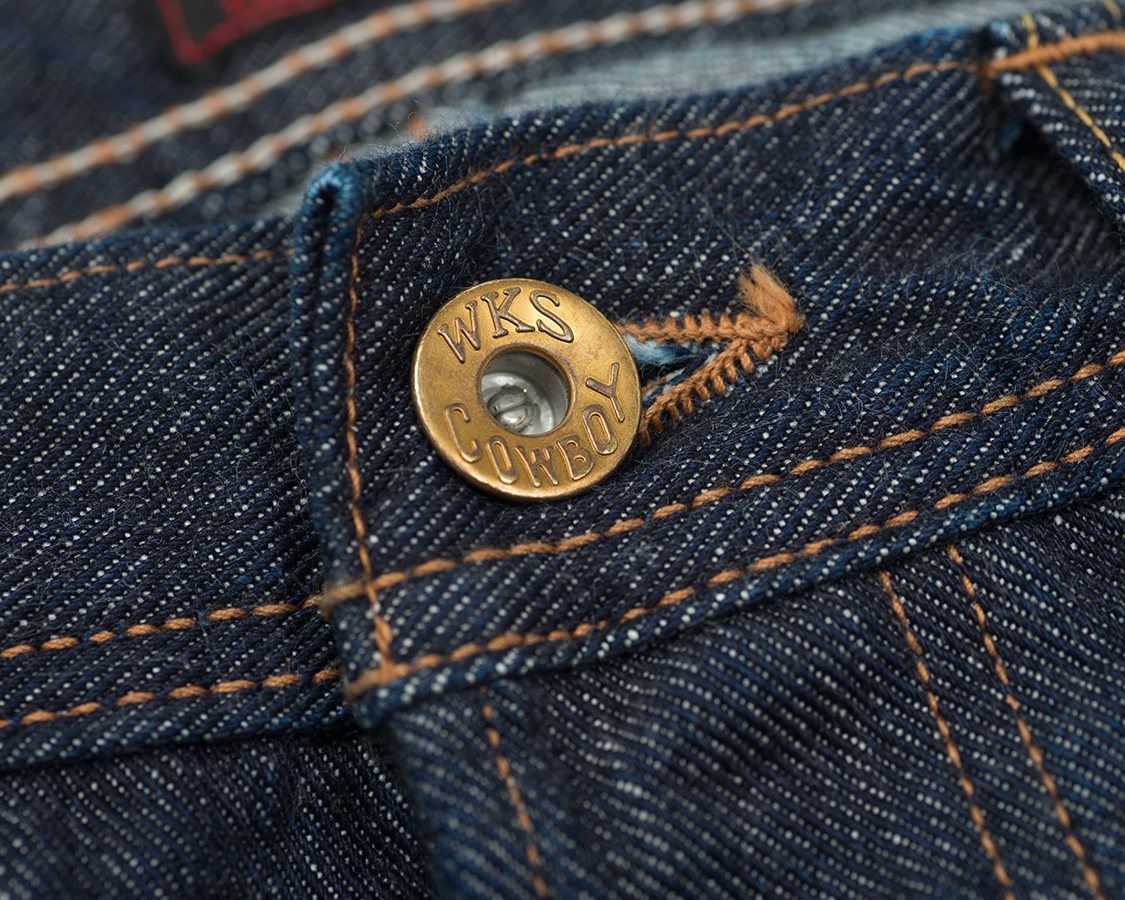 ボタンは二本爪のドーナツに左綾生地にぴったり、カウボーイボタン。このくすんだメッキが気に入っています。